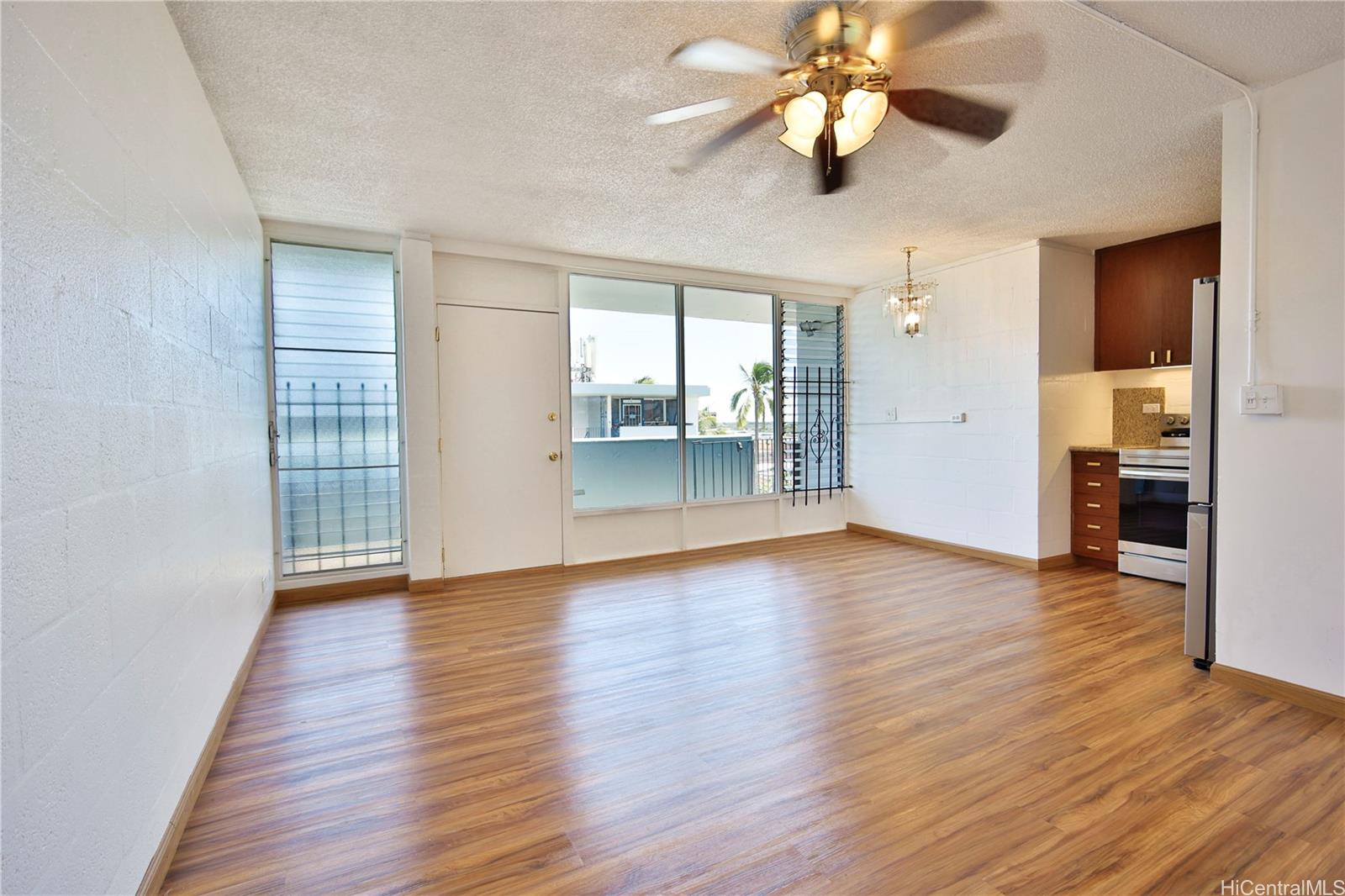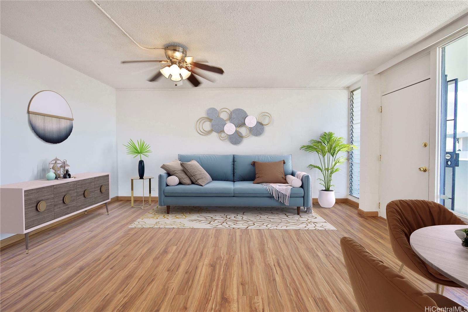 Bright and cool 2 Bedroom, 1 Bath unit situated on top floor with no unit above, remodeled kitchen with granite counter tops, new appliances, totally remodeled bathroom and new vinyl plank flooring throughout. One assigned open parking stall is located nearby at rear of building and 3 guest stalls at center of project. Monthly maintenance fee includes electricity, water, sewer and common areas. Private, gated front lanai entry for exclusive use. Photo Voltaic panels on roof assist with keeping utility costs lower.