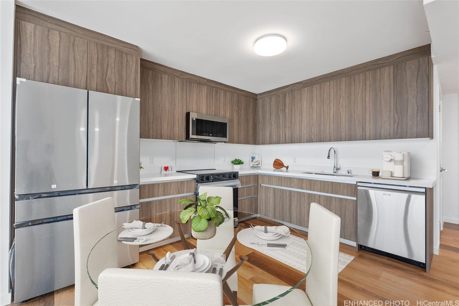 BRAND NEW LISTING!! Liona 3607 at The Park on Keeaumoku offers a stunning one-bedroom residence with a private lanai - Diamond Head view and sunrise, perfect for enjoying Honolulu's urban landscape. This unit features an open-concept living area with luxury vinyl plank flooring and floor-to-ceiling windows that maximize natural light and views. The kitchen is designed with quartz countertops, modern plumbing fixtures, and sleek stainless steel appliances, making it both functional and stylish. The bedroom is a cozy retreat with carpeted floors for comfort, while the bathroom is equipped with quartz countertops, modern fixtures, and LED medicine cabinets. A quiet, energy-efficient split AC system ensures a comfortable climate throughout the home. The building provides resort-style amenities including an infinity pool, spa, movie theater, fitness center with a sauna and yoga room, and private BBQ pavilions. With 24/7 security, secured covered parking, bike storage, and EV charging stations, this pet-friendly unit is an ideal blend of luxury, convenience, and modern living. Don't miss this great Opportunity!!! A few photos have been virtually staged(enhanced).