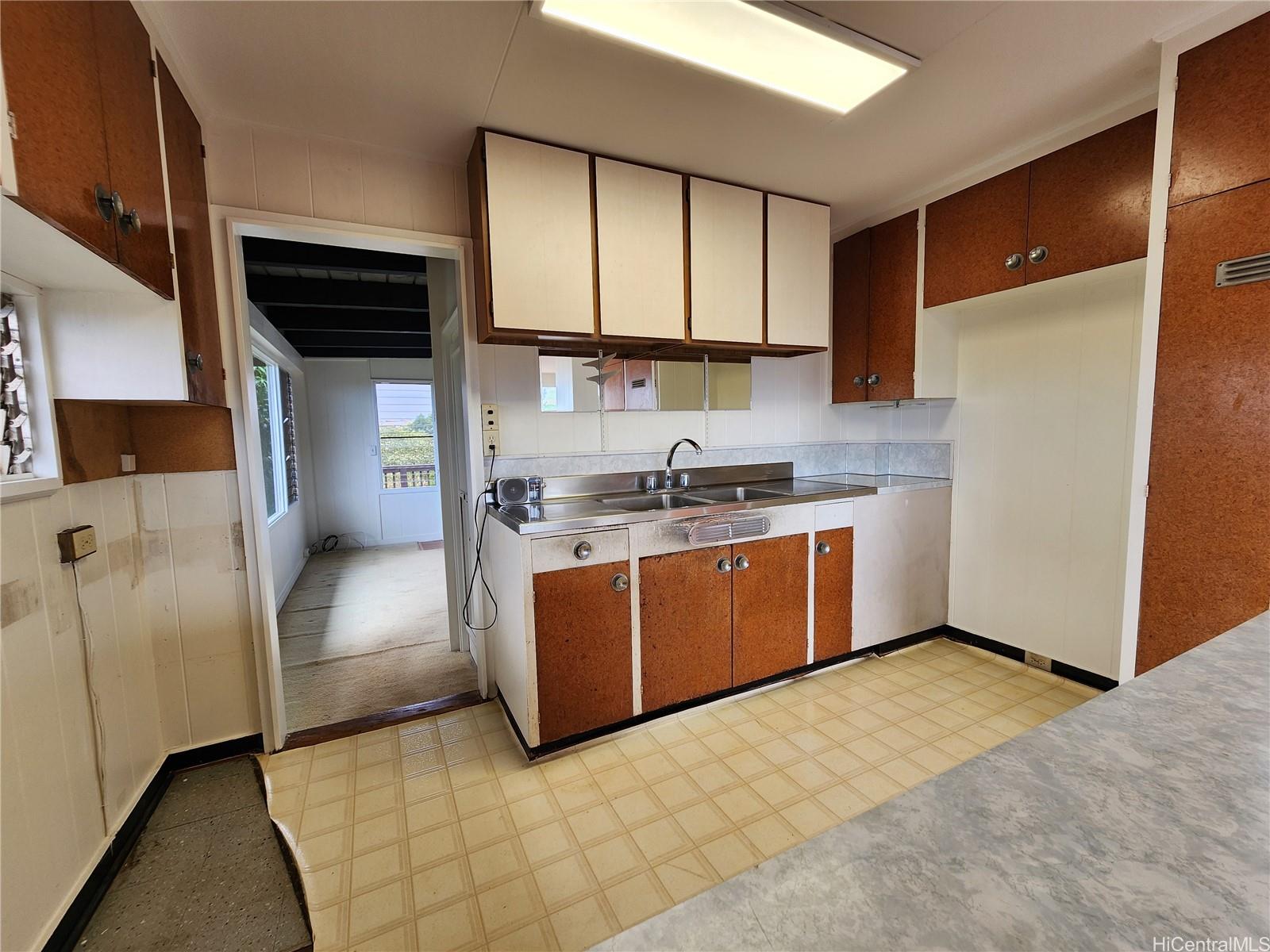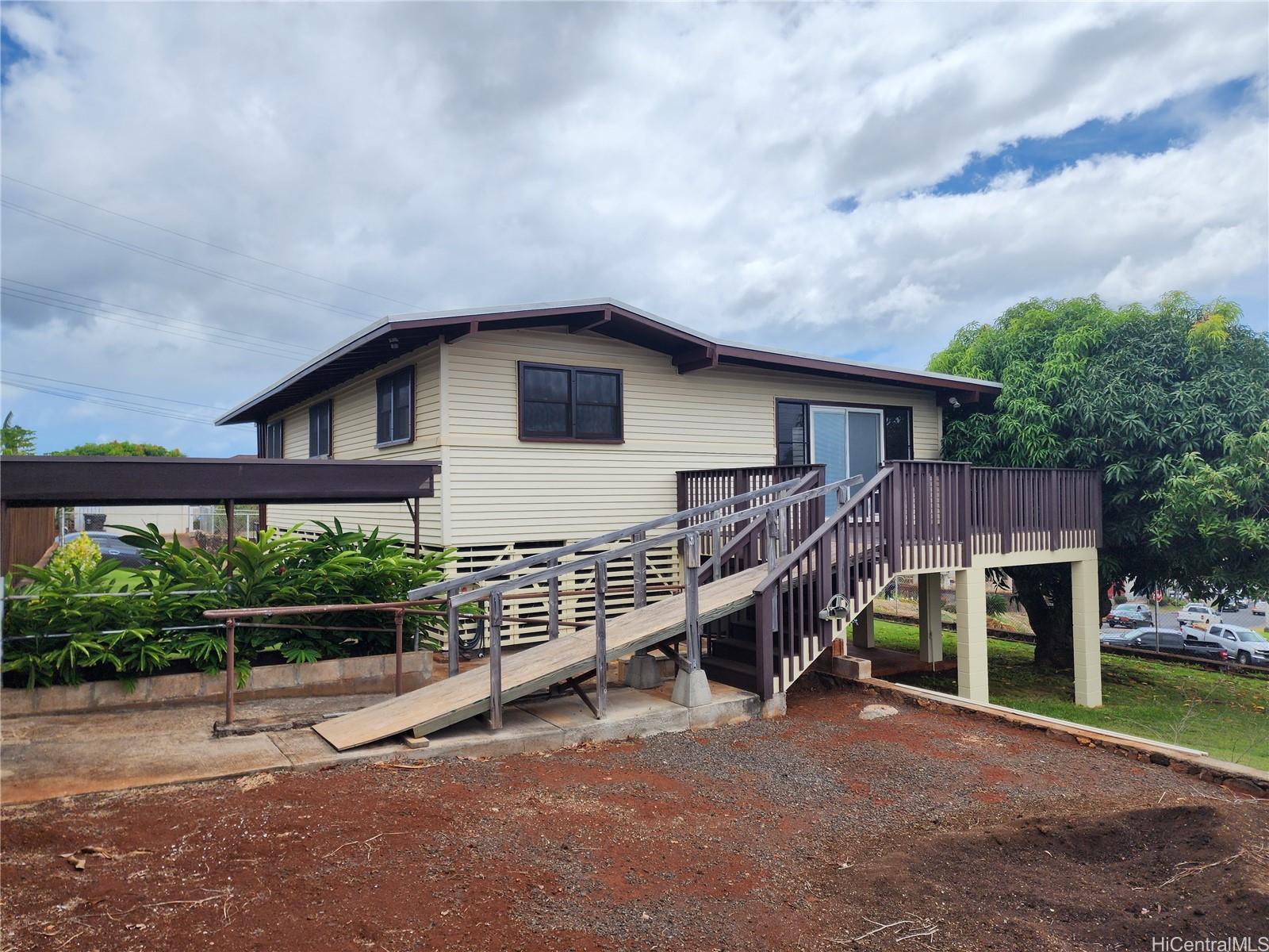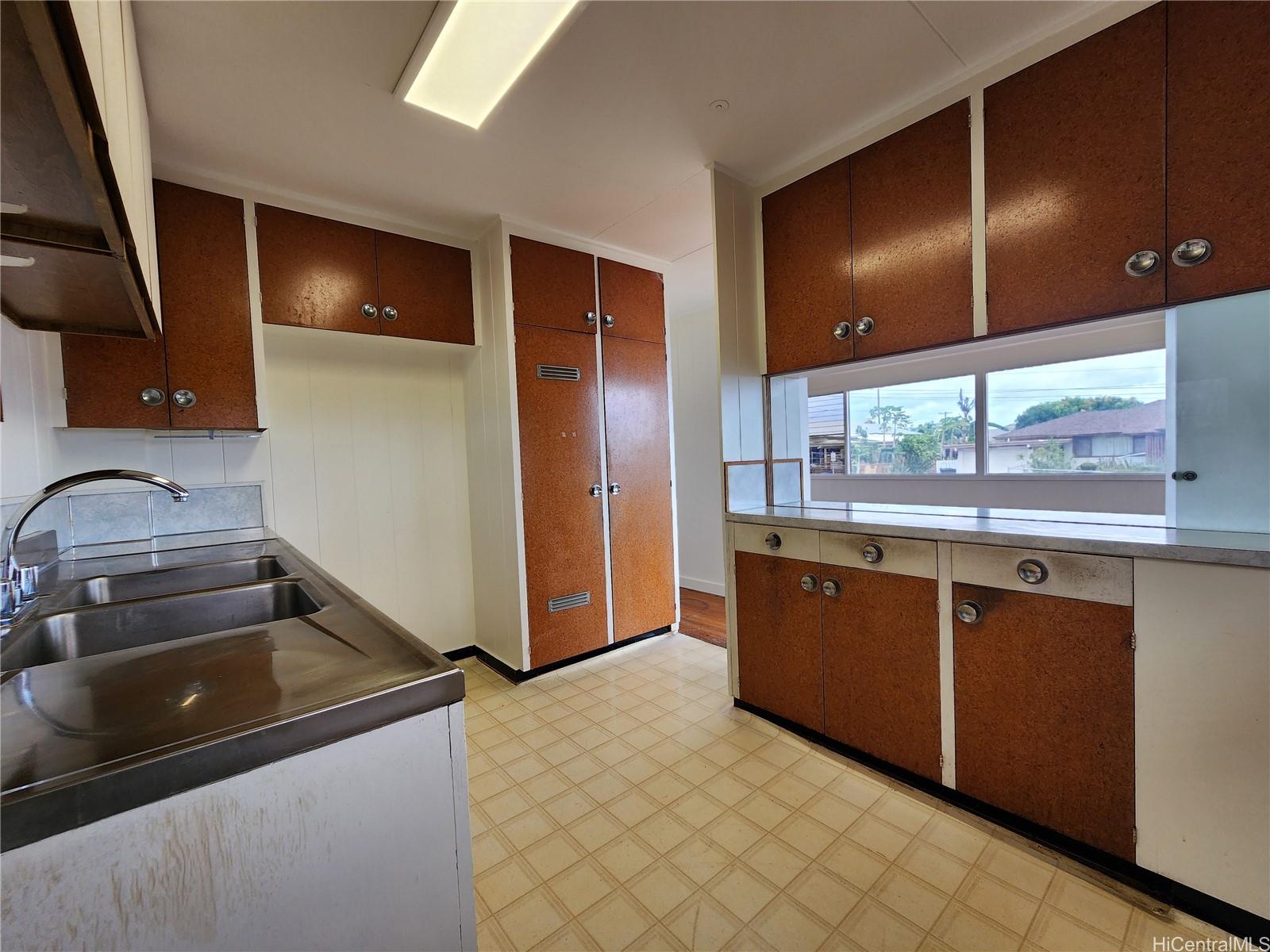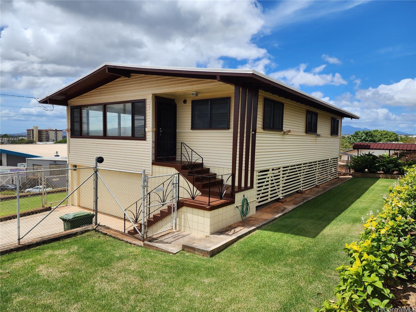 In Pearl City, located overlooking the Pearl City Shopping Center. 3-Bedroom, 1.5-bath house on a corner lot. No neighbor on Makai left-side, has good view of the neighborhood. House has "good bones" and is in good structural condition. House exterior trim and interior has been newly painted and roof has been recently silicone coated. Kitchen is in original condition and has NO appliances - opportunity for Buyer to remodel/renovate to their desire. House interior also needs new floor coverings or the original hardwood floors can be refinished. House built elevated above ground and has a partially enclosed garage, laundry/wash room area with an adjoining toilet and covered patio area on the ground floor. Lots of storage area under house. Property is fully enclosed with walls and fencing. Deck and ramp at rear of house was built without a Building Permit. Property to be sold in "AS-IS" Condition.