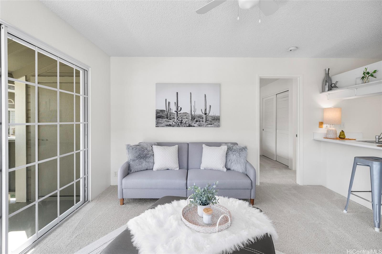 Take advantage of this opportunity to own this 2nd floor 1 bed, 1 bath unit in the desirable Royal Palm at Waipio! This unique townhouse unit has brand new carpeting throughout and includes a lanai with storage closet, stacked washer/dryer and 1 covered parking! This complex is centrally located near shops, parks and restaurants!