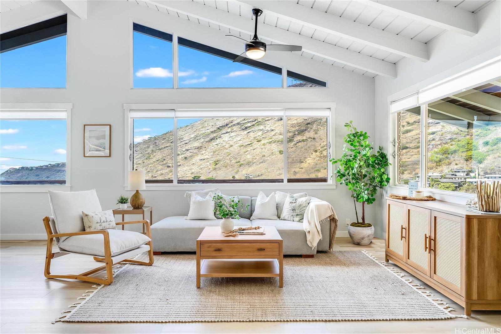 Perched between the mountains and the sea, this newly renovated Aina Haina property is a private retreat designed for active island living. The 3-bedroom, 2-bathroom main home features soaring ceilings, modern upgrades and panoramic ocean views that flow seamlessly to a wraparound lanai, perfect for enjoying your morning coffee or BBQs with friends. The well laid out kitchen is designed for those who love to cook or entertain and flows seamlessly into the open concept dining and living areas. The spacious primary suite includes two closets, a beautifully updated en suite bath and direct access to the deck to take in the serene surroundings. Split A/C's throughout and cool breezes provide year-round comfort.