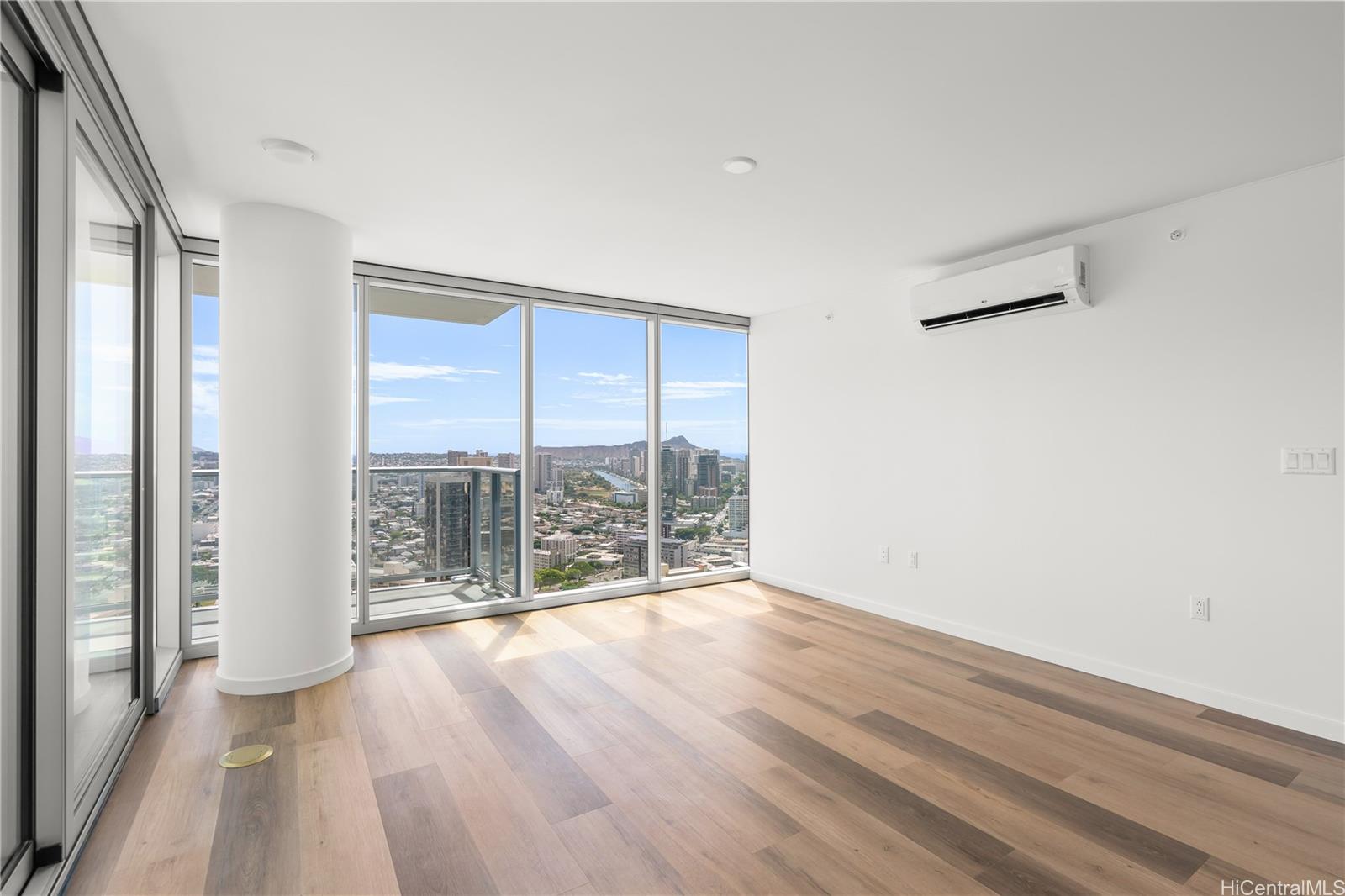 Brand new on the 40th floor! A spacious corner unit featuring 2 bedrooms/2 bathrooms/2 covered parking stalls, offering panoramic views of Diamond Head, the ocean, city skyline, and lush mountains. Enjoy floor-to-ceiling windows, an open layout filled with natural light, quartz countertops, luxury vinyl plank flooring, split AC in every room, a private lanai, and a separate laundry room.