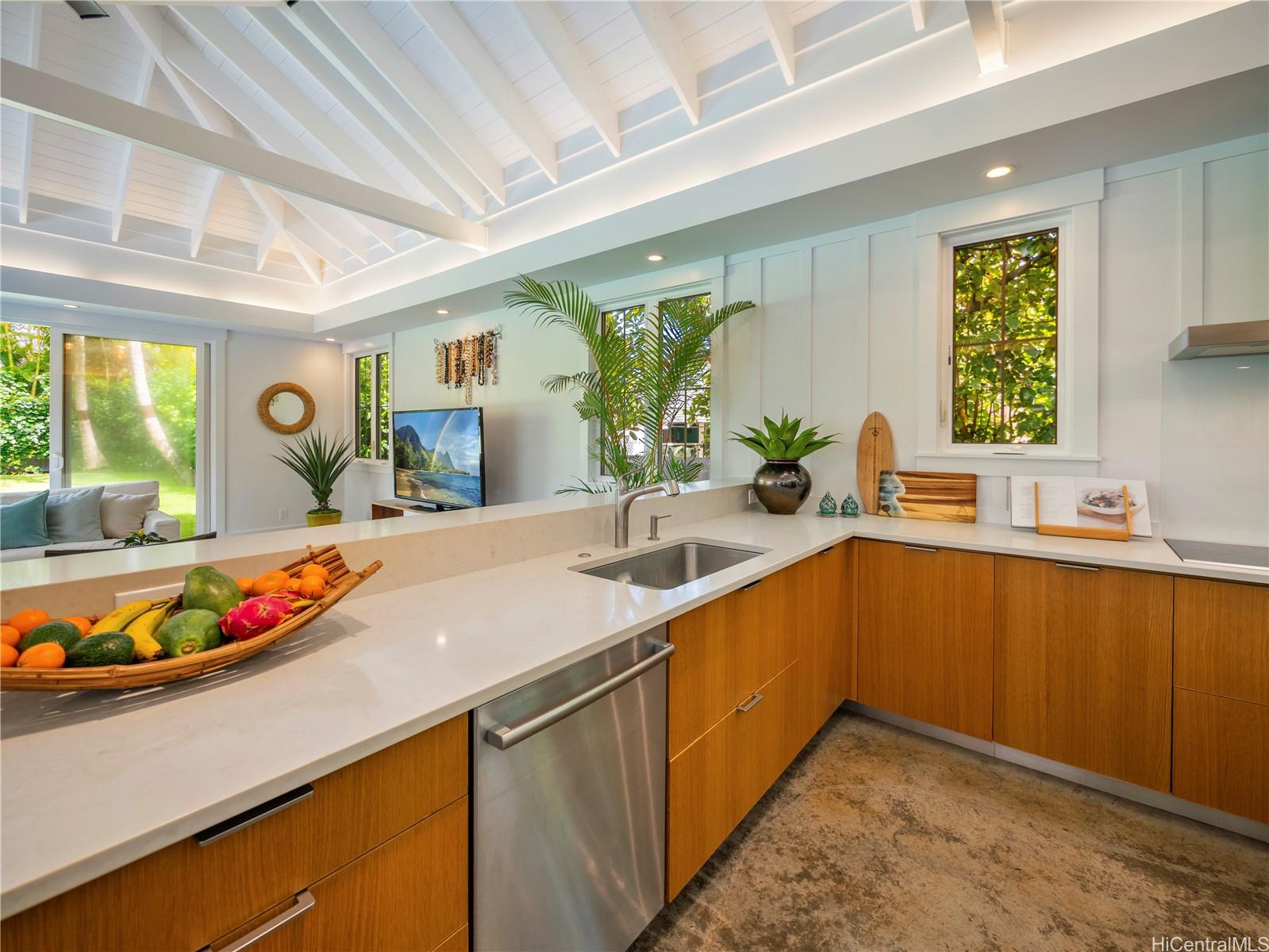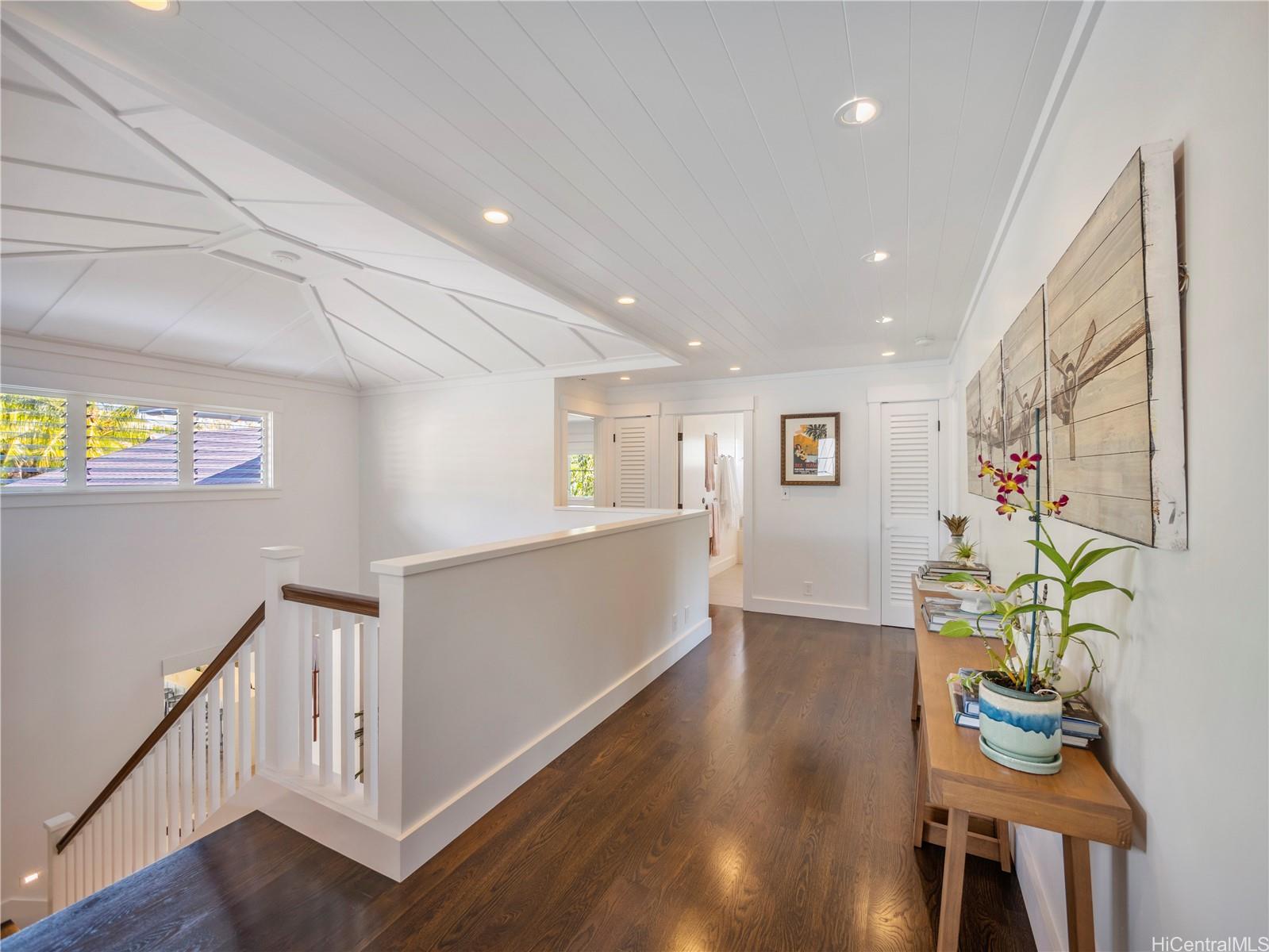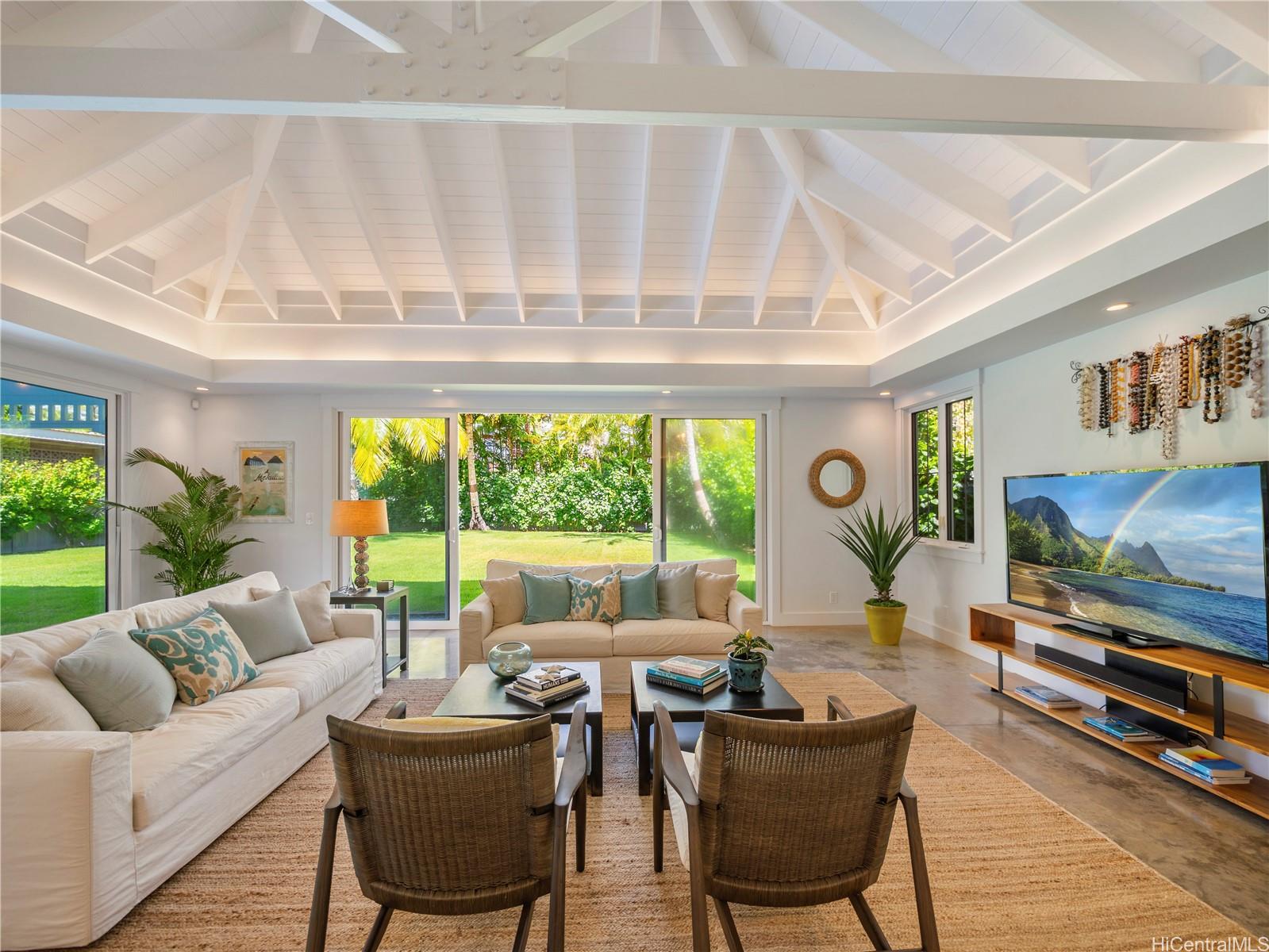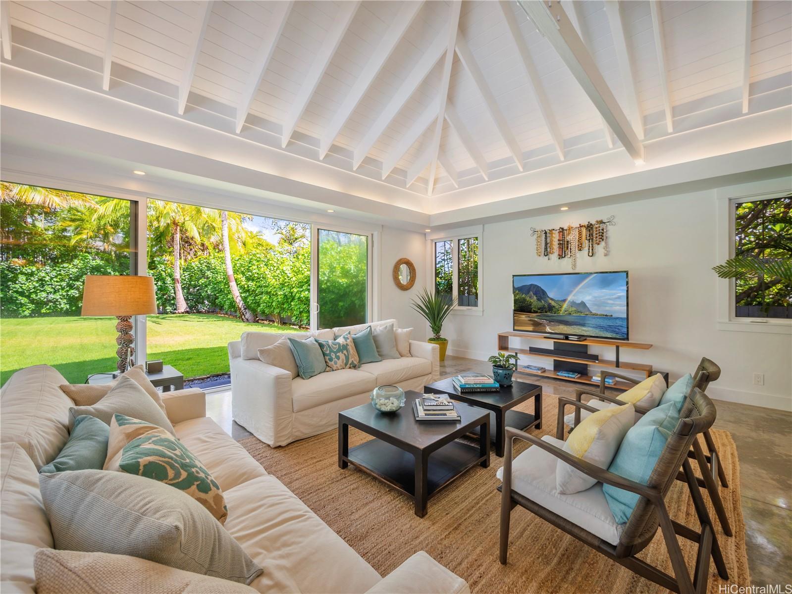 この非の打ちどころのないラニカイの邸宅は、精巧な木工細工と細部へのこだわりが光る建築の宝石です。2014年に建てられたこの邸宅は、ハワイのプランテーションスタイルの時代を超えた魅力と、すっきりとしたモダンなエレガンスを兼ね備えています。広々とした平坦な敷地に建つ5ベッドルーム、4バスルームの住宅は、大きな窓とドアから差し込む素晴らしい自然光が、印象的なアーチ型天井に反射します。1階はニュートラルな磨き仕上げのコンクリート床で、機能的でありながら美しく、2階には上質な堅木が敷かれています。広々としたリビングスペースは、広々とした屋根付きベランダ、そして緑豊かで色鮮やかな景観に囲まれた40フィートのきらめくタイル張りのプールとスパへとシームレスに広がります。1階には、天井の高い広々とした2ベッドルームと、それぞれ単独でも、独立した入り口を備えた広々としたゲストスイートとしても使用できるフルバスルーム、ランドリールーム、そして屋内/屋外シャワー付きのフルバスルームがあり、わずか6軒先のラニカイビーチを訪れた後に体を洗い流すのに最適です。 2階には、ベッドルーム3室とバスルーム2室があり、大階段で2つのウィングに分かれており、主寝室を独立して使うことができます。広々としたガレージと車寄せ付き駐車スペースも完備。オアフ島屈指の人気エリアで、この素晴らしい物件を所有できるチャンスをお見逃しなく!