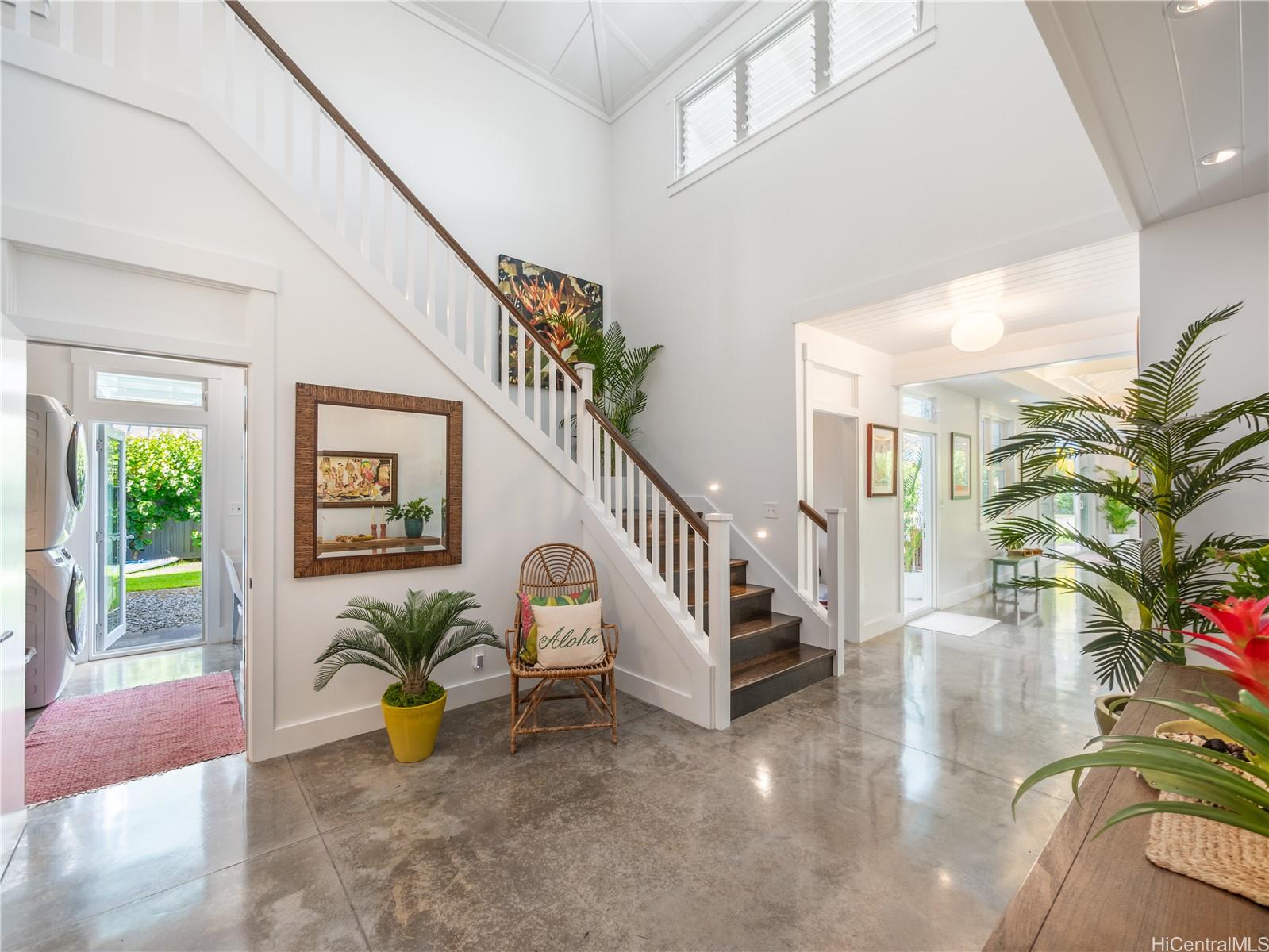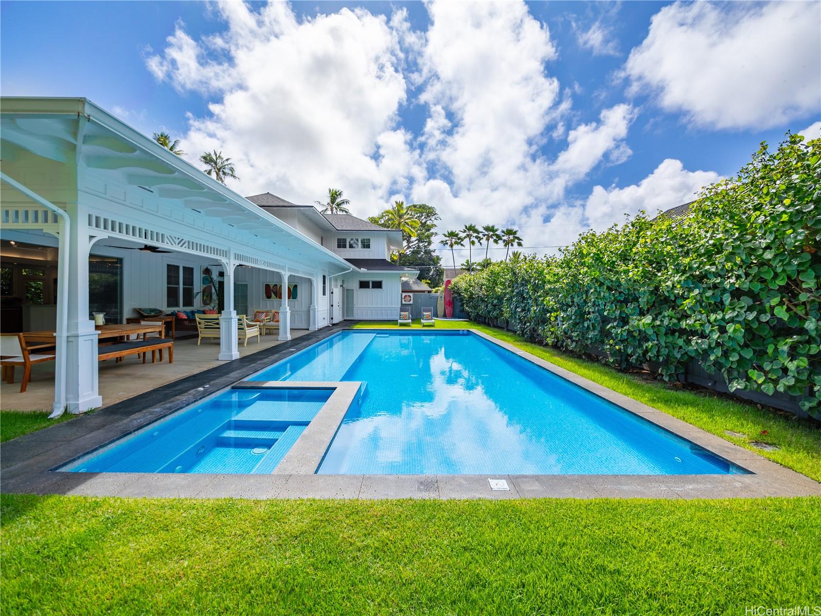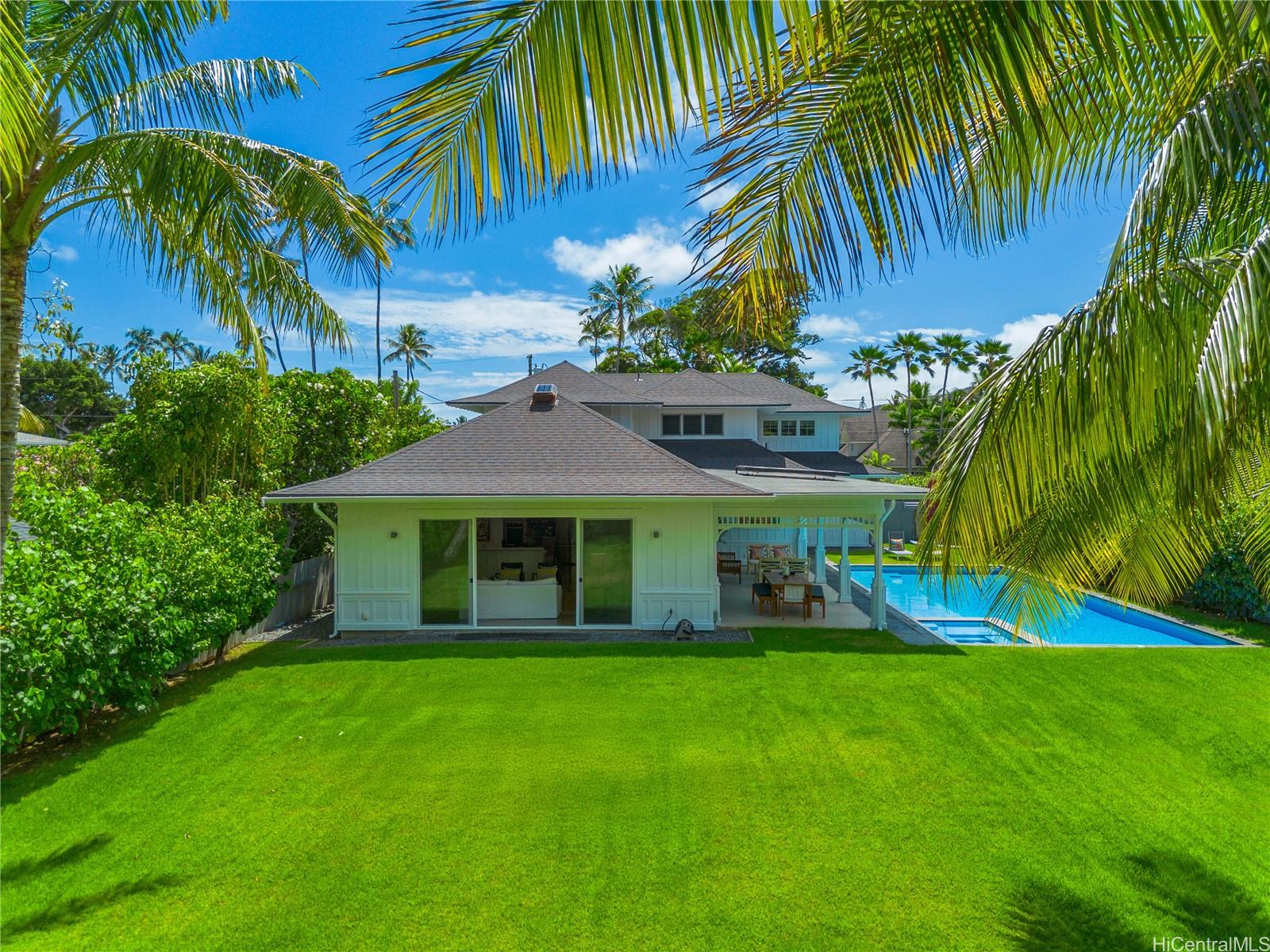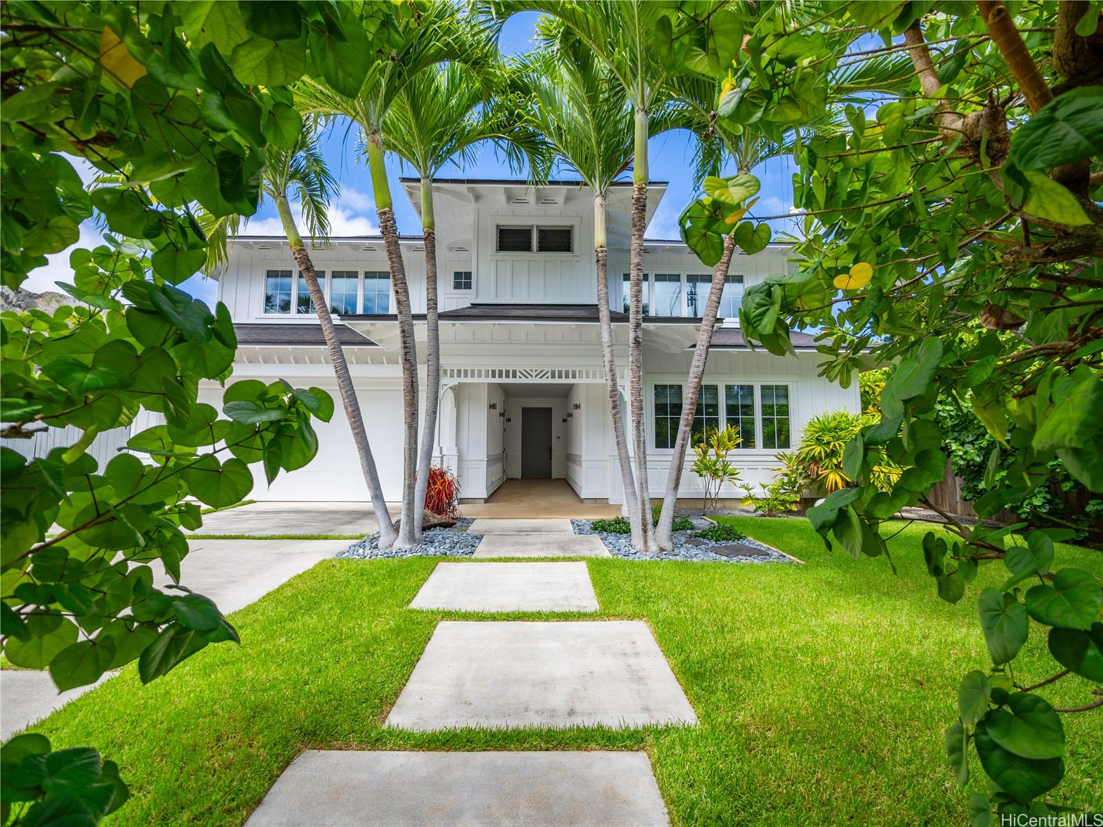 This impeccable Lanikai residence is an architectural gem, crafted with exquisite millwork & detail. Built in 2014, it offers the timeless charm of Hawaii's plantation style with clean, modern elegance. On an oversized level lot, the 5-BR, 4-BA home features incredible natural light, reflecting upon impressive vaulted ceilings, through expansive windows & doors. Neutral, polished concrete floors at ground level are both functional & beautiful, with rich hardwood upstairs. The generous living space seamlessly extends outdoors to a wide covered lanai, & a 40-ft shimmering tiled pool and spa, surrounded by lush, colorful landscape. At ground level, are 2 spacious BR with high ceilings & a full BA which can be used singly, or together as a large guest suite with separate entrance; a laundry room; & another full bath, with indoor/outdoor shower, perfect for rinsing off after a visit to Lanikai Beach, just six houses away. Upstairs, 3 BR & 2 full BA are divided into 2 wings by a grand staircase, offering separation for the primary suite. A large garage and driveway parking complete the package. Don't miss this exceptional opportunity to own in one of Oahu's most desired neighborhoods!