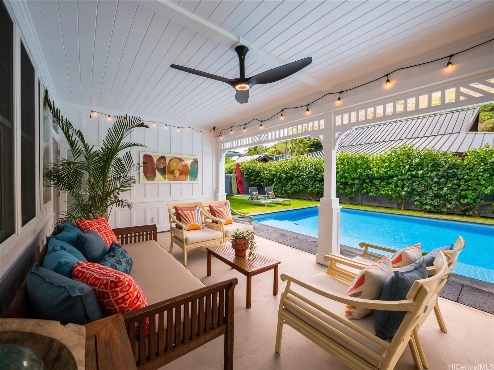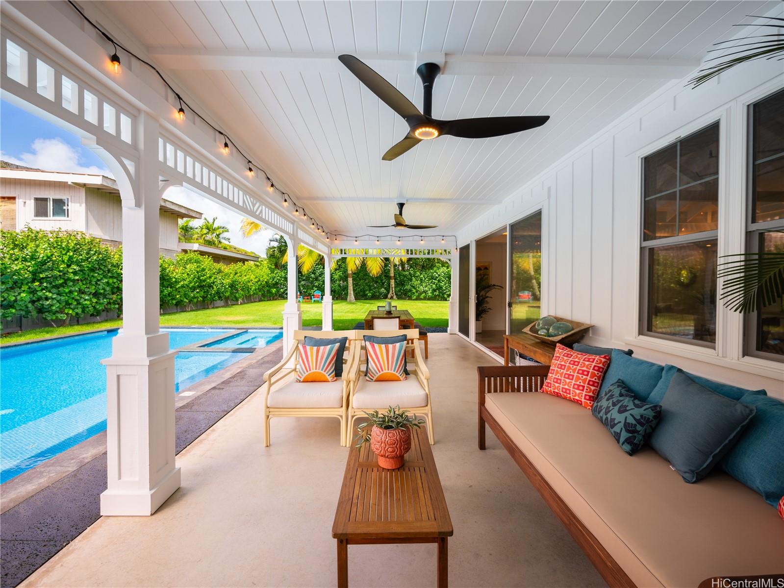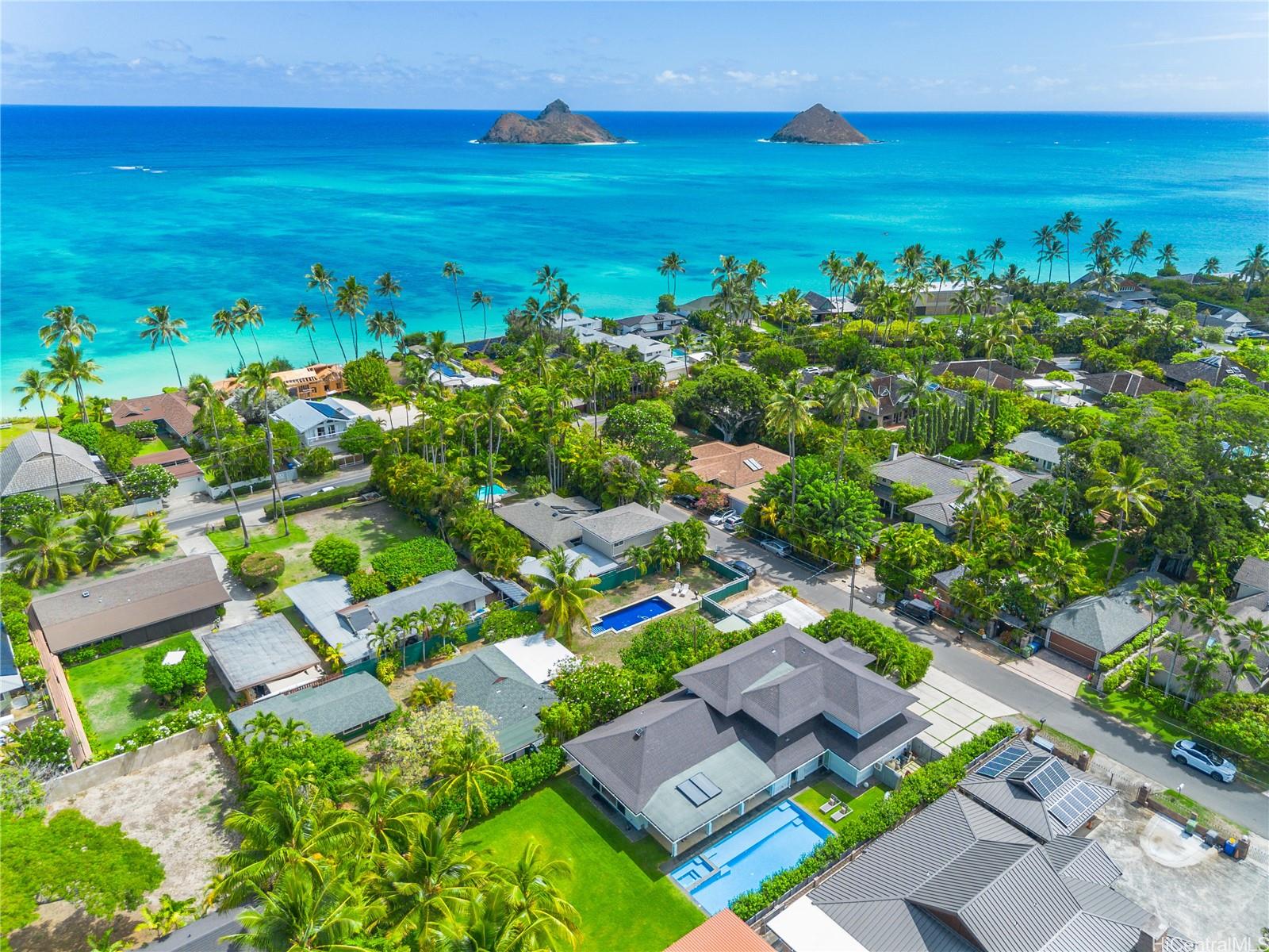This impeccable Lanikai residence is an architectural gem, crafted with exquisite millwork & detail. Built in 2014, it offers the timeless charm of Hawaii's plantation style with clean, modern elegance. On an oversized level lot, the 5-BR, 4-BA home features incredible natural light, reflecting upon impressive vaulted ceilings, through expansive windows & doors. Neutral, polished concrete floors at ground level are both functional & beautiful, with rich hardwood upstairs. The generous living space seamlessly extends outdoors to a wide covered lanai, & a 40-ft shimmering tiled pool and spa, surrounded by lush, colorful landscape. At ground level, are 2 spacious BR with high ceilings & a full BA which can be used singly, or together as a large guest suite with separate entrance; a laundry room; & another full bath, with indoor/outdoor shower, perfect for rinsing off after a visit to Lanikai Beach, just six houses away. Upstairs, 3 BR & 2 full BA are divided into 2 wings by a grand staircase, offering separation for the primary suite. A large garage and driveway parking complete the package. Don't miss this exceptional opportunity to own in one of Oahu's most desired neighborhoods!