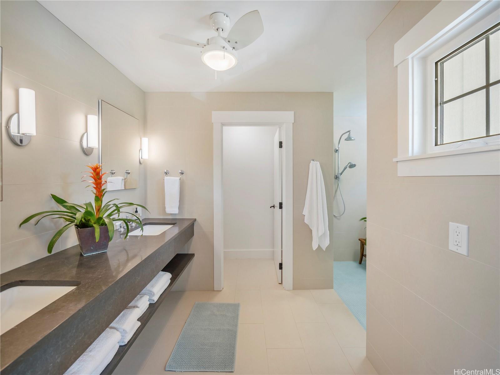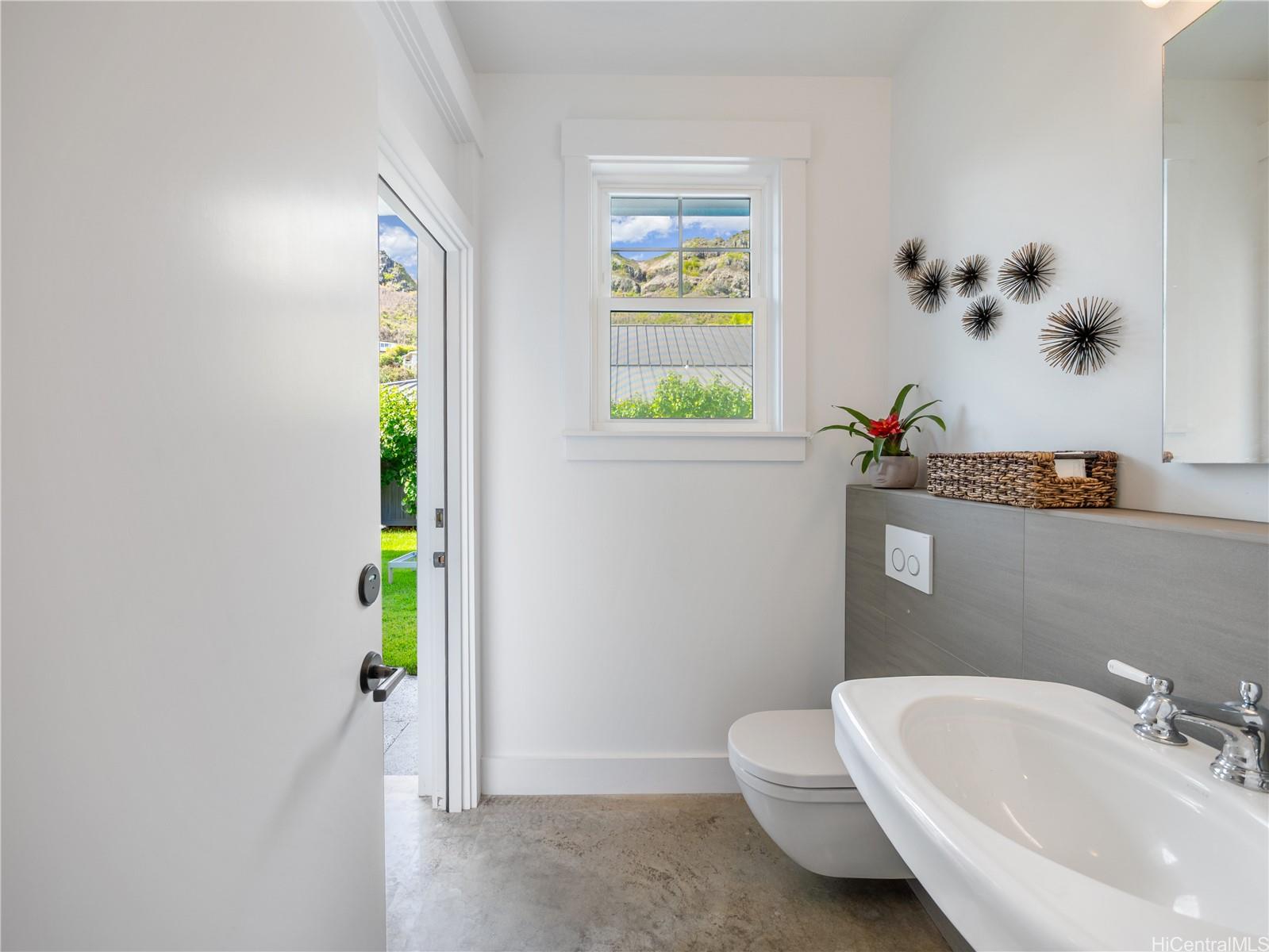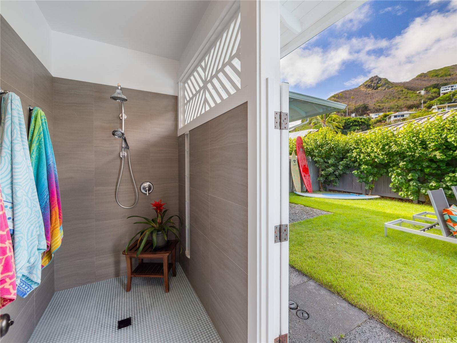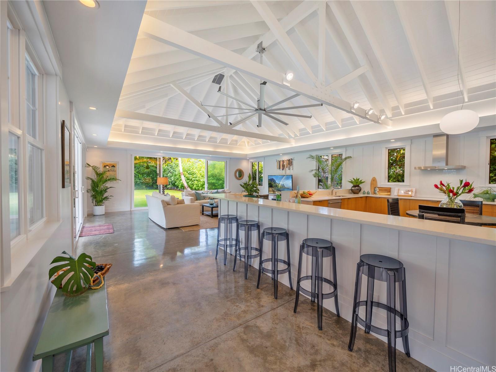 This impeccable Lanikai residence is an architectural gem, crafted with exquisite millwork & detail. Built in 2014, it offers the timeless charm of Hawaii's plantation style with clean, modern elegance. On an oversized level lot, the 5-BR, 4-BA home features incredible natural light, reflecting upon impressive vaulted ceilings, through expansive windows & doors. Neutral, polished concrete floors at ground level are both functional & beautiful, with rich hardwood upstairs. The generous living space seamlessly extends outdoors to a wide covered lanai, & a 40-ft shimmering tiled pool and spa, surrounded by lush, colorful landscape. At ground level, are 2 spacious BR with high ceilings & a full BA which can be used singly, or together as a large guest suite with separate entrance; a laundry room; & another full bath, with indoor/outdoor shower, perfect for rinsing off after a visit to Lanikai Beach, just six houses away. Upstairs, 3 BR & 2 full BA are divided into 2 wings by a grand staircase, offering separation for the primary suite. A large garage and driveway parking complete the package. Don't miss this exceptional opportunity to own in one of Oahu's most desired neighborhoods!