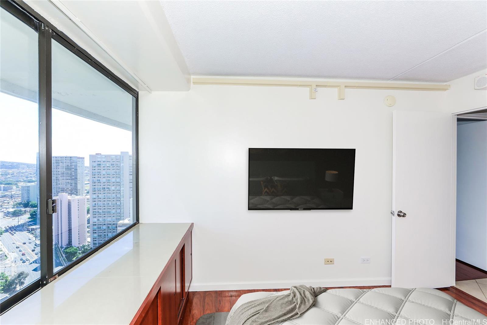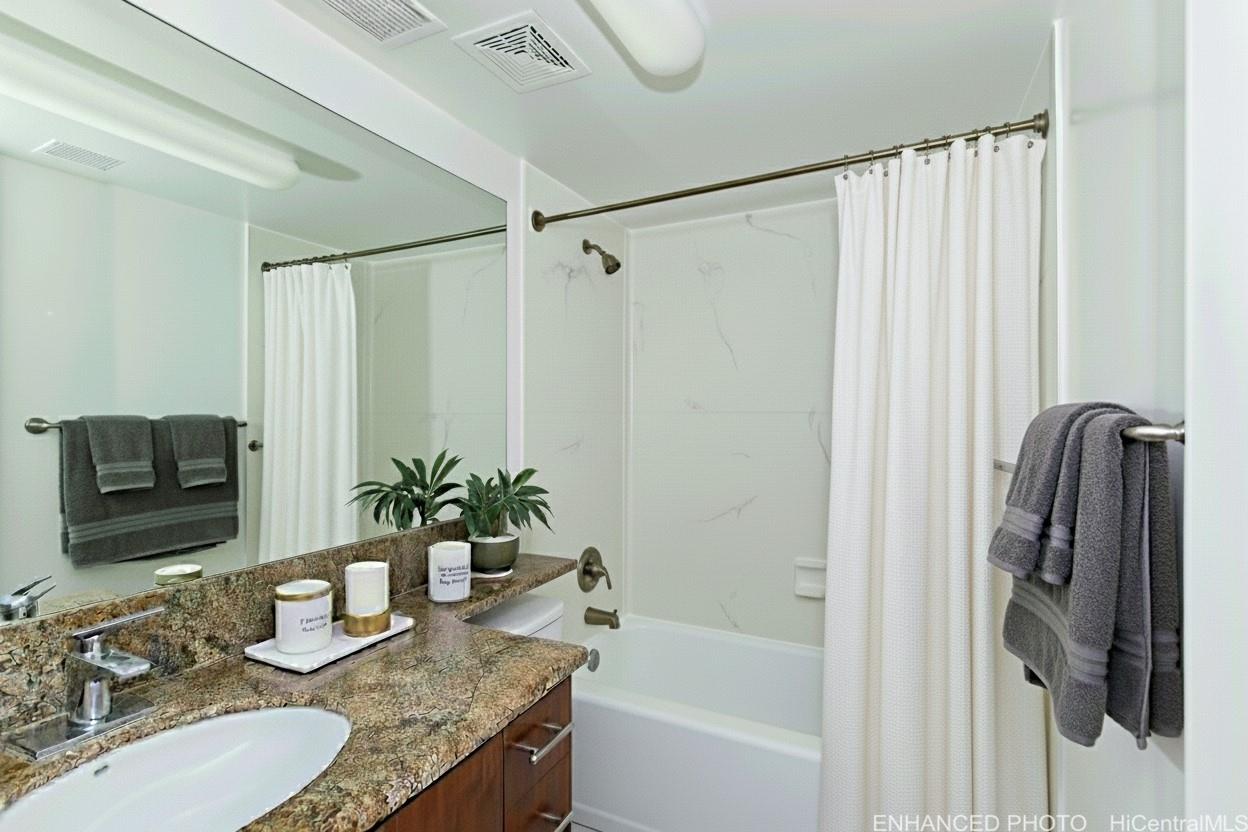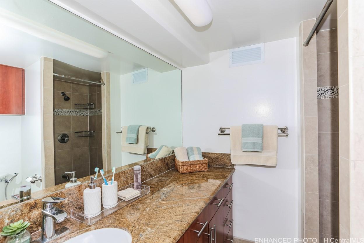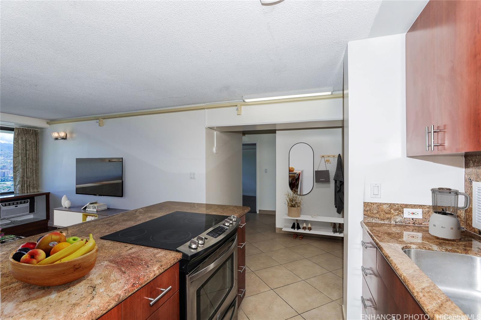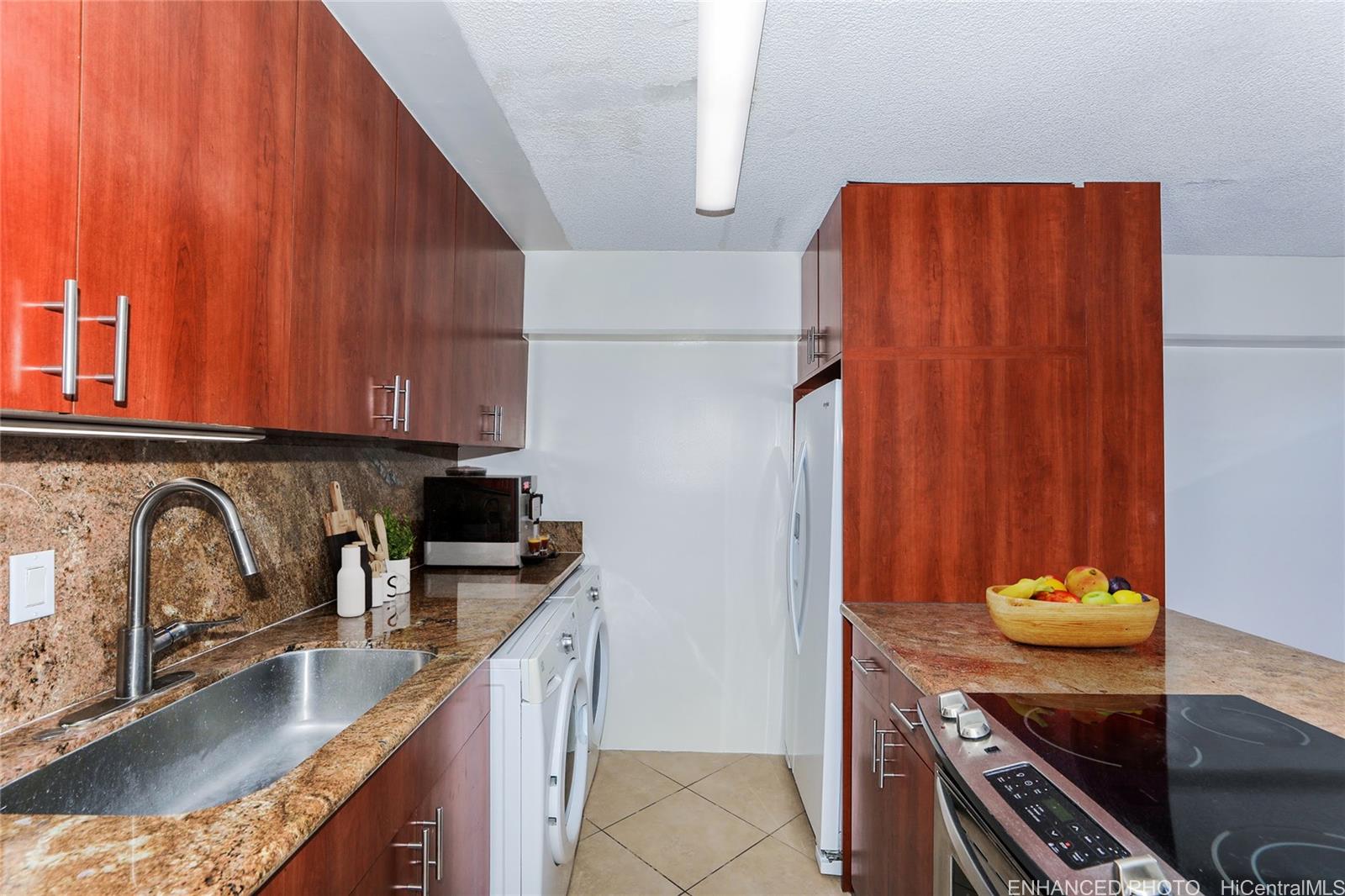 One Level Below Penthouse - Remodeled Condo with stunning views of the Koolau mountains. This beautiful newly remodeled 2-bedroom, 2-bath condo unit offers stunning views of the city and Koolau mountains. The cozy open-concept kitchen features upgraded countertops, backsplash, and appliances, flowing seamlessly into the living area—perfect for entertaining. Enjoy the convenience of in-unit washer and dryer, alarm/fire sprinkler system, and one covered/secure assigned parking stall. Resort-style living awaits with 24-hour security and an array of amenities including a pool, sauna, guest parking, courtyard, basketball and tennis courts, BBQ areas, putting greens, car wash station, and an on-site convenience store located lobby level. Centrally located near downtown Honolulu, UH Manoa, Ala Moana Center, Waikiki, beaches, dining, shopping, and public transportation. Urban living meets island comfort—don’t miss this rare opportunity! Sold As Is, enhanced and virtually staged photos.