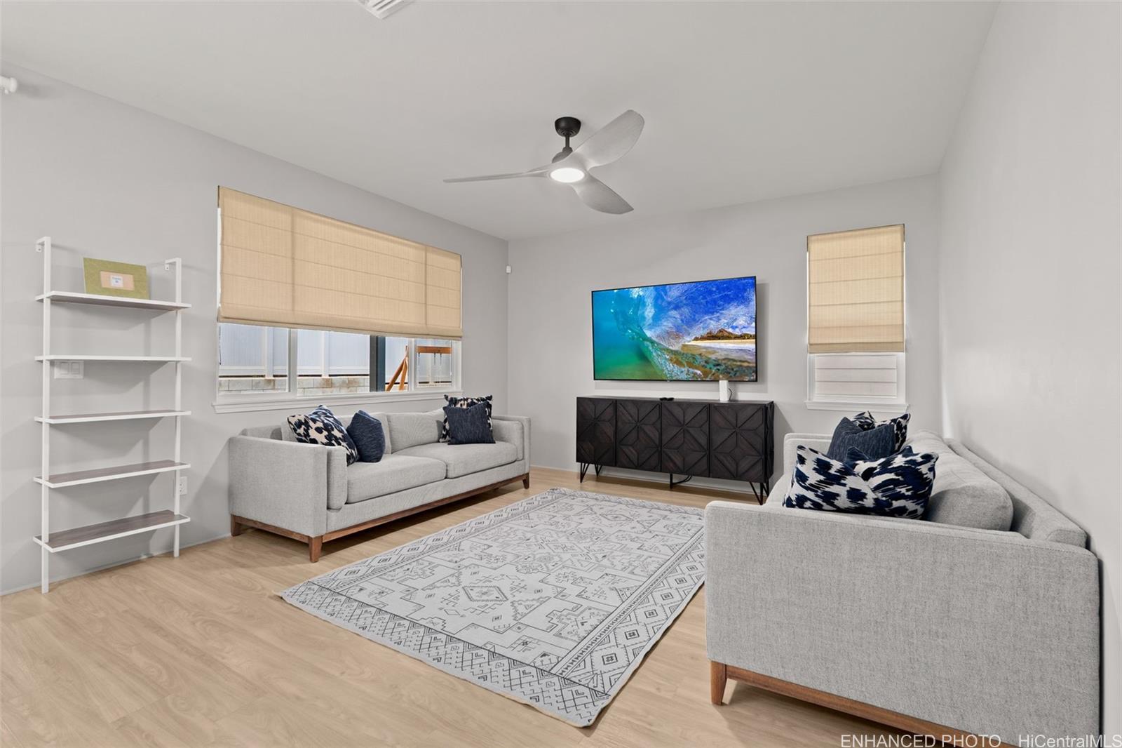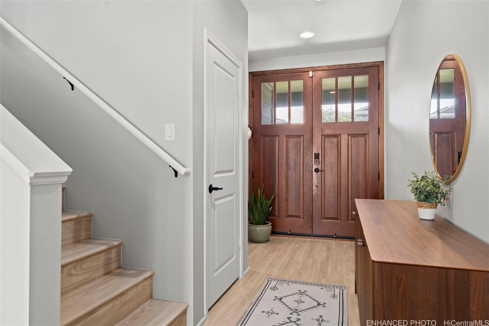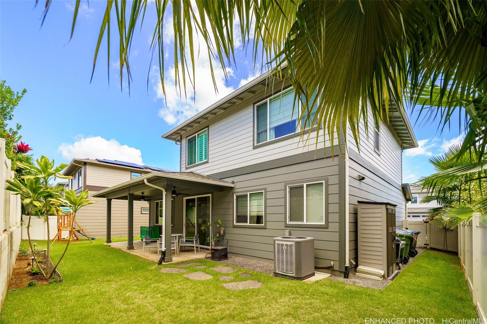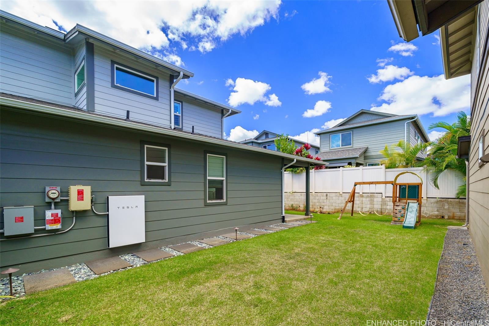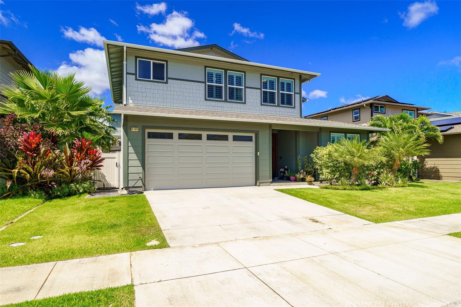 Gorgeous Plan 4R in Ewa by Gentry – Coral Ridge Phase 2 ,Built in 2019, this spacious home offers an open living and dining area with 1 bedroom and 1 full bath on the first floor. The upgraded kitchen features sleek cabinets, countertops, and a large peninsula island that flows into an extended patio—perfect for entertaining. A separate laundry room adds convenience. Upstairs includes 3 bedrooms, 2 bathrooms, and a cozy loft. The primary suite boasts a walk-in closet with custom organizer. Energy efficiency comes with 18 owned PV panels and a Tesla wall battery, plus central A/C for comfort. Situated on a 5,175 sq. ft. lot, this home is just minutes from White Plains Beach, Oneula Beach Park, community parks, Wai Kai Lagoon and Laulani Shopping Center.