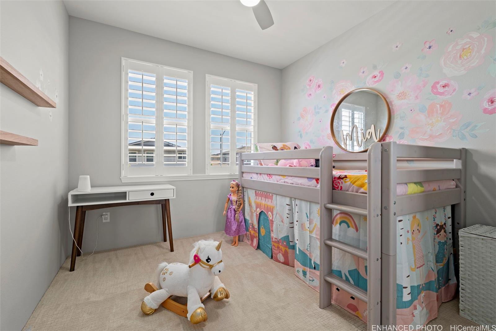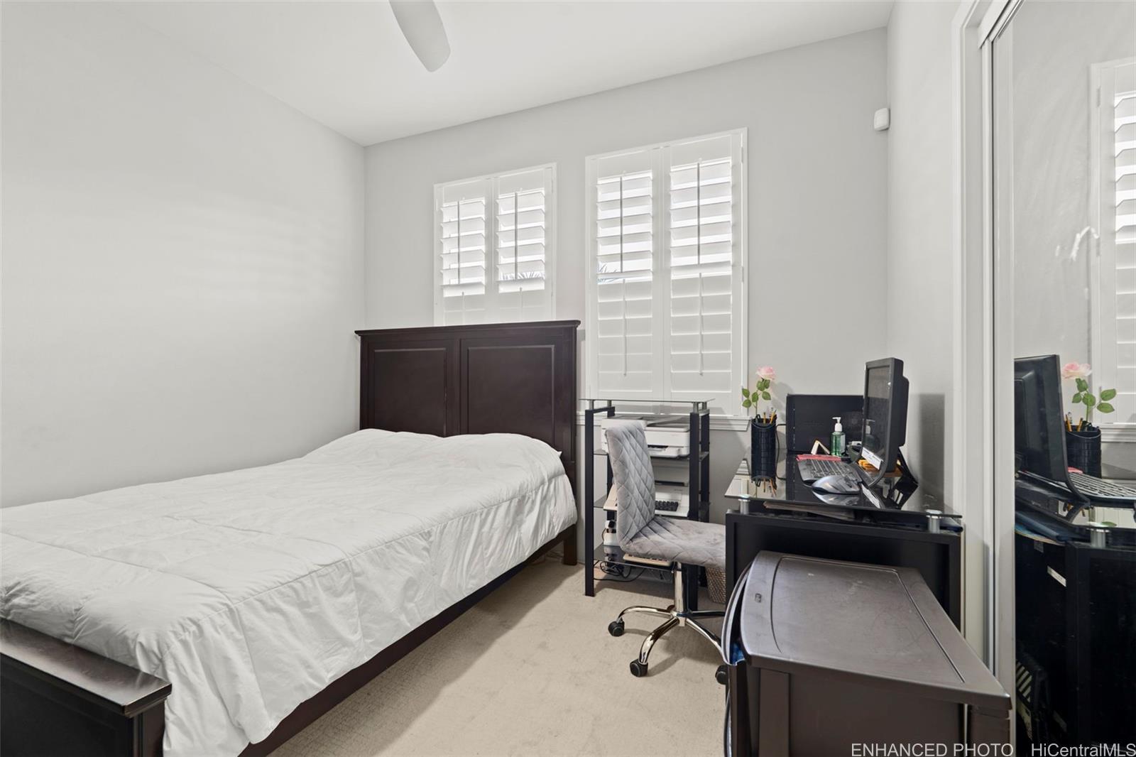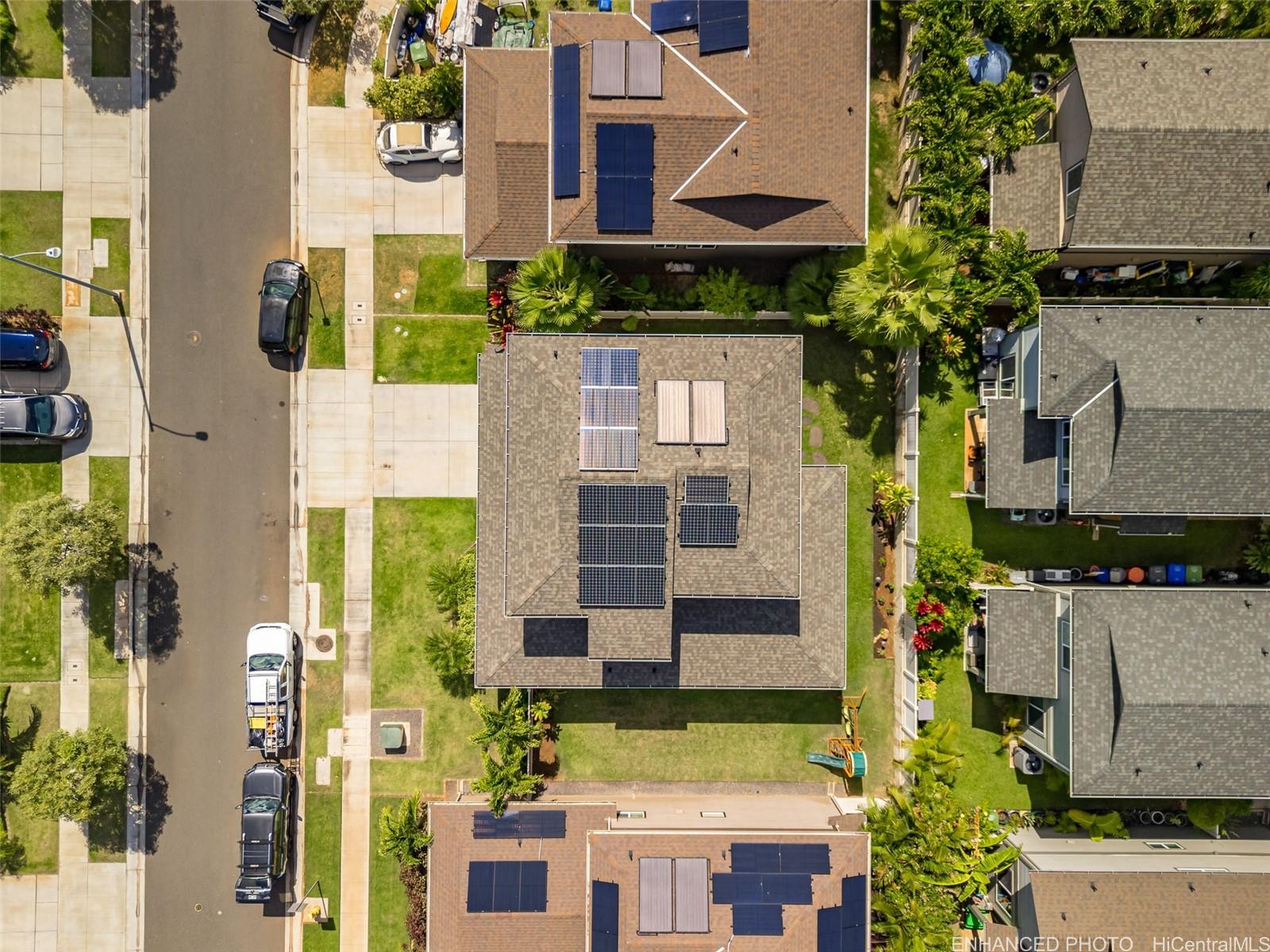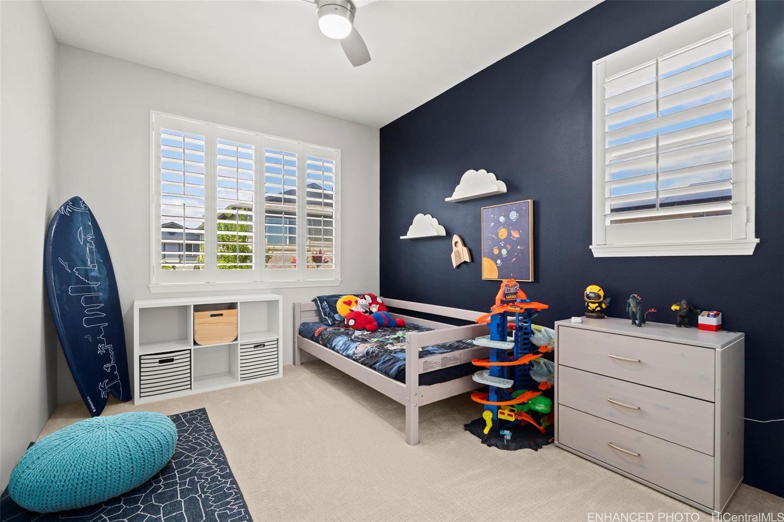 Gorgeous Plan 4R in Ewa by Gentry – Coral Ridge Phase 2 ,Built in 2019, this spacious home offers an open living and dining area with 1 bedroom and 1 full bath on the first floor. The upgraded kitchen features sleek cabinets, countertops, and a large peninsula island that flows into an extended patio—perfect for entertaining. A separate laundry room adds convenience. Upstairs includes 3 bedrooms, 2 bathrooms, and a cozy loft. The primary suite boasts a walk-in closet with custom organizer. Energy efficiency comes with 18 owned PV panels and a Tesla wall battery, plus central A/C for comfort. Situated on a 5,175 sq. ft. lot, this home is just minutes from White Plains Beach, Oneula Beach Park, community parks, Wai Kai Lagoon and Laulani Shopping Center.