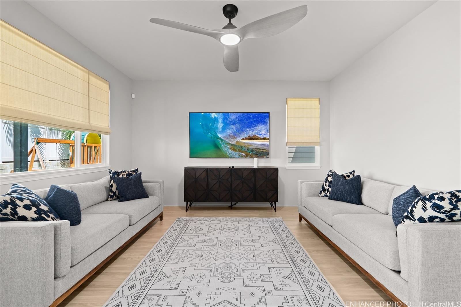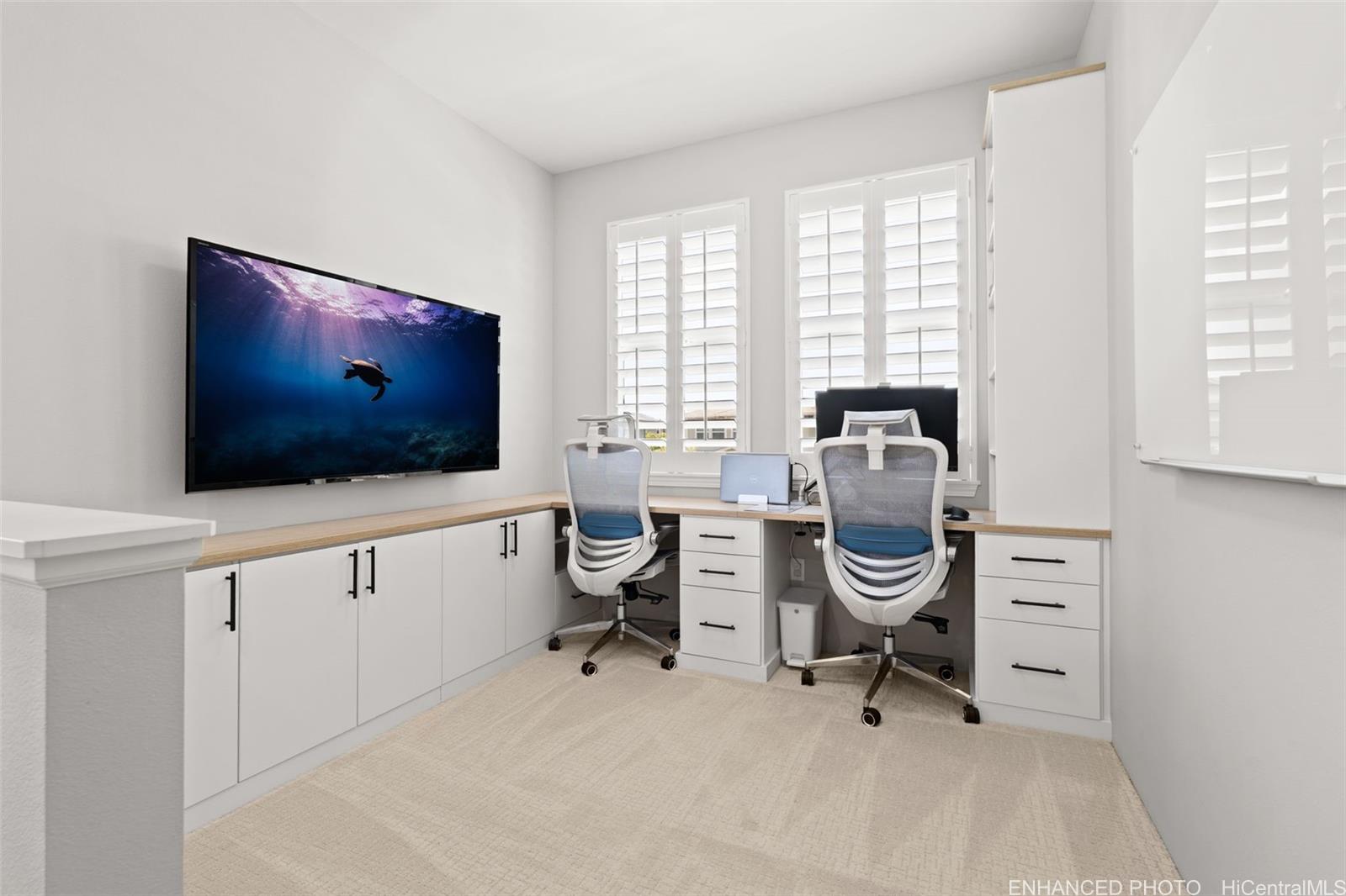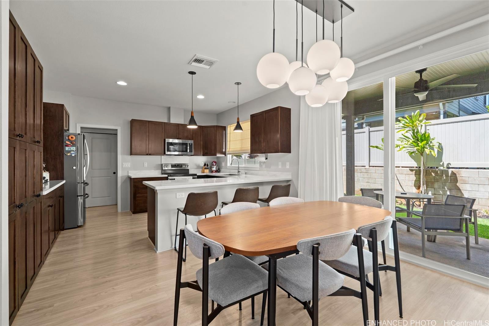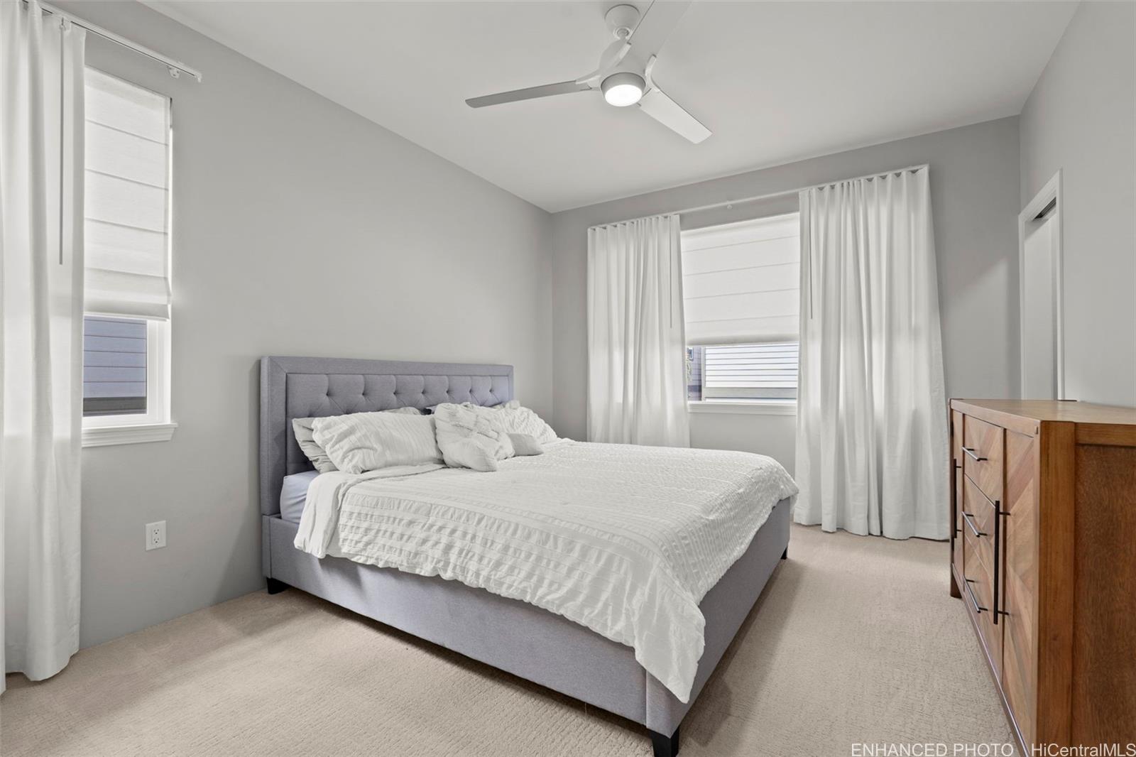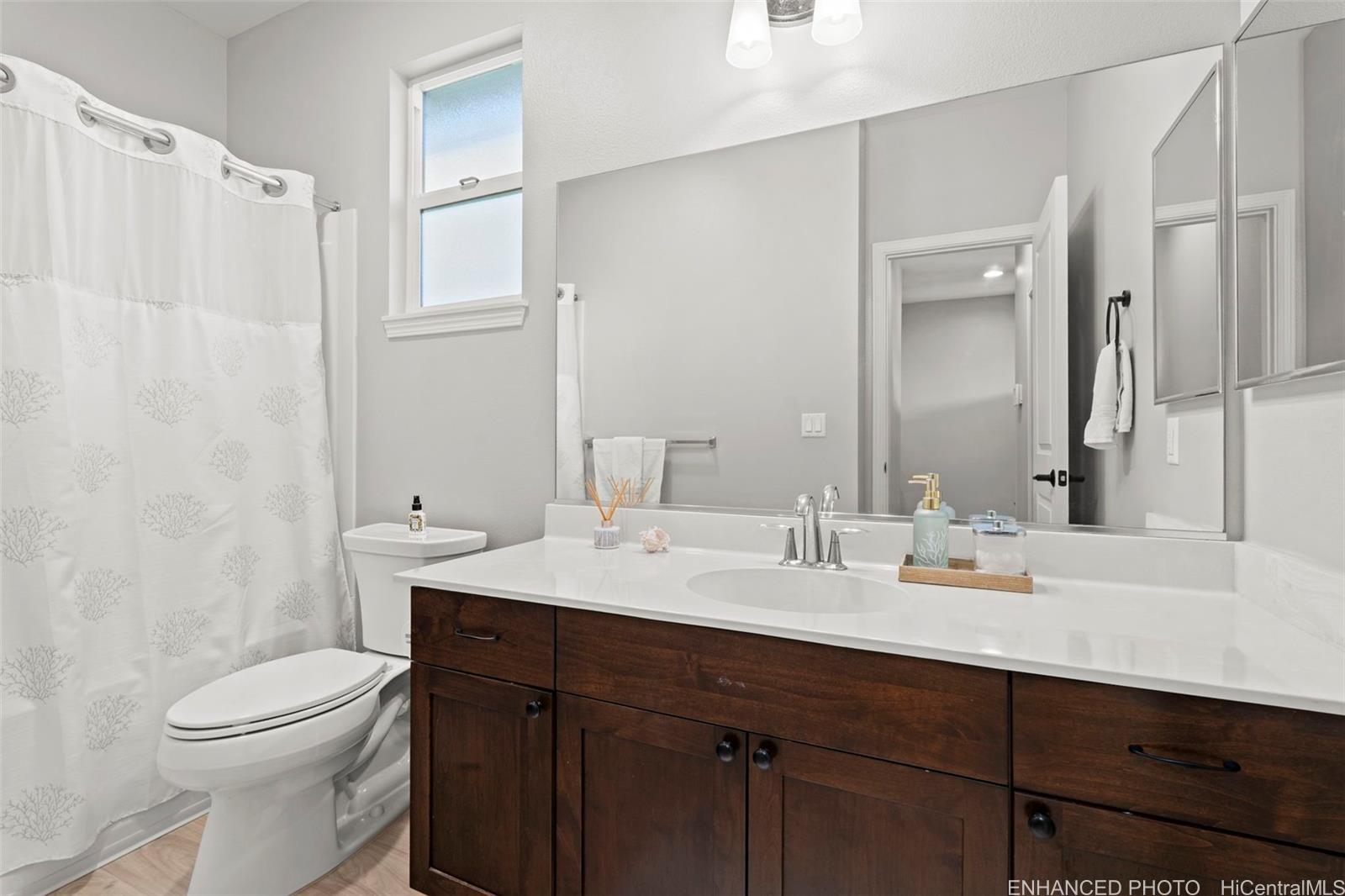 Gorgeous Plan 4R in Ewa by Gentry – Coral Ridge Phase 2 ,Built in 2019, this spacious home offers an open living and dining area with 1 bedroom and 1 full bath on the first floor. The upgraded kitchen features sleek cabinets, countertops, and a large peninsula island that flows into an extended patio—perfect for entertaining. A separate laundry room adds convenience. Upstairs includes 3 bedrooms, 2 bathrooms, and a cozy loft. The primary suite boasts a walk-in closet with custom organizer. Energy efficiency comes with 18 owned PV panels and a Tesla wall battery, plus central A/C for comfort. Situated on a 5,175 sq. ft. lot, this home is just minutes from White Plains Beach, Oneula Beach Park, community parks, Wai Kai Lagoon and Laulani Shopping Center.