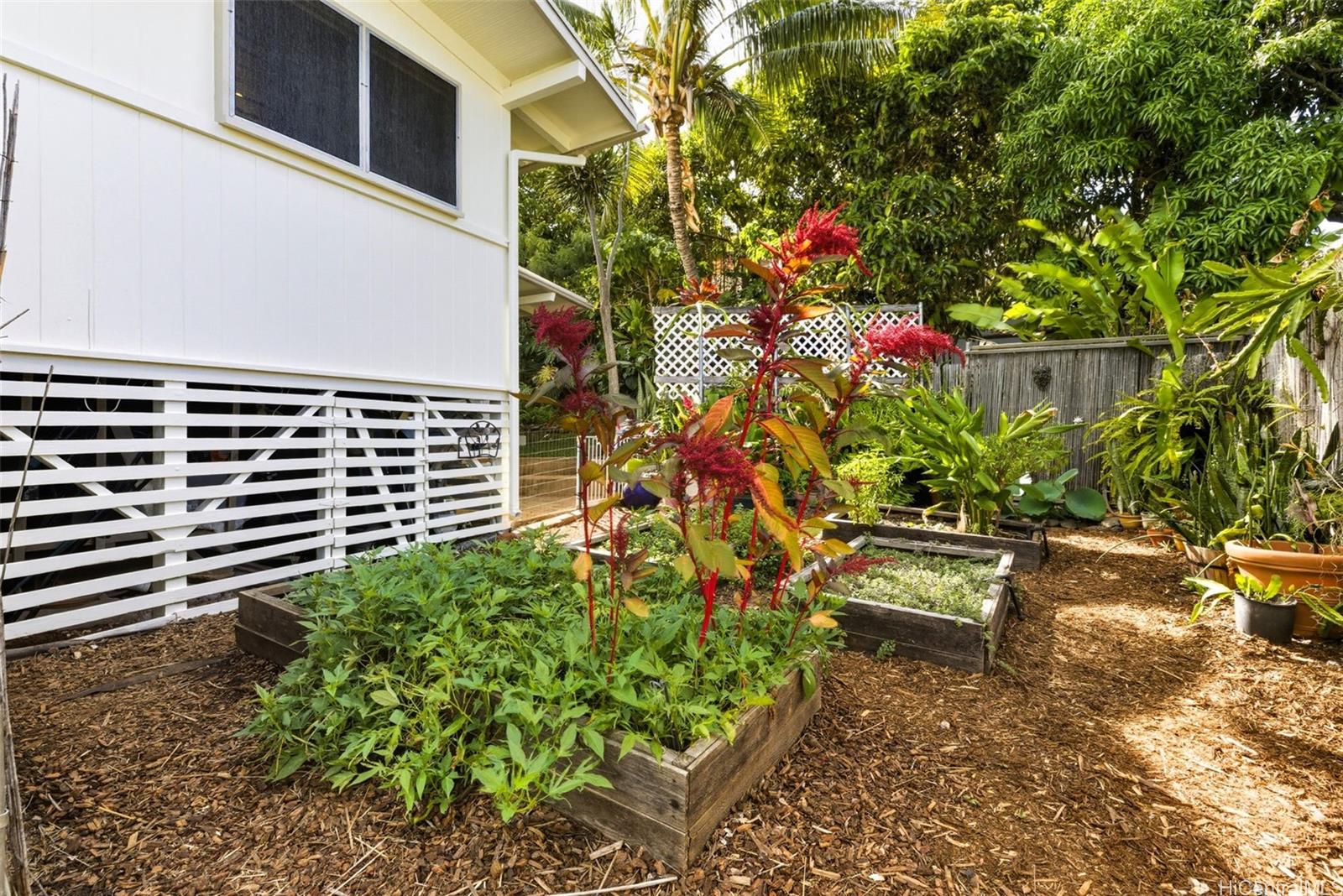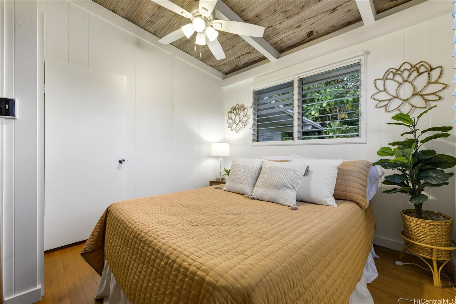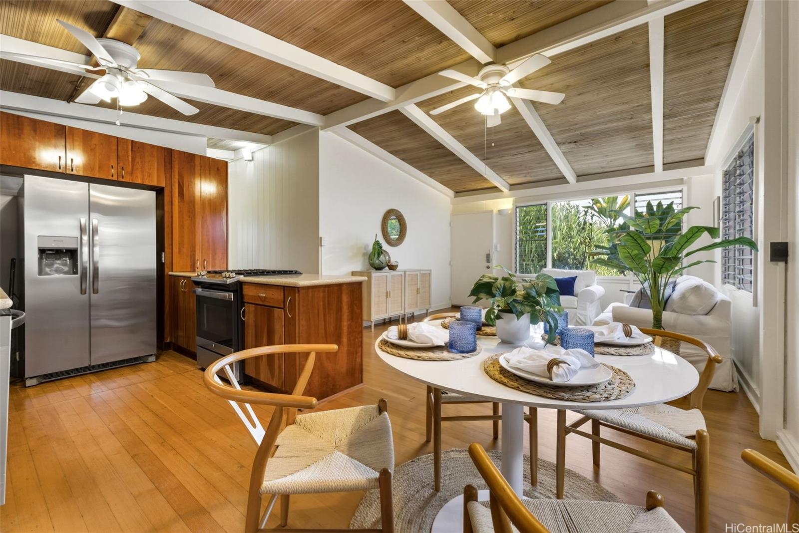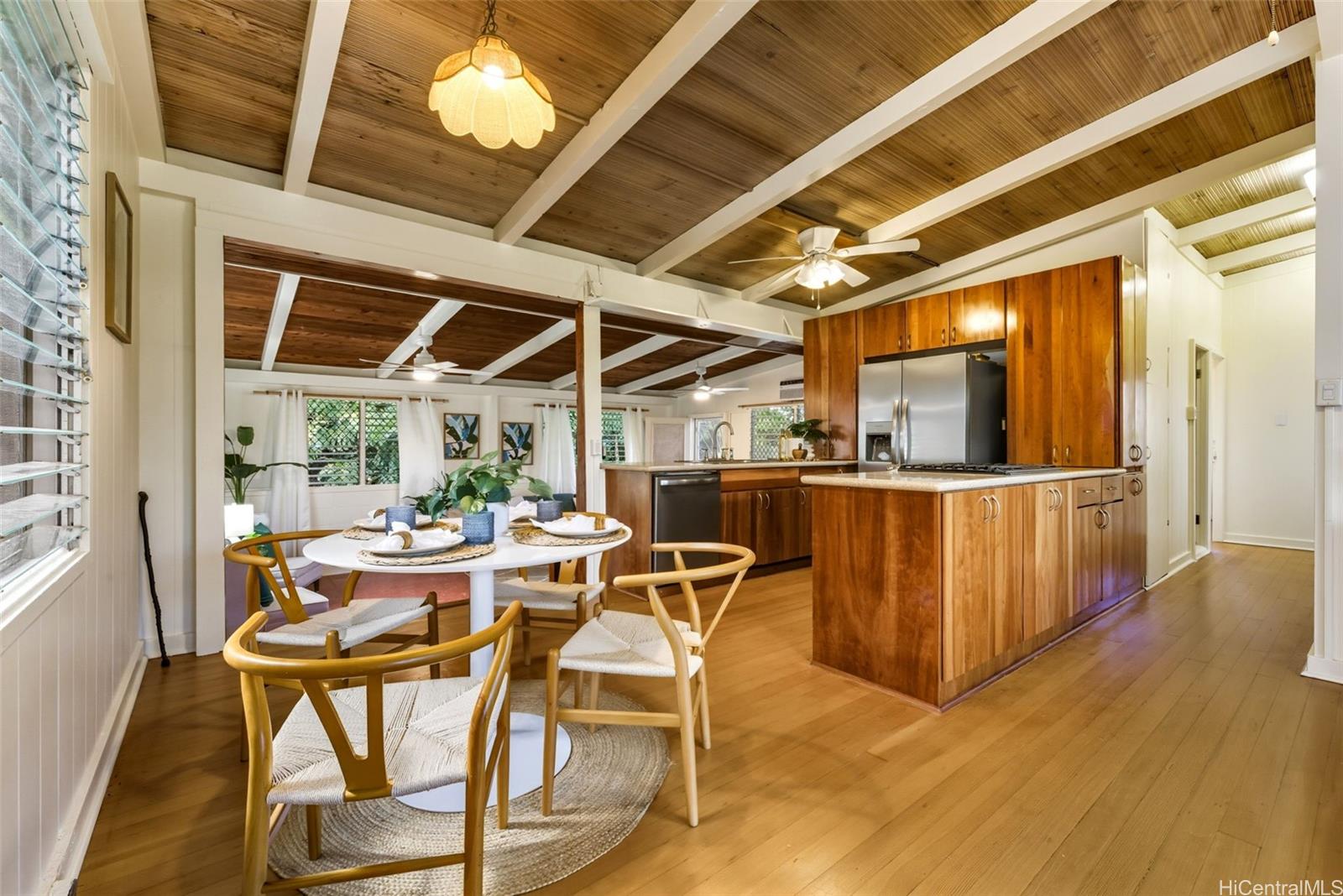 This 3-bed, 2-bath home blends classic island charm with thoughtful updates and flexible living. The expanded layout creates the perfect opportunity for an in-law suite, ideal for multi-generational living or visiting guests. The interior is full of warm, inviting details – from the white-washed combed pine ceilings to the stunning Douglas Fir hardwood floors that run through the main living areas. At the heart of the home is a kitchen that’s both functional and beautiful. Solid cherry wood cabinets, composite stone countertops, a gas stove, and a brand-new refrigerator and dishwasher all come together in a layout that makes cooking and entertaining a joy. Enjoy excellent airflow with 7 ceiling fans, 2 AC units, and the added bonus of 24 OWNED solar PV panels. The yard is a true retreat. Both front and back yards offer plenty of space to relax, unwind, or entertain. Plus, a curated garden of native Hawaiian plants, herbs, and fruit trees—including mango, guava, and avocado. If you’ve been looking for a Kailua home that offers character, functionality, and charm, this one is definitely worth a look.