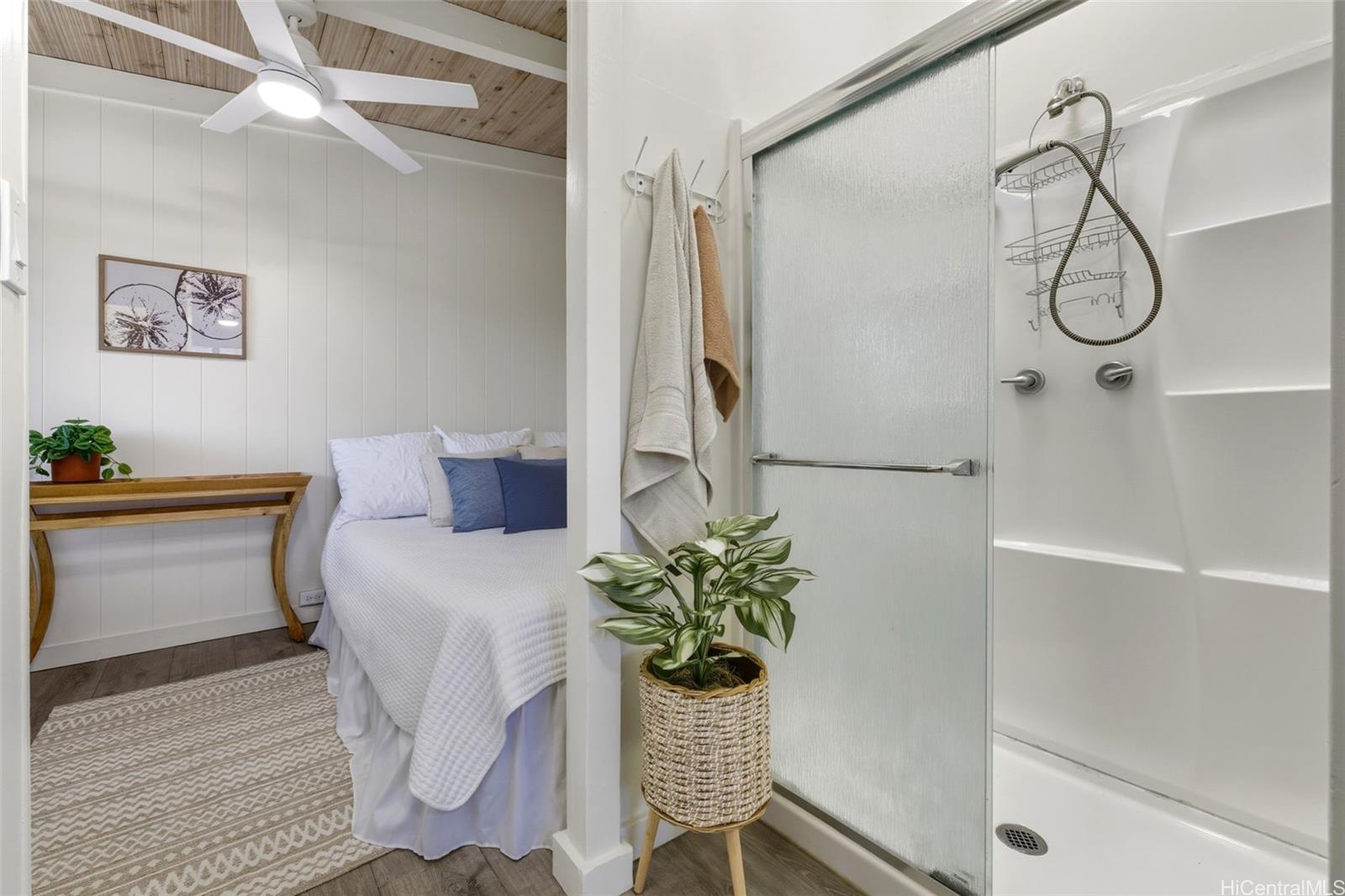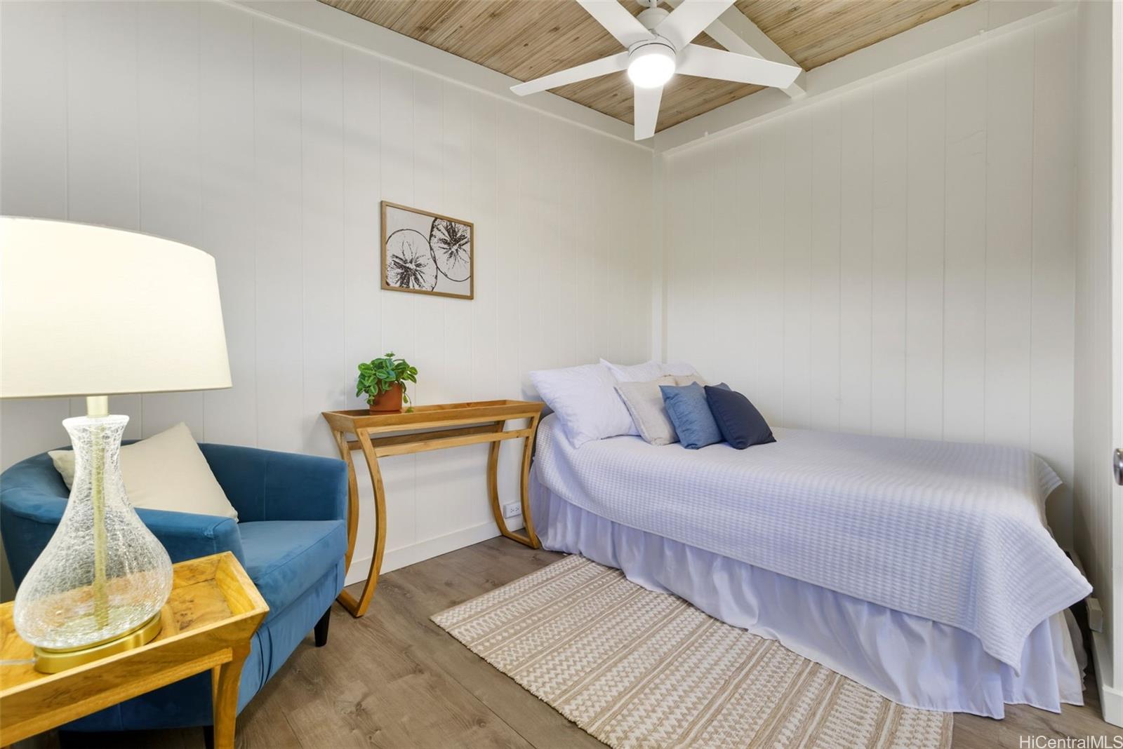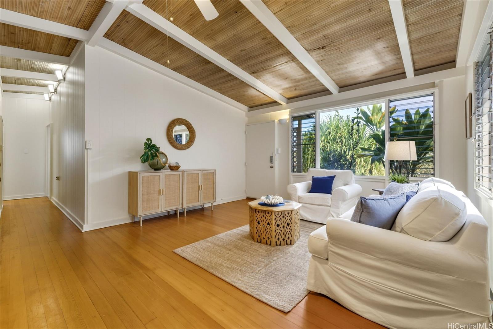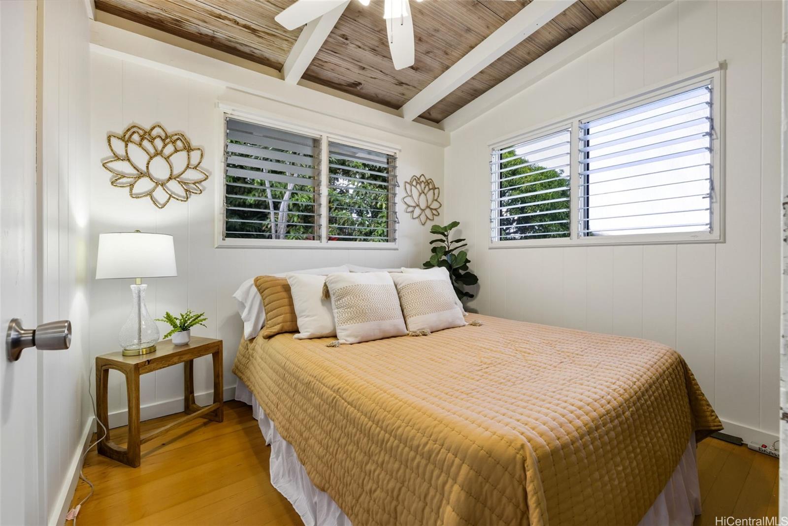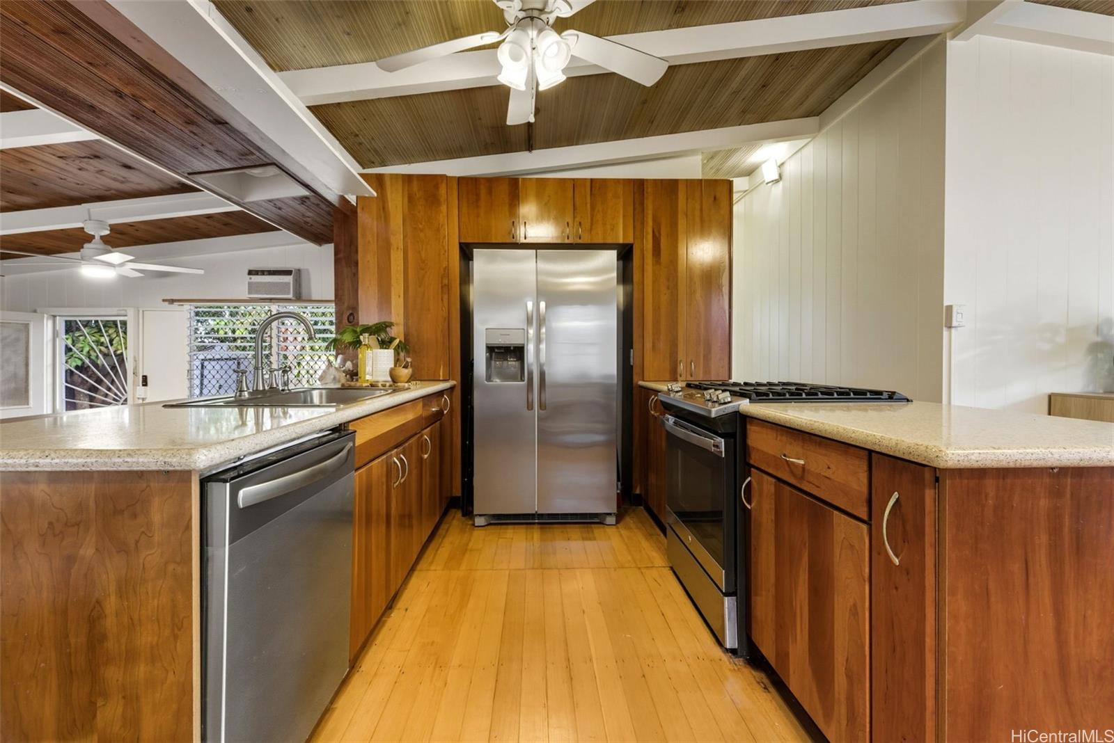 This 3-bed, 2-bath home blends classic island charm with thoughtful updates and flexible living. The expanded layout creates the perfect opportunity for an in-law suite, ideal for multi-generational living or visiting guests. The interior is full of warm, inviting details – from the white-washed combed pine ceilings to the stunning Douglas Fir hardwood floors that run through the main living areas. At the heart of the home is a kitchen that’s both functional and beautiful. Solid cherry wood cabinets, composite stone countertops, a gas stove, and a brand-new refrigerator and dishwasher all come together in a layout that makes cooking and entertaining a joy. Enjoy excellent airflow with 7 ceiling fans, 2 AC units, and the added bonus of 24 OWNED solar PV panels. The yard is a true retreat. Both front and back yards offer plenty of space to relax, unwind, or entertain. Plus, a curated garden of native Hawaiian plants, herbs, and fruit trees—including mango, guava, and avocado. If you’ve been looking for a Kailua home that offers character, functionality, and charm, this one is definitely worth a look.