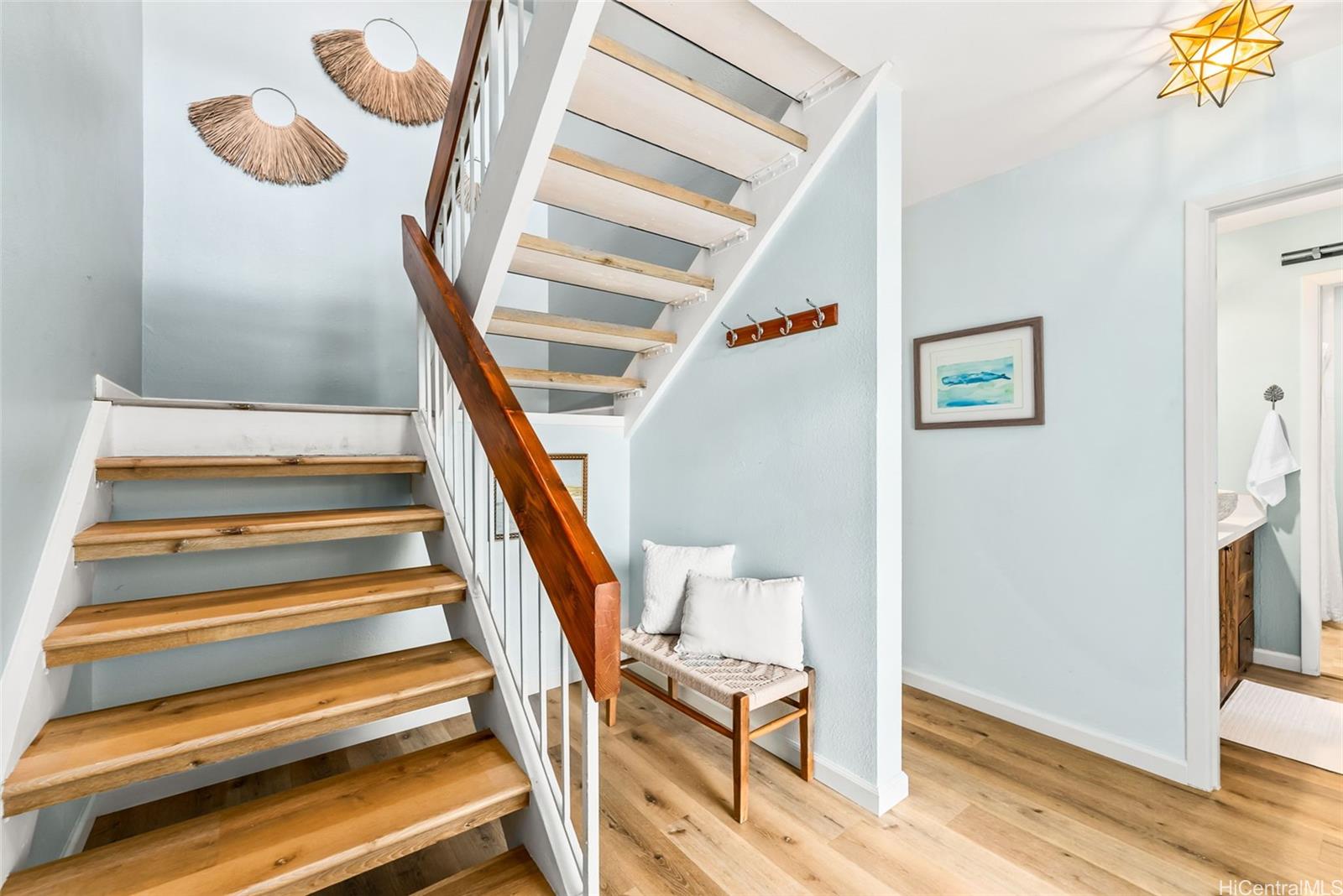 Blending nature and serenity, this 3 bedroom, 2 bath unit with a 34 ft boat slip, combines the feel of a tropical oasis with the beauty of the surrounding Ko’olau mountains and grandeur of Kaneohe Bay. Second floor vaulted ceilings with exposed wood beams provides an open flow to one of 4 private lanais where you can enjoy a beverage of choice or relax and meditate to the sounds of nature. Recently updated kitchen with a gorgeous monkeypod bar top will have you excited to create and/or host lavish get togethers with family and friends. Feel transported to a luxurious spa when you step into the recently updated bathrooms. Enclosed, private back yard space which leads to an outdoor grassy is perfect for fur friends and keiki. Makani Kai Marina is a gated, pet-friendly community sitting on the waterfront of Kaneohe Bay. You’ll have access to the pool, rec room, grilling spaces as well lots of guest parking. Don’t own a boat? Rent out your slip for monthly income!