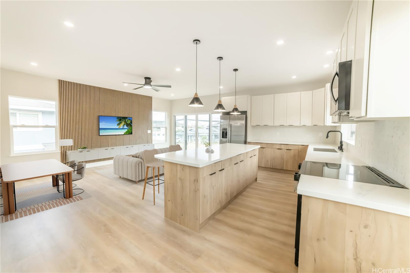 売主のモチベーションを高めます。この美しく新築のCPRモダン住宅は、広々とした5つの寝室と4つのバスルーム、美しい庭を備え、多世代住宅、賃貸収入(2階に3/2、1階に2/2)、または管理費なしの1軒家をお探しの購入者に最適です。この住宅は、オープンコンセプトのリビングルーム、美しいキャビネット、スタイリッシュなバックスプラッシュ、ステンレス製の家電を備えたモダンなキッチンを備えています。主寝室にはウォークインクローゼット、深めのバスタブ、ガラスドアのシャワー、LEDバニティミラー付きのダブルシンクの洗面台を備えた豪華なバスルームがあります。2階の各寝室には専用のベランダがあり、最も広々としたベランダはリビングルームにつながっています。これは、家族が集まったり、長い一日の後のリラクゼーションエリアに最適な環境を作り出します。7つのスプリットエアコンと複数のシーリングファンにより、家は一年中快適に過ごせます。3台分の車庫が2つあり、EV電源充電ステーションとすべてのインターネット用のスマートケーブルボックスが備わっています。この物件は、公立学校、私立学校、ハワイ大学マノア校、シャミナード大学、カハラモール、そして様々なレストランに近い場所に位置しています。高速道路へのアクセスも良好です。快適さと利便性を兼ね備えた物件です。