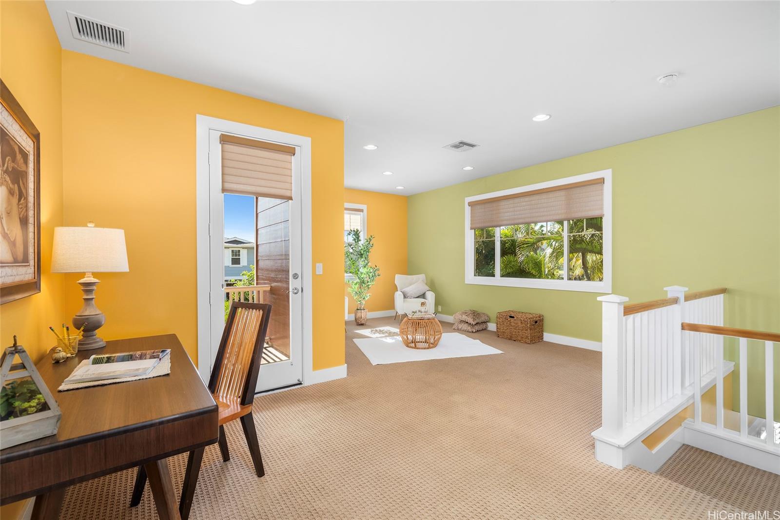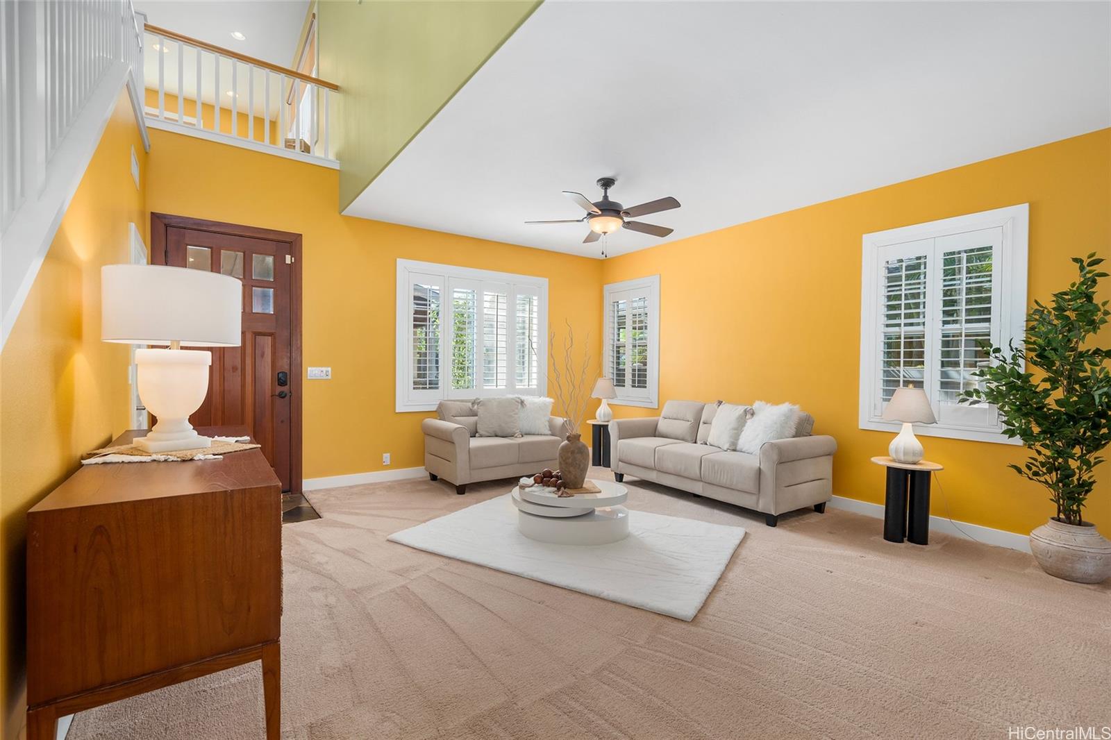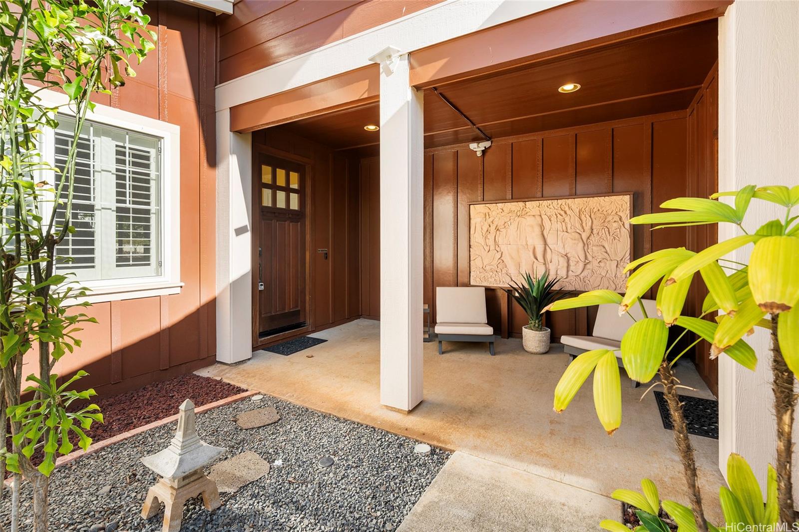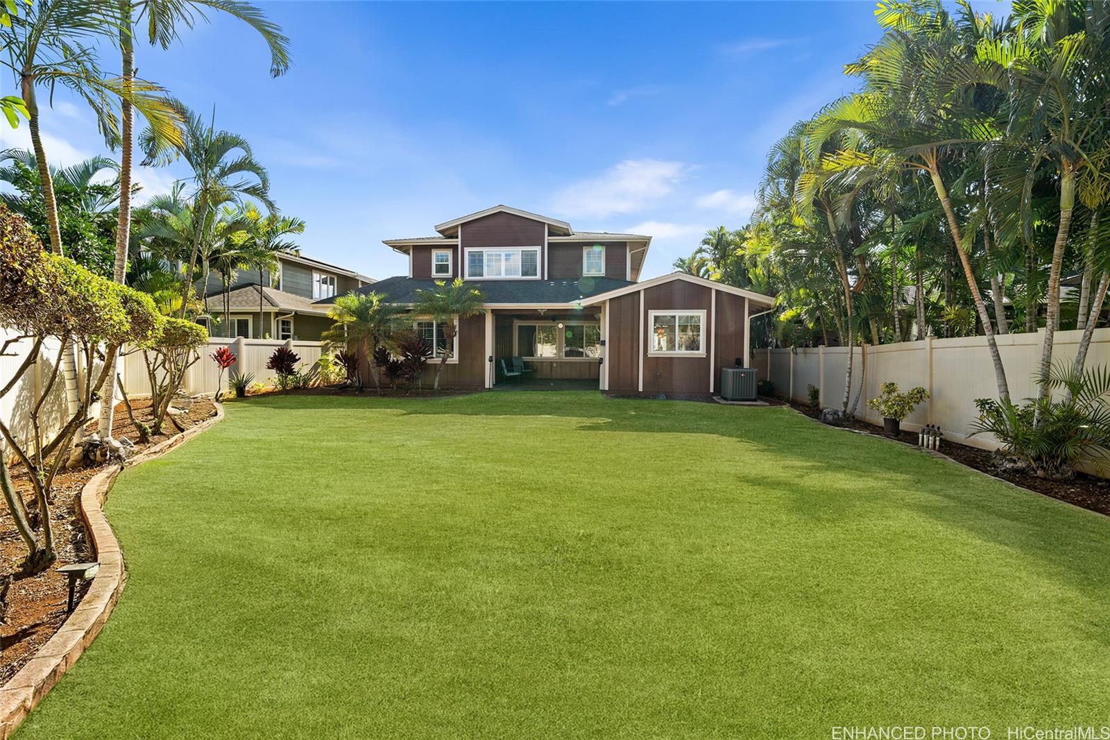 Escape to your own private oasis in this 4-bedroom, 3.5-bath home in the desirable Ewa by Gentry Haleakea neighborhood. This energy-efficient property features 23 owned PV panels, two Tesla batteries, solar water heater, and water filtration system, ensuring comfort and savings. Stay cool year-round with central AC. Enjoy the perfect blend of indoor and outdoor living with a beautifully covered lanai and a spacious backyard. A separate 1-bedroom, 1-bath casita offers a private space for guests or a home office. Located close to several nearby parks. This home combines modern amenities with a serene island lifestyle. Sold as-is.