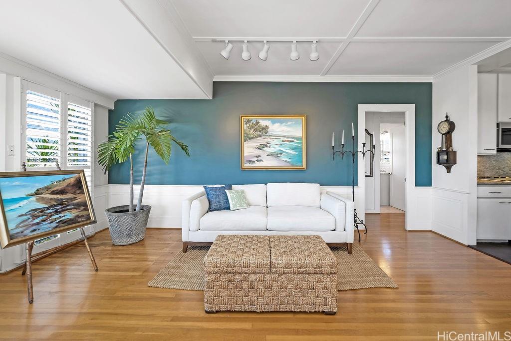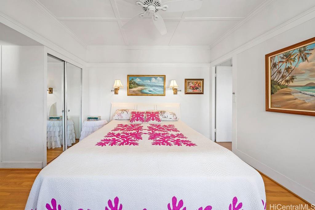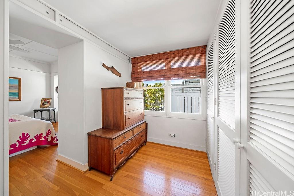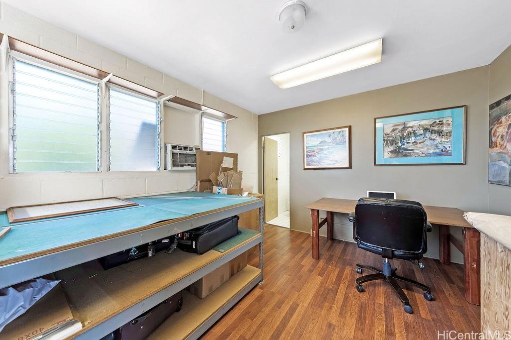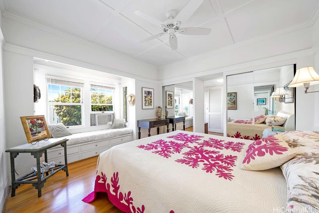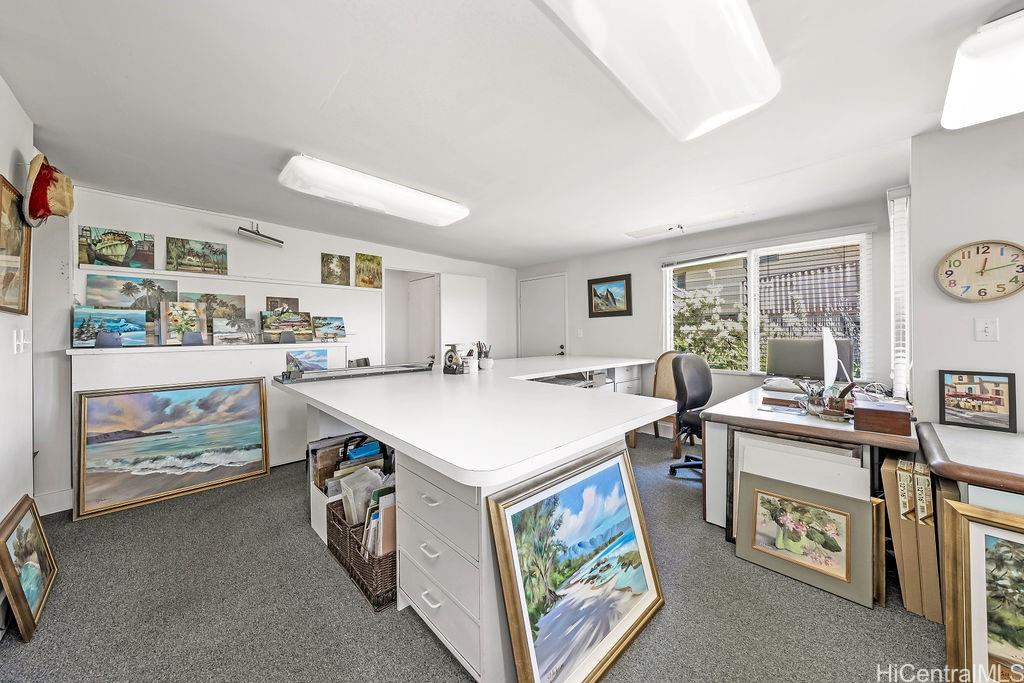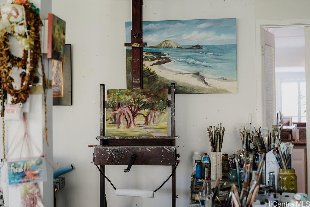 Airy living spaces invite in natural light and sweeping views of the ocean and Diamond Head, creating a setting as perfect for quiet mornings as for golden-hour gatherings. A versatile flex space offers endless options—ideal as an office, playroom, storage, or even a small studio—while the largest bedroom is currently activated as a professional art studio.