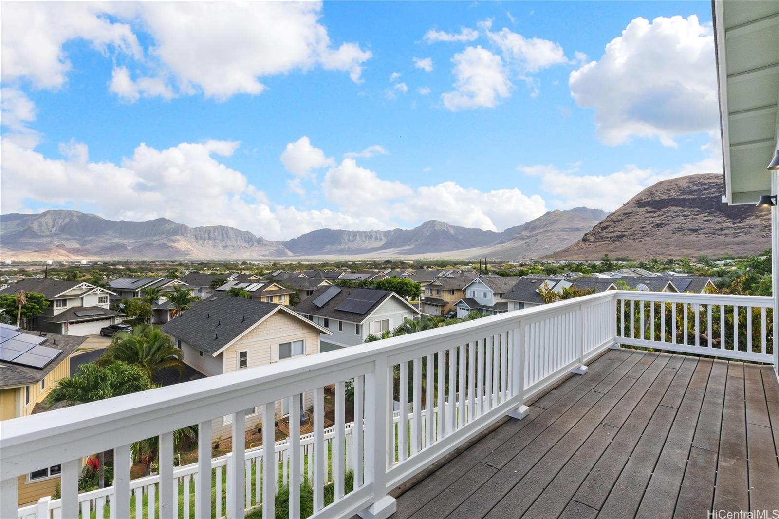 OCEAN VIEWS! Rare, large 5-bedroom, 3 bath 1,871 sq. ft. ocean view home located on a rim lot in Upper Pakeke St with no homes in front and panoramic mountain, ocean and sunset views behind. Built with upgraded DR Horton options including extra-large primary bedroom with walk-in closet, 144 sq ft deck with spectacular mountain, ocean and sunset views, and a covered downstairs patio. New roof installed in 2023, new refrigerator, remodeled custom tile shower, new baseboards, new garage door and motor, freshly painted interior, and exterior was painted in 2023. Central AC and fans throughout the home keep you cool, plus extra savings come from Solar Heater and (leased) Tesla PV System with a coveted HECO NEM (Net Metering) agreement. Serene cul-de-sac location. Sea Country is a lovely community with pool and recreation area, shops, park, and more. Maintenance fee includes front yard landscaping, sewer, water and trash. Near beaches and close to Kapolei, Oahu's "second city." Seller to credit Buyer $1,500 for deck resurfacing.