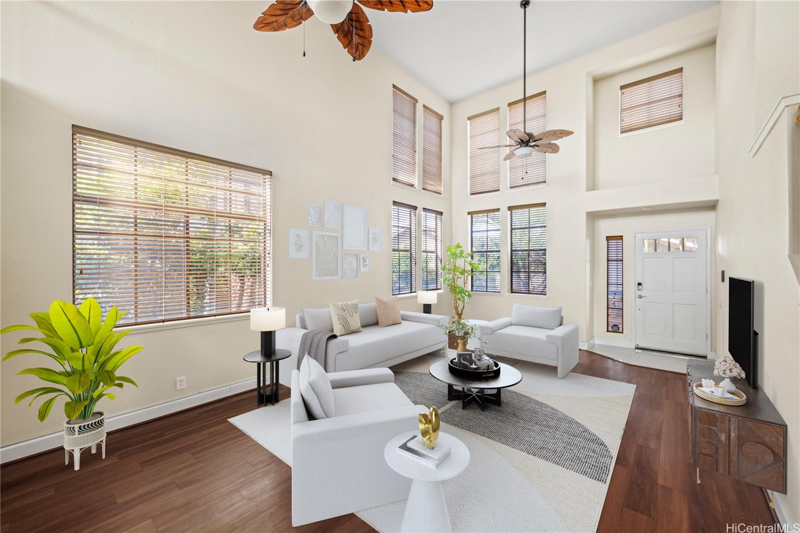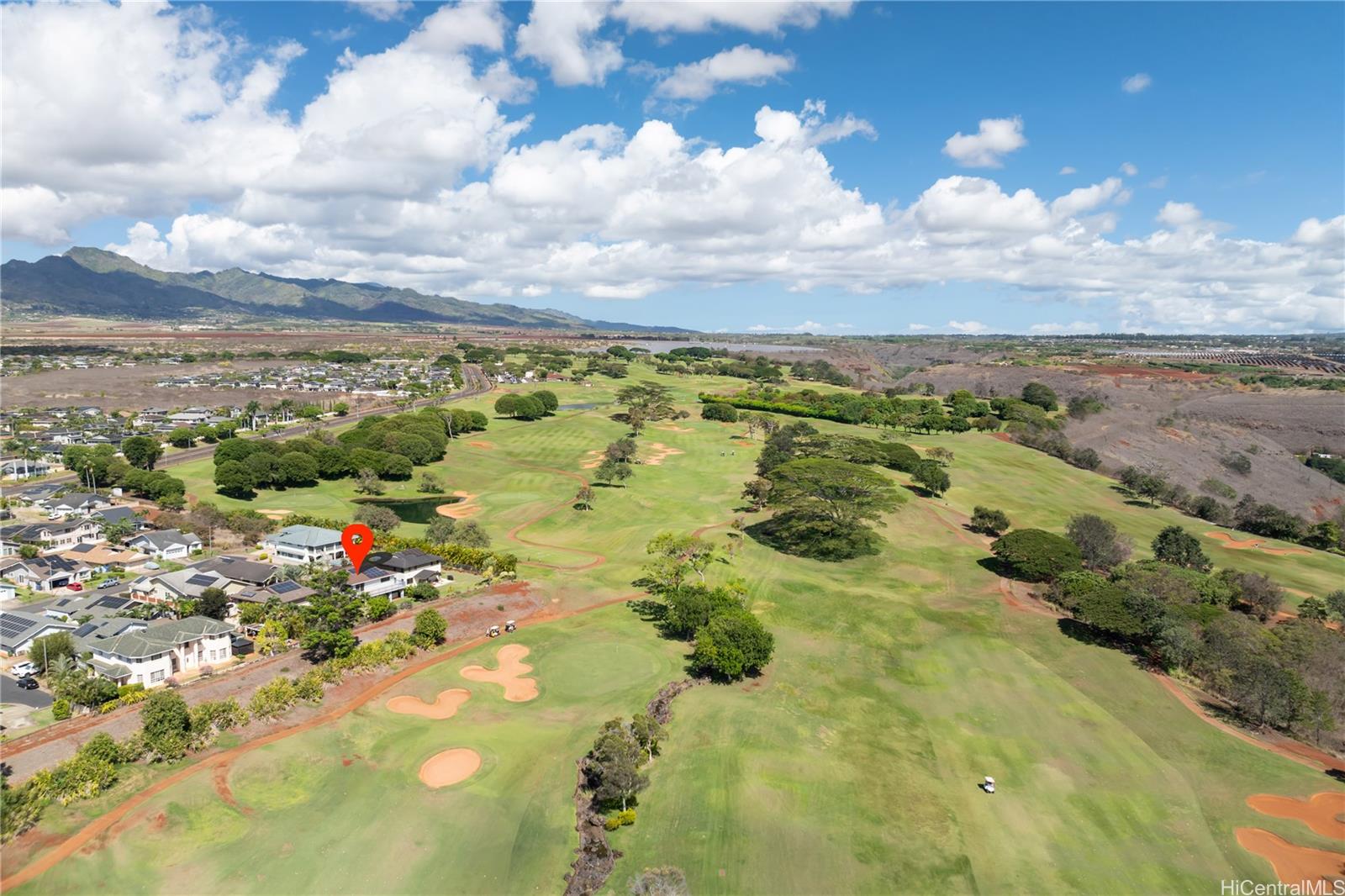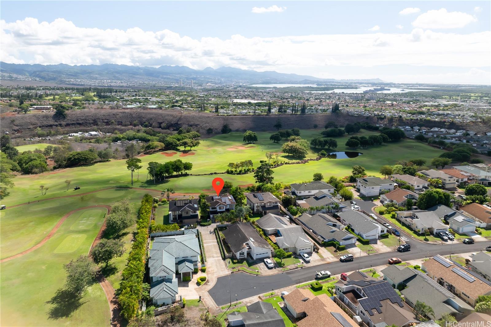 2.25% VA Assumable ($665,000) Seller to retain VA Benefits. Situated on a quiet cul-de-sac overlooking the 14th green of Royal Kunia Golf Course, this 3-bed, 3-bath home offers spectacular, panoramic views from Diamond Head to Pearl Harbor. Enjoy the scenery from both upper and lower lanais. Inside, find comfort and efficiency with split AC's and a money-saving Solar Electric system. The property includes a 2-vehicle garage and a lush, edible garden featuring mature mango, avocado, tangerine, chico, and lemon trees. Excellent outdoor living space with both upper and lower lanais, you have the perfect vantage point for savoring your morning coffee or entertaining guests against a stunning backdrop. Gaze out at the incredible, sweeping views of the Honolulu skyline, from the iconic silhouette of Diamond Head to the historic waters of Pearl Harbor.