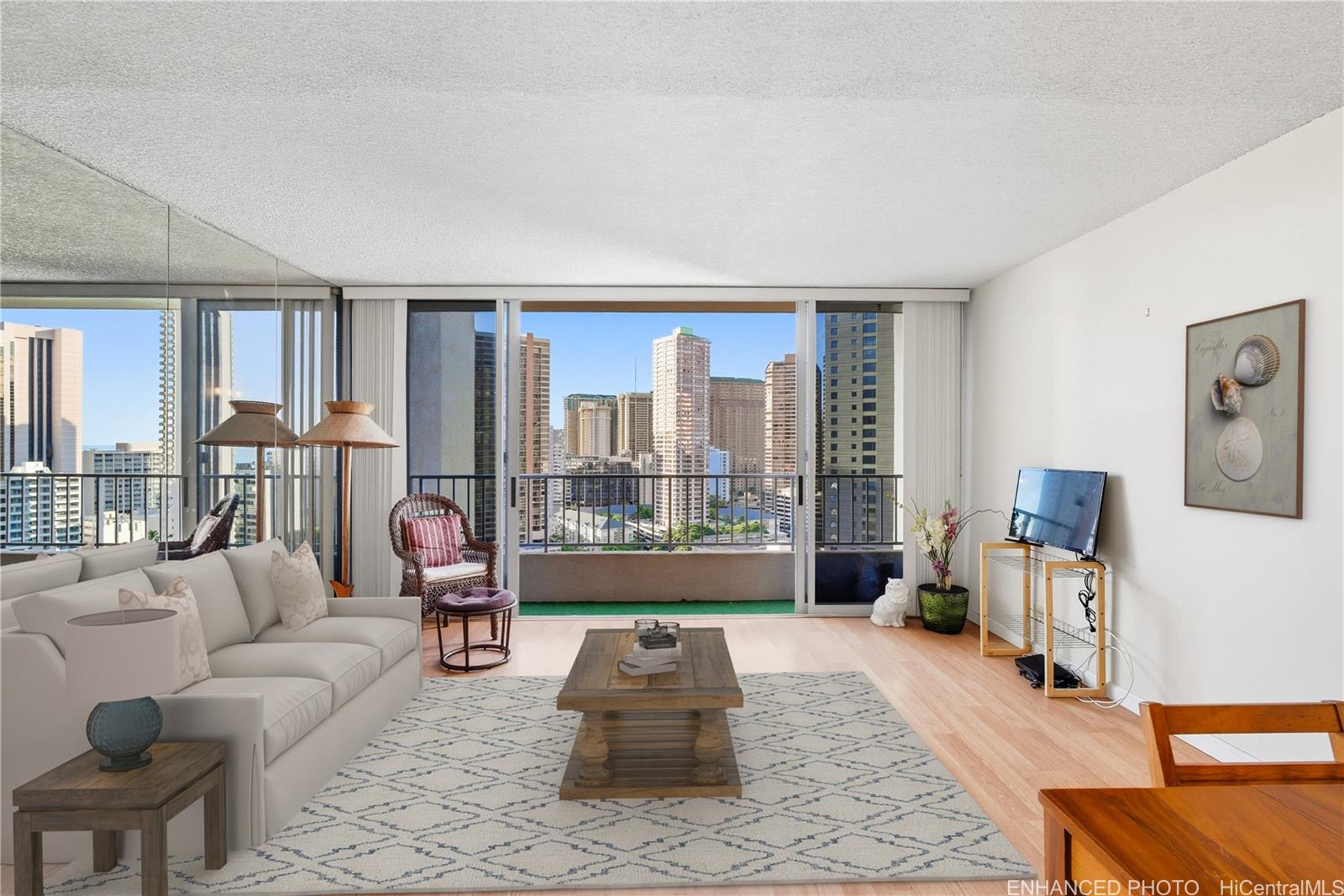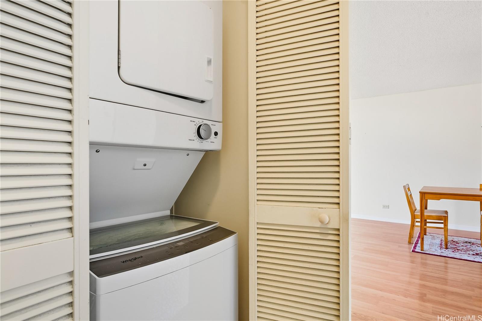 High Makai end unit with view of Ala Wai Canal and Harbor from lanai and kitchen window. Renovated kitchen, washer dryer, covered parking, guest parking, pet friendly, resident manager and security guard. Maintenance fee covers electricity WiFI, cable, water, sewer charges and hot water! BBQ area, pool, sauna and recreation deck. Very private yet next to the Convention center, close to Ala Moana Shopping Center, Waikiki and Magic Island. There's a keyed gate to the tree-lined walking path along the Ala Wai that leads to the Harbor
