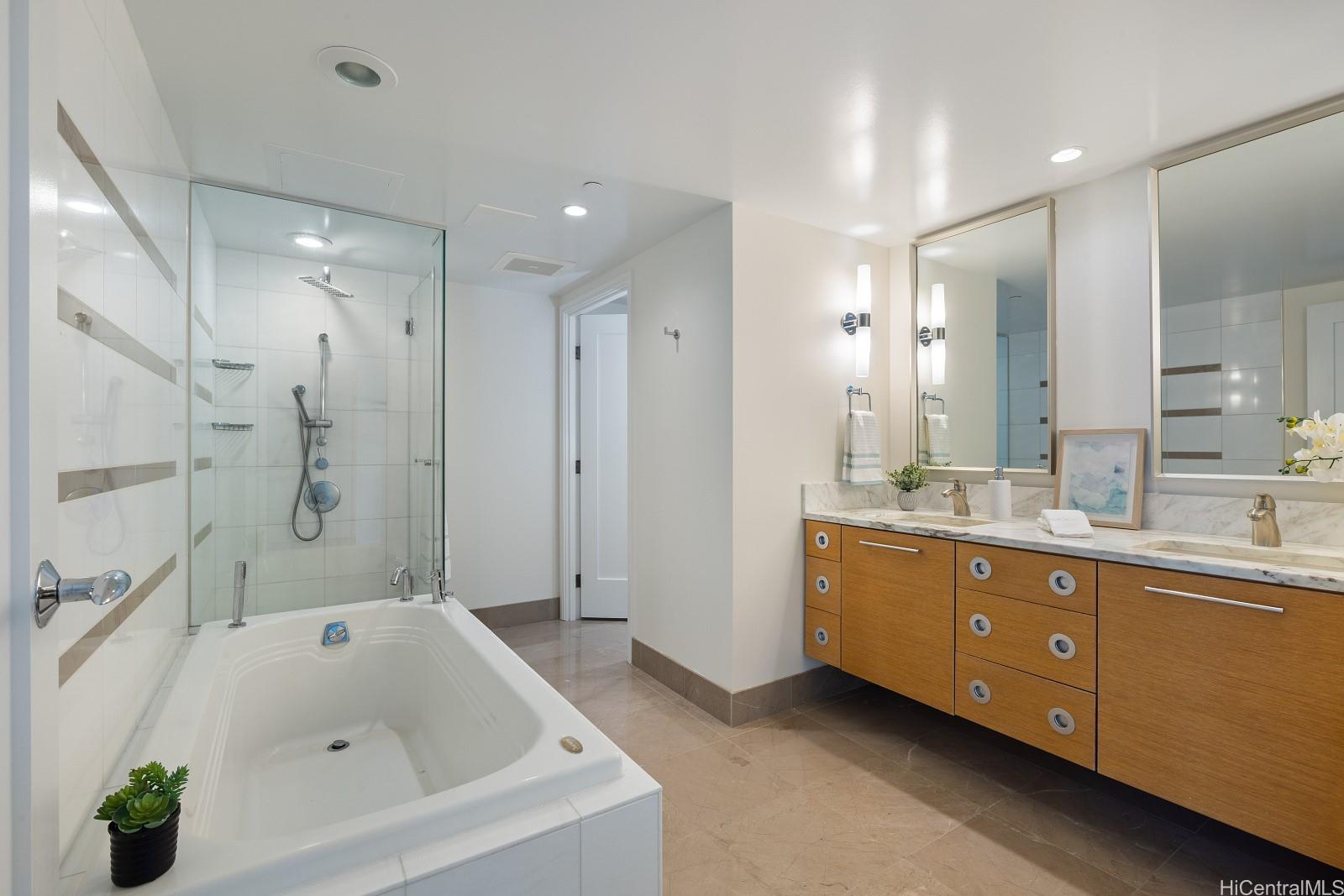KO'OLANI - live in the jewel of Kaka'ako. Prime 3 bedroom, 2 bath floor plan with stunning ocean & sunset views. Two full sized, side by side covered parking stalls conveniently located on the ground floor for easy access. Upgrades include engineered hardwood floors, Toto toilets with remote and auto lid, motorized window shades and custom closet system in the primary bedroom. Rarely available in a condo- Viking gas range, built-in refrigerator. New built-in microwave, newer dishwasher and front load washer/dryer. Brand new central A/C system and Nest controller for cool, comfortable living. Maintenance fee includes cable TV, gas, water, sewer, bldg insurance & common area maintenance. Amenities: heated saline pool, whirlpool, tennis courts, putting green, billiard room, movie/media room, business office, gas BBQ grills and gazebos, guest parking, full time staffed front desk & resident manager. Walking distance to Ala Moana Shopping Center, Ala Moana Beach Park, Foodland Farms, Whole Foods, restaurants, movie theaters, park and many more. Freshly painted and professionally cleaned. Ready to move in and enjoy living the life in Honolulu!