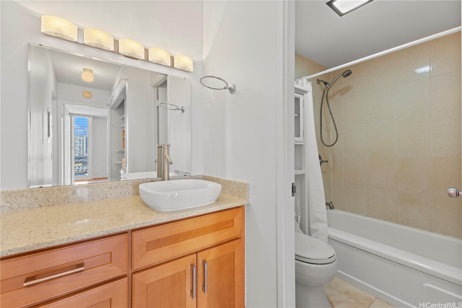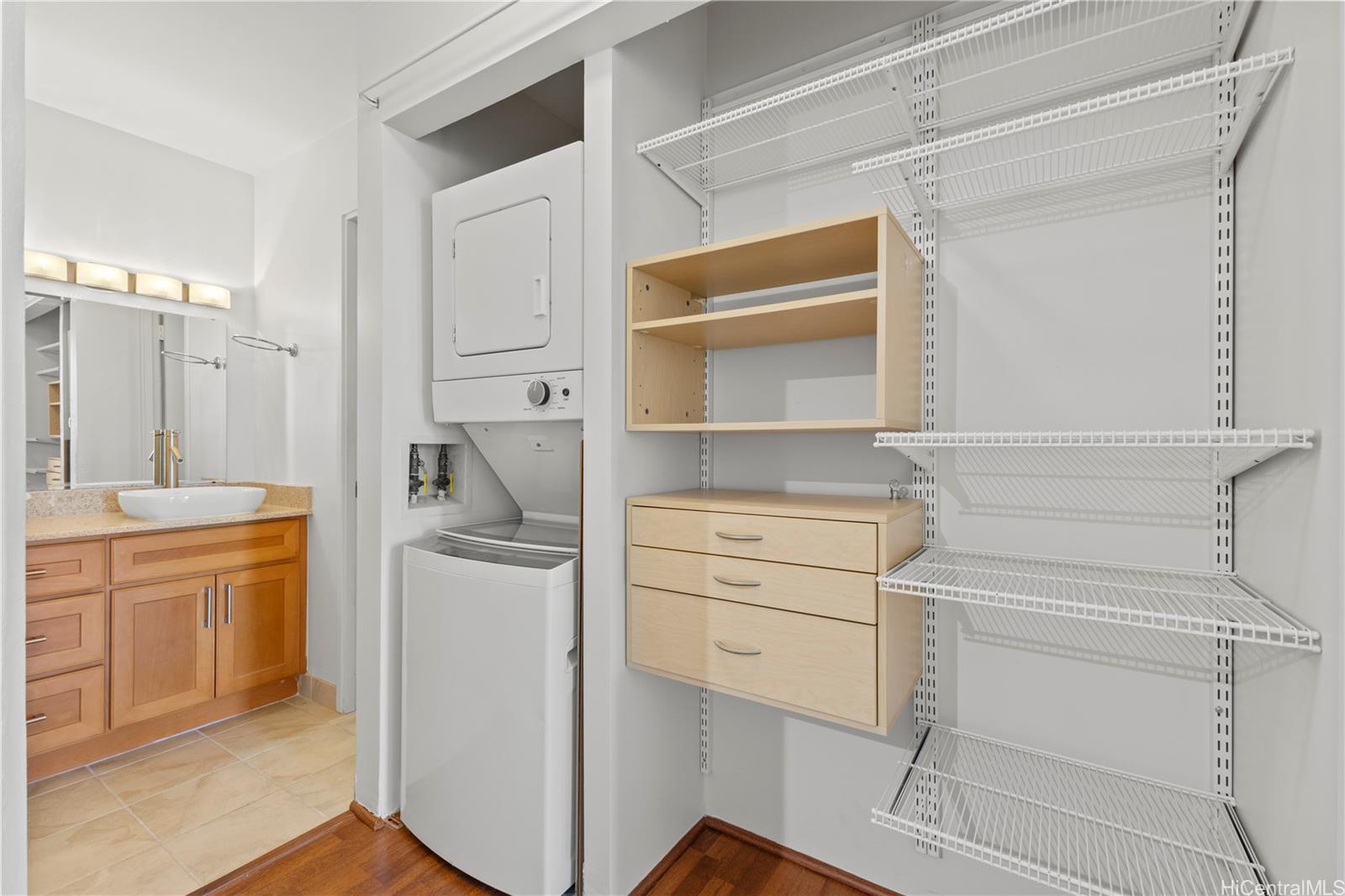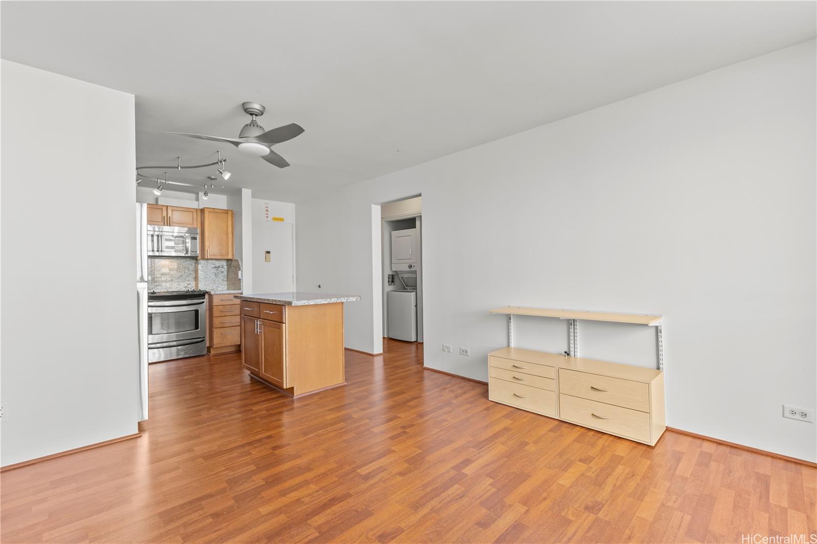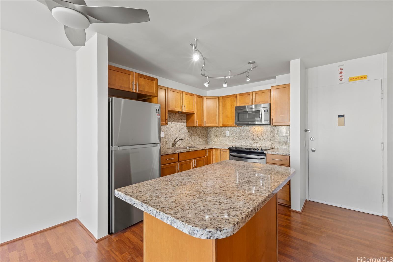 Discover the charm of Scenic Tower, where convenient Honolulu living awaits in the heart of Moiliili. This pet-friendly 1-bedroom, 1-bath residence has an open floor plan with a 56 sf covered lanai and windows allowing natural air flow. Features a beautifully renovated kitchen with granite countertops, ample cabinet space and an island to serve as your dining area. Upgraded with laminate flooring in the living room, kitchen & bedroom and ceramic tile flooring in the bathroom. Enjoy having a walk-in bedroom closet, stacked washer & dryer, along with additional hallway closet space. Relax poolside, entertain in your covered recreation area boarded by a green lawn, and feel at ease with your resident manager Comes with 1 secure, covered parking space. Conveniently located minutes to Waikiki, Ala Moana Shopping Center and the University of Hawaii at Manoa.