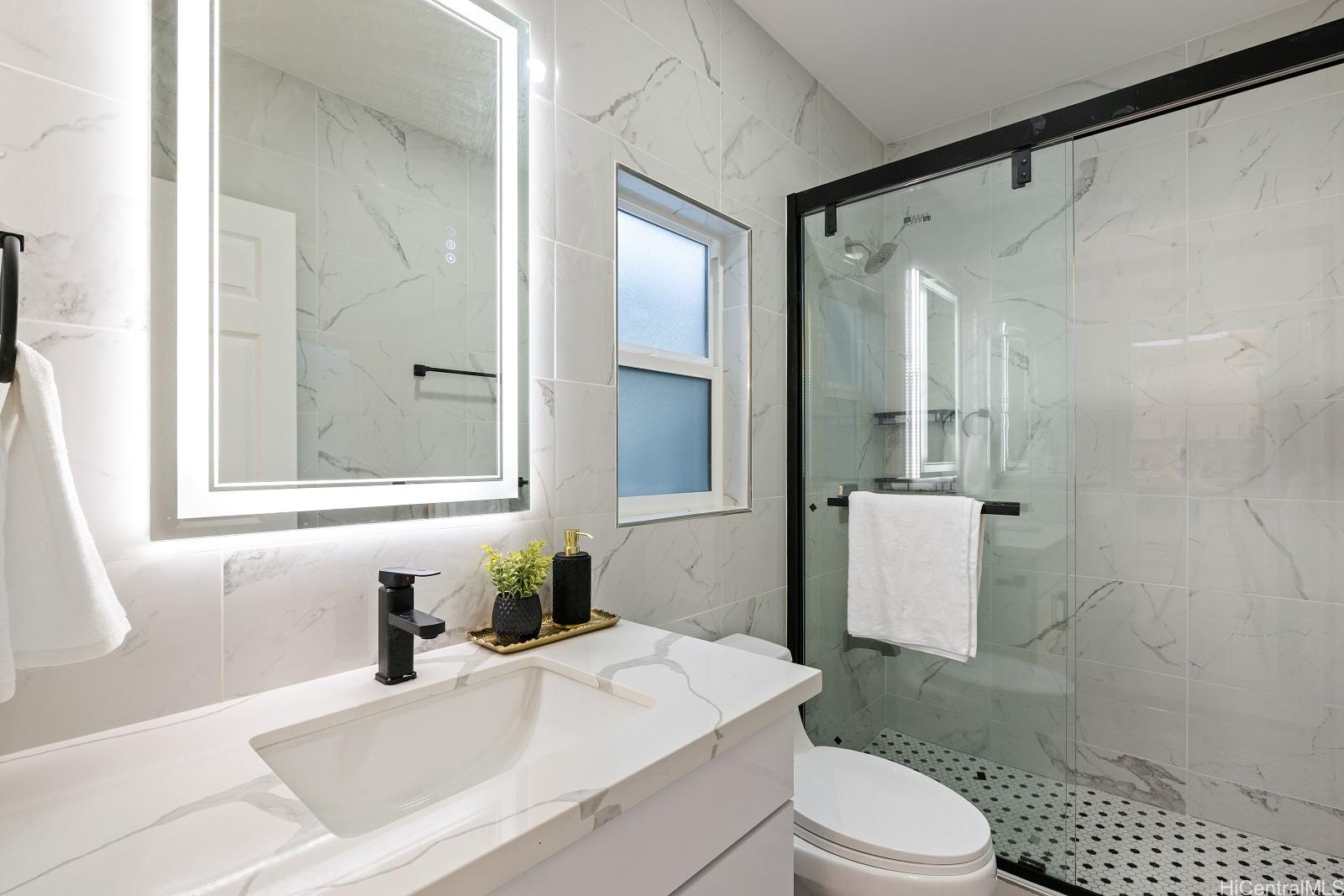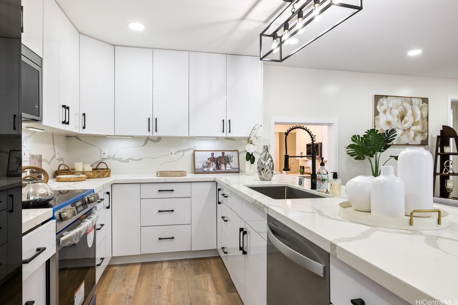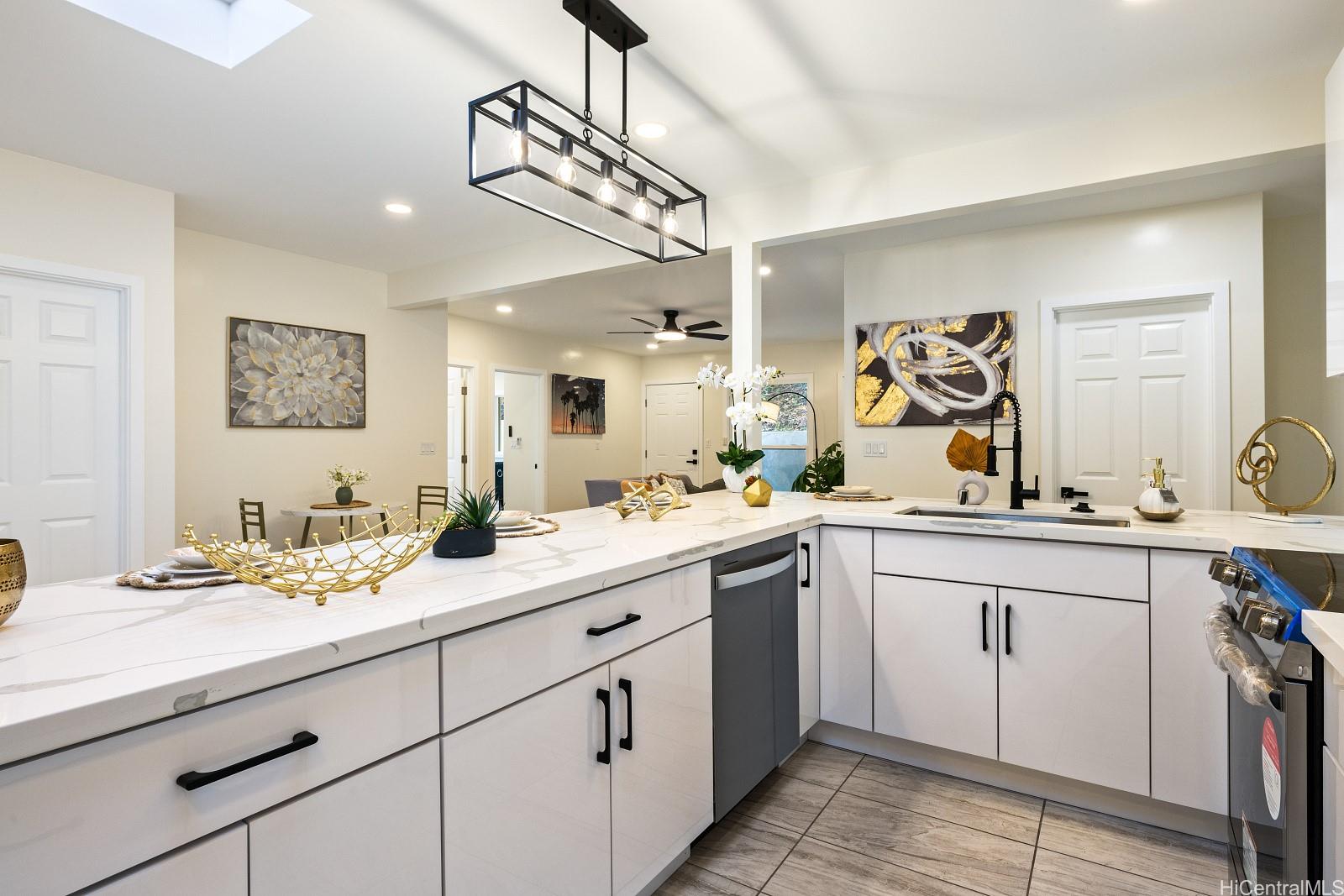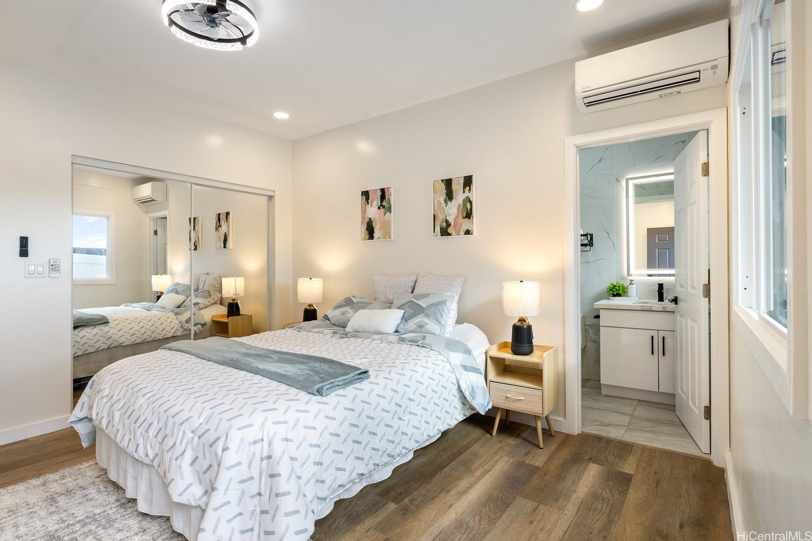 Discover this beautifully renovated 7-bedroom, 4-bath luxury home tucked away in the peaceful heart of Kalihi Valley. This rare property blends modern comfort, island charm, and multi-family versatility. Enjoy two spacious living rooms and two fully equipped kitchens with brand-new stainless steel appliances, stylish laminate flooring, and a chef’s dream U-shaped island. Each bedroom has its own split A/C for year-round comfort. Meticulously updated by a licensed contractor with proper permits, this home includes new electrical wiring and plumbing. Designed for flexibility, it offers three separate entrances—ideal for multi-family living or rental opportunities. Energy-efficient solar hot water heating adds sustainability and lowers costs. Relax or entertain on the rooftop terrace with breathtaking mountain views—perfect for yoga, barbecues, or stargazing. Outside, a tropical garden with lush greenery, vibrant flowers, two mature mango trees, and an automatic irrigation system creates your island retreat. Additional highlights include four parking stalls, ample street parking, and a quiet cul-de-sac minutes from schools, shopping, and freeway access.