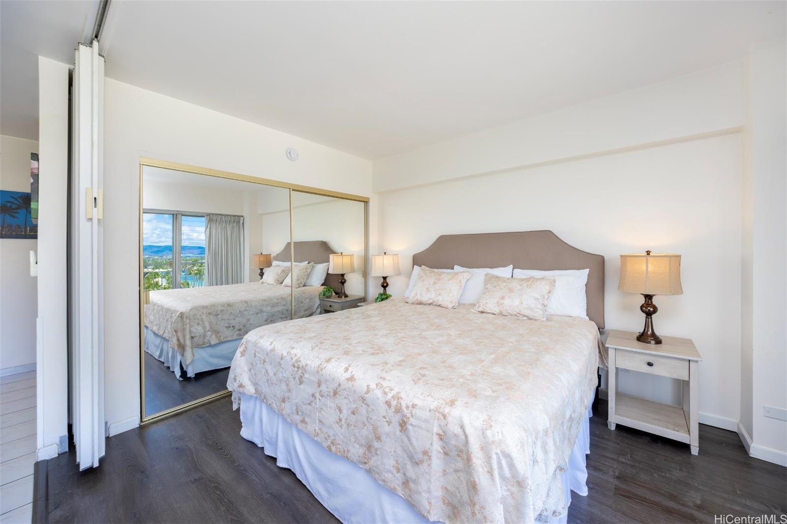Welcome home to Waikiki Shore, one of Honolulu's most iconic oceanfront condominium destinations. Situated along Waikiki Beach, this unrivaled location puts sandy beaches, verdant parks, dining, shopping, entertainment and more at your doorstep. This higher-floor 1-bedroom, 1-bath, 706 sq.ft. residence with a spacious 124 sq.ft. lanai enjoys dynamic 180-degree panoramic views stretching from the Pacific Ocean, along Waikiki Beach and DeRussy Park, to Waikiki and the majestic Koolau Mountains. The interior has been updated with a split A/C system, modernized kitchen and bathroom spaces, upgraded flooring, lighting, and more. Property qualifies for daily short-term rental, great for investment, second home, or primary residence. Discover unparalleled beachfront island living at Waikiki Shore. Listing includes enhanced, zoomed-in photos.