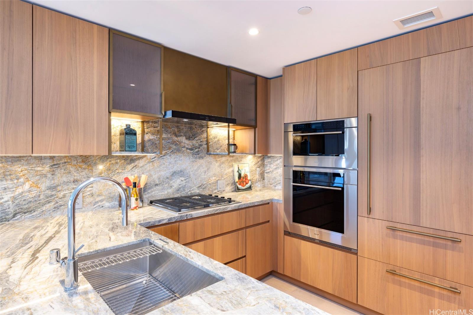 Victoria Place stands as an icon of ultra-luxe condominium living in Honolulu, coveted for its elevated resort amenities, boutique service, and proximity to beaches, parks, shops, and restaurants. This 2-bedroom, 2-bath residence delivers refined luxury living throughout its 1,107 sq.ft. modern-design floor plan, with Pacific Ocean and Boat Harbor views from the living room and both bedrooms. A chef's kitchen with top-of-the-line Sub-Zero and Wolf appliances and elegant marble-wrapped bar seating connects with the primary living room, offering a modern luxury lifestyle experience. The primary bedroom suite includes a walk-in closet, and a resort ensuite bath with walk-in shower room and deep soaking tub. Enjoy world-class amenities including 3 pools, a state-of-the-art fitness center, spas, outdoor cabanas, BBQ areas, a wine cave, a chef's kitchen, a private dining room, a theater room, a media room, and guest suites. Elevated luxury, in the heart of Honolulu: Welcome home to Victoria Place #903.