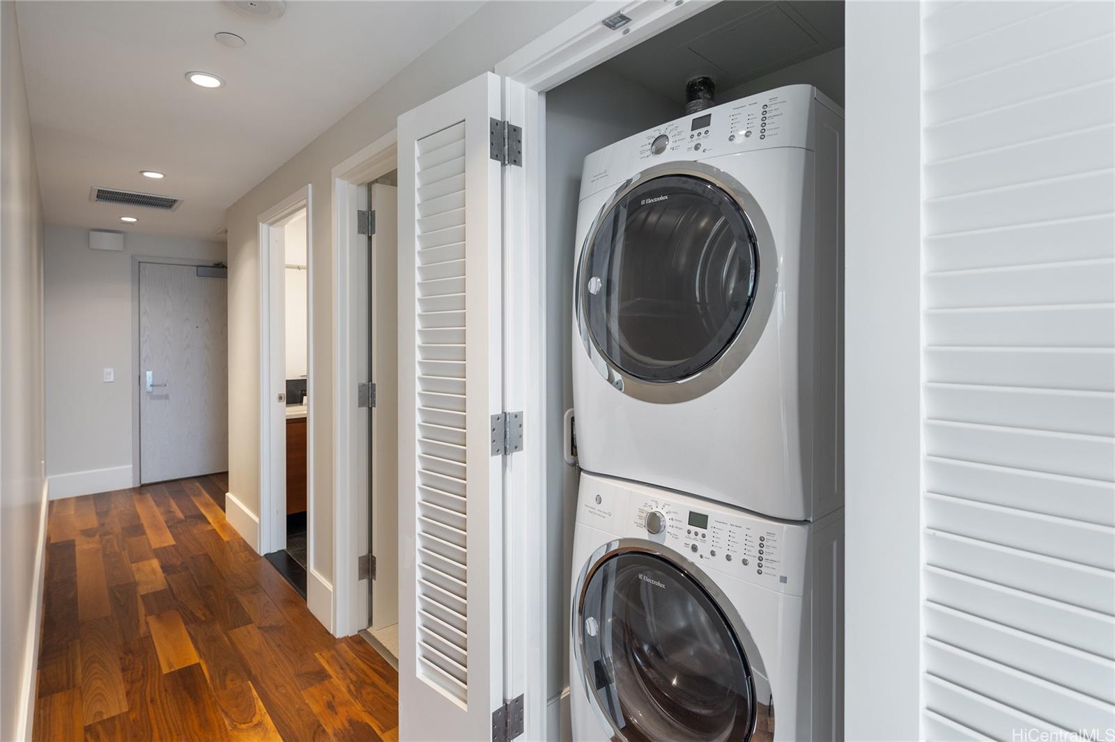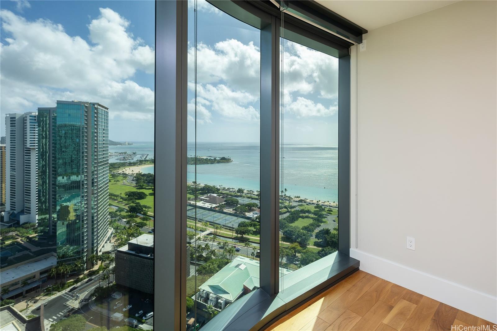 Fall in love with this luxurious, much preferred, corner unit boasting panoramic views of the beach, ocean and mountains. Floor-to-ceiling glass wraps around the living area, offering breathtaking vistas and inviting cool breezes. High ceilings and wide sliding doors create a bright and airy atmosphere. The gourmet kitchen features top-of-the-line Miele appliances, including a gas stovetop and a wine refrigerator, perfect for the discerning chef. High-quality finishes abound, with quartz countertops, hardwood floors, newer carpet in the bedroom and recently painted throughout. This private corner unit offers ample storage, including a walk-in closet. Unwind in the world-class amenities, including a stunning cantilevered glass bottom pool, a hot tub, a private theater, a tennis court, a fitness center, multiple entertainment areas with chef's kitchens and much more. Beyond the building, enjoy the vibrant Ward Village community with its shops, restaurants, and being right next door to Whole Foods Market. Ala Moana Beach Park is across the street, offering endless opportunities for outdoor activities. A must see for anyone looking to purchase a luxury one-bedroom in Ward Village.