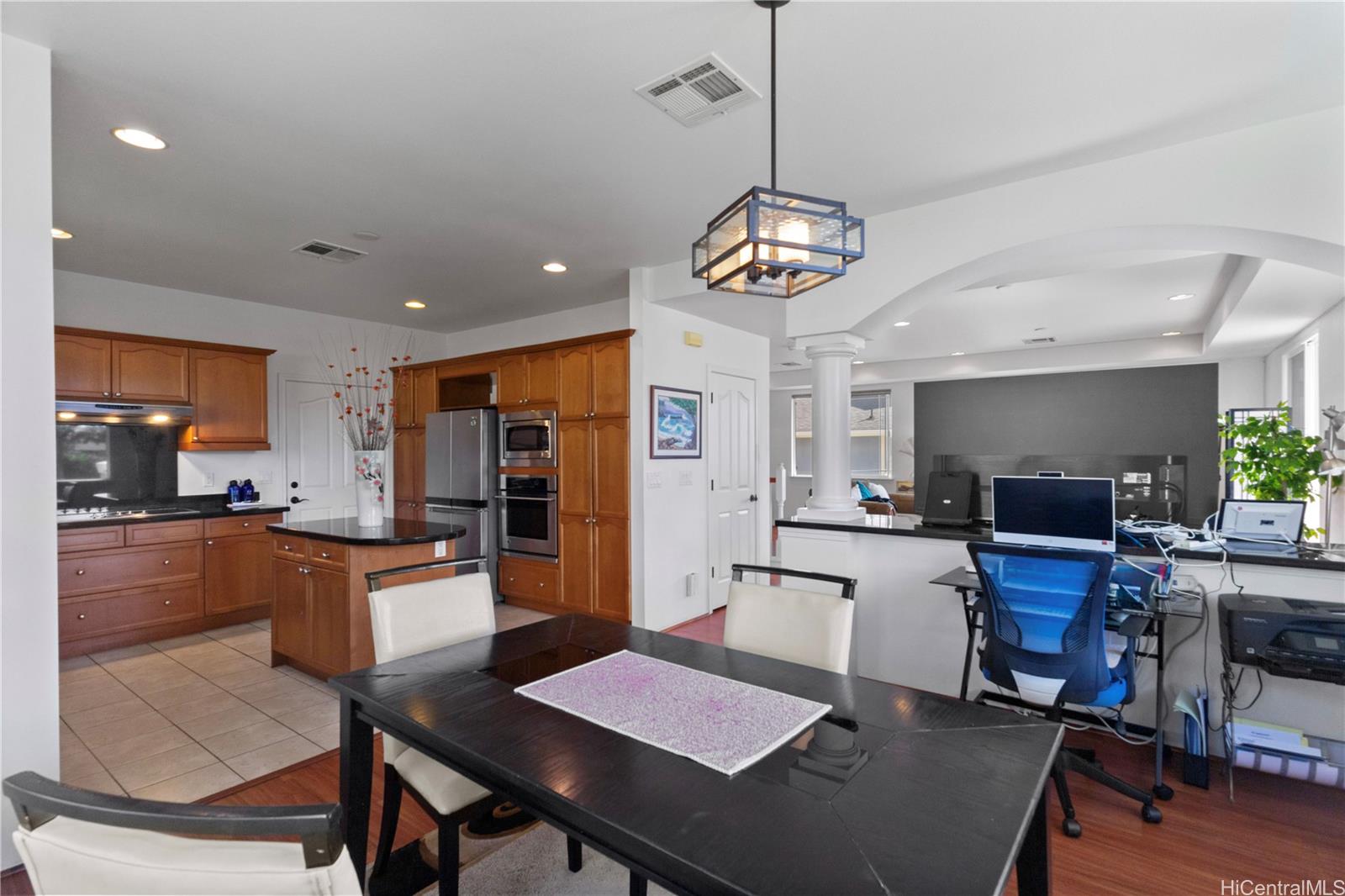 Open Houses 11/22-11/23 2-5PM. First time on the market! This stunning 3-bed, 2.5-bath residence on a sought-after Makakilo rim lot in Hoolu Landing is a rare find, especially with a massive financial bonus: an assumable VA Loan at an incredible 2.25% (PITI approx. $2,695), open to both VA and non-VA buyers! Be instantly greeted by ocean and mountain views visible from two spacious lanais. The upper level features a bright, open-concept layout seamlessly blending the living room, dining area, and huge kitchen—perfect for entertaining. Downstairs, the primary suite offers a walk-in closet, jetted soaker tub, and a private lanai to enjoy the views. 14 owned PV panels keep the electric bill low. Located near the end of a quiet street with guest parking and a large neighborhood park. This is an opportunity you won't want to miss! Current loan balance 509k. Ask about financing for the gap. NO PRIVATE SHOWINGS. OPEN HOUSE ONLY. Maintenance Fee includes landscaping, water, sewer, insurance, road maintenance, utilities for the common areas.