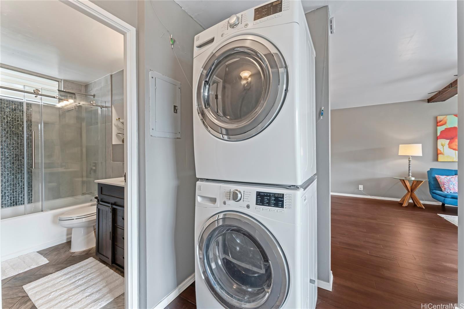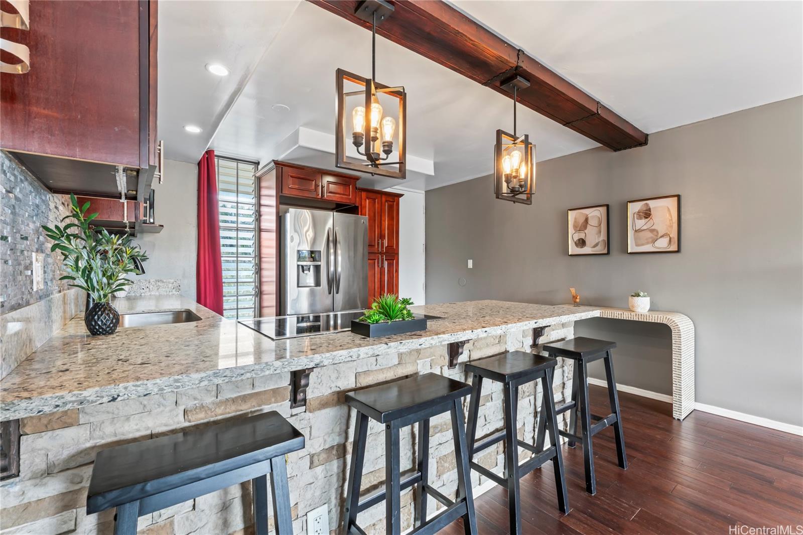ユニークに改装されたこの2ベッドルーム、1バスルーム、2台分の駐車スペース(1台は屋根付き)のコンドミニアムからは、木々のそよ風と素晴らしい渓谷の景色を楽しめます。室内ランドリー(キッチンではなく廊下にあります)と外部収納スペースがあります。キッチンには、アップグレードされたキャビネットと電化製品、石のカウンタートップとバックスプラッシュ、ペンダントライト、リビングルームを見渡せる朝食バーがあります。リビングルームは木製の梁天井で、シーリングファンがあり、風通しの良い素晴らしい景色(プールも見えます!)を楽しめるベランダに出られます。収納エリアは約6フィート×6フィートで、9階にあります。指定駐車スペースは2つあり、2階に屋根付き1台、3階に屋根なし1台です。駐車スペースからユニットに行くのに階段を上る必要はありません。どちらのスペースにも建物への歩道橋があります。管理費には、下水、水道、ゴミ処理、ケーブルテレビ、インターネットが含まれますHMRまで15分。JBPHHまで25分。フォート・シャフター/キャンプ・スミスまで30分。*学区はハワイ州教育省の学校検索ウェブサイトより取得。購入者はご確認ください。