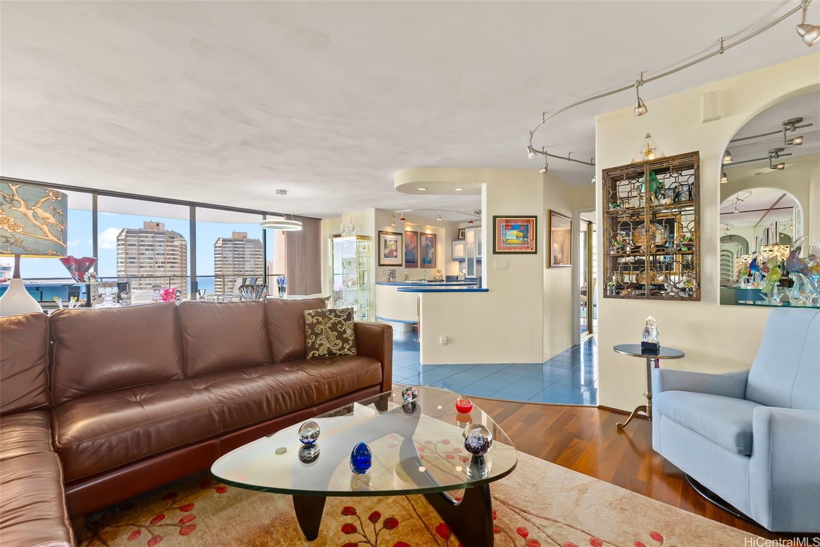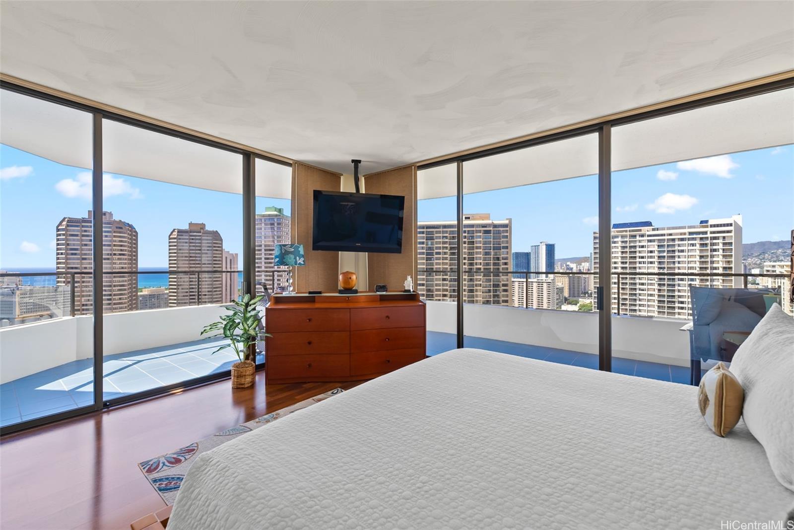 Residence #32A commands one of the most dramatic vantage points in all of Honolulu. Perched on the 32nd floor, where the exclusive penthouse collection begins, & spanning the full width of the building, this prized corner unit showcases nearly 270° of unobstructed, panoramic views—from Diamond Head to the ocean, mountains, & city lights. Enjoy a one-of-a-kind, multi–million dollar view experience from every room and 2 wrap around lanais that no other Hawaii home can offer. With its rare east-to-west orientation, #32A captures sunrise to sunset views & provides a front-row seat to the weekly Friday night fireworks show. Designed by acclaimed interior designer Glenda Anderson & thoughtfully updated over the years, every detail of this residence has been meticulously planned & beautifully executed. Exceptionally located within moments to world famous Waikiki beach, & the dining, entertainment, & recreational hub of the Pacific. All furnishings & a car are available at no cost for a truly turn-key, move-in ready purchase. Amenities include a pool, spa/sauna, BBQ, & pickleball court. Pet-friendly (2 pets ok). Bldg. allows min. 30 day rental. HOA includes all utilities. Sold AS-IS.
