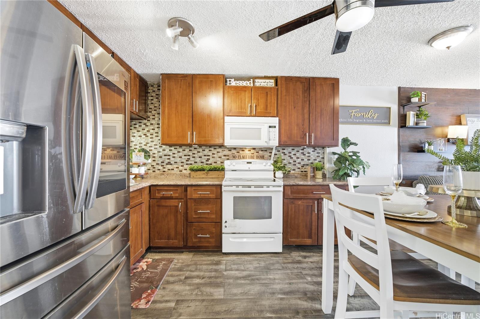 Remodeled Townhome with Ocean Views & Private Courtyard in Makakilo Gardens! Experience the perfect blend of style, comfort, and island living in this beautifully updated 3-bedroom, 1.5-bath townhome—just steps from the community pool and playground. The upgraded main level features an open living/dining area with modern flooring, fresh finishes, and seamless access to your private fenced courtyard, ideal for entertaining, BBQs, outdoor dining, or a secure play area for pets and keiki. The remodeled kitchen includes refreshed cabinetry, upgraded appliances, and efficient counter space for everyday cooking. Upstairs offers three bright bedrooms, updated lighting, and an improved full bathroom with contemporary touches. Additional perks include in-unit laundry and thoughtful renovations that enhance both function and style. Enjoy cool Makakilo breezes with ocean and coastline views, plus quick access to Kapolei’s shopping, dining, schools, and freeway routes. Pet-friendly, move-in ready, and an incredible remodeled value on O?ahu’s west side. Homes like this don’t last—schedule your private tour today!