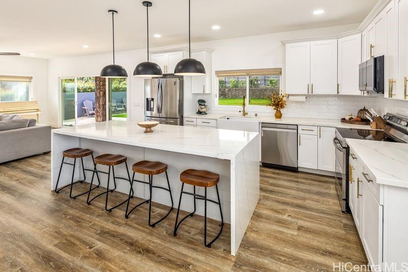 11月22日(土)午前9時から午後12時までオープンハウス。この家はMLS#202525871と併せて販売されます。息を呑むようなコオラウ山脈の麓にそびえるこのハウウラの物件は、モダンな快適さを備えた穏やかな島のライフスタイルを提供します。この家には設備の整った3つの寝室と2つの浴室があり、流れと機能性の両方を高めるオープンフロアプランを中心に設計されています。大きな窓とスライドドアから自然光がリビングスペースに取り込まれ、毎日の暮らしや家での静かなひとときに最適な明るく元気な雰囲気が生まれます。家の後ろには、穏やかな緑と山の景色に囲まれた広々とした裏庭が広がっています。この広々としたエリアは、集まりや週末のバーベキュー、または単に島のそよ風を楽しみながら自分だけの屋外のオアシスを作るのに最適です。現代的な設備、最新の家電製品、そして効率的な冷却システムは、新築ならではの快適さと利便性を反映しています。キッチンには洗練されたクォーツカウンターが備わり、スタイリッシュさと耐久性を兼ね備え、調理、接客、そして食事のための十分な作業スペースを提供します。
