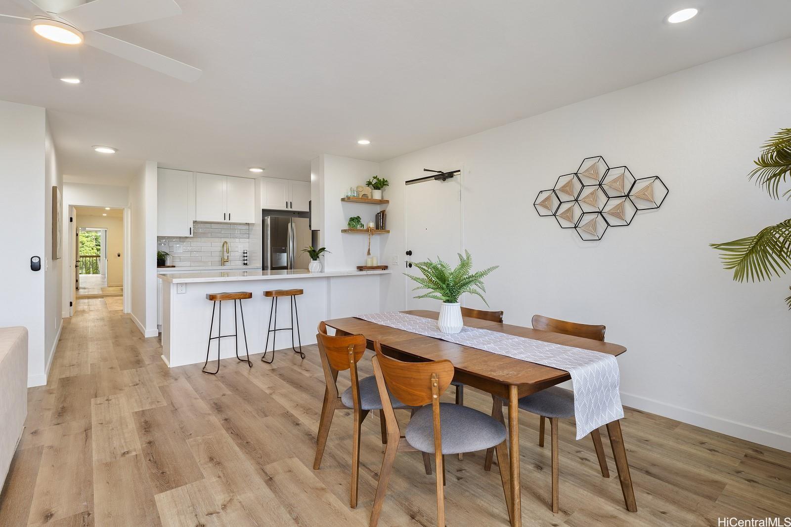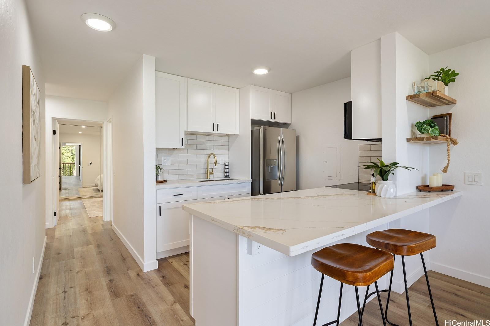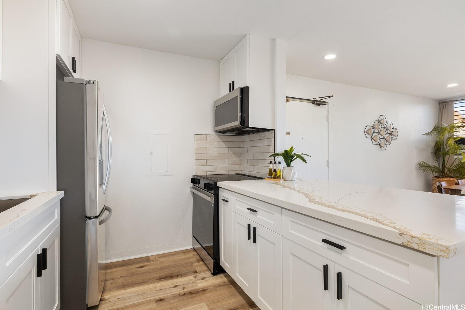 Don't miss this fully renovated, turn-key 3-bedroom, 1-bath townhome, just 5 minutes from the world-famous Makaha Beach! Three-bedroom units are rarely available—especially in move-in-ready condition. This spacious home features luxury vinyl plank flooring throughout, quartz countertops in the kitchen and bathroom, brand-new appliances, and abundant cabinet and storage space—perfect for full-time living or a vacation retreat. Enjoy the convenience of TWO assigned parking stalls and a full range of resort-style amenities, including multiple swimming pools, spas, children’s wading pools, a self-serve car wash station, tennis/pickleball courts, and a basketball court. Situated in a lush, beautifully landscaped gated community with 24/7 security patrol, Makaha Valley Plantation offers peace of mind and the true island lifestyle. Schedule your private showing today—this rare opportunity won’t last!