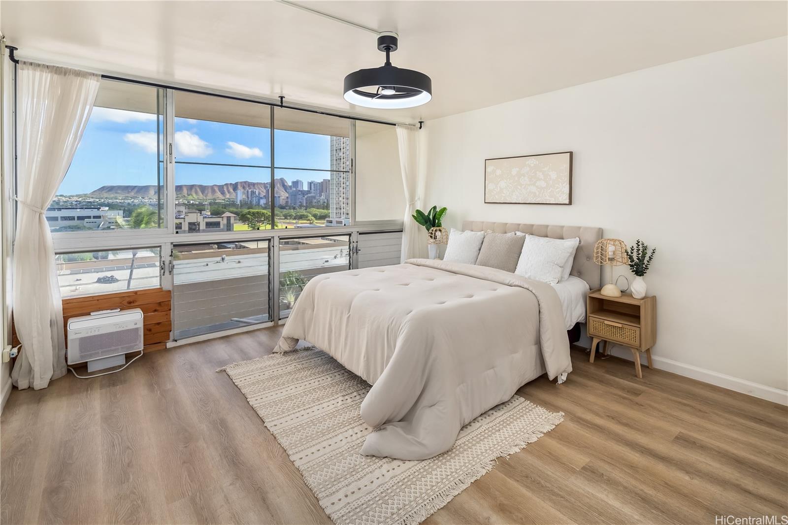Stunning 2-bedroom, 2 & 1/2 bath AND 2 parking (#302 & #736) with extended lanai and elegant arched window that frames a gorgeous full Diamond Head view — a rare find! Natural sunlight floods the interior all day long, creating a warm, inviting atmosphere. Enjoy modern comfort with luxury vinyl tile flooring throughout, fresh paint, and no popcorn ceiling (clean, updated finish). Inside, the thoughtful layout offers generous living space, ideal for relaxing or entertaining. As part of Ala Wai Plaza, you benefit from resort-style amenities including a pool, fitness center, BBQ and recreation areas, 24-hour security, on-site resident management, bike & surfboard storage, extra space storage and more — all within a well-maintained, pet-friendly building. Located just minutes from top destinations — whether it’s the beach, shopping at Ala Moana Shopping Center, or the shops and dining of Waikiki — this unit offers the perfect blend of comfort, convenience, and the iconic Hawaiian lifestyle. Don’t miss this bright, tranquil retreat with unbeatable Diamond Head views!