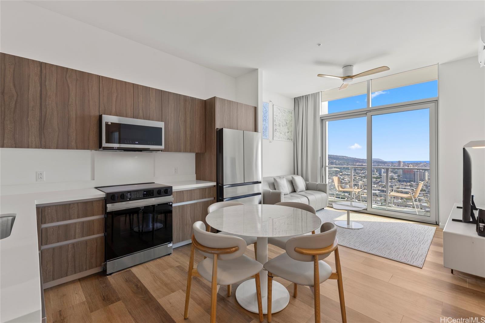 Turnkey Penthouse Residence – Move-In Ready This stunning penthouse features soaring 10’6” ceilings—exclusive to the top floor—and panoramic views of Diamond Head, the Ala Wai Canal, lush mountains, the Pacific Ocean, and sparkling city lights. The bathroom has been upgraded with a TOTO Washlet, adding enhanced comfort and convenience. Ideally located near Ala Moana Shopping Center, Walmart, and Don Quijote, with commercial spaces planned for the lower floors to further elevate daily convenience. On the 14th-floor amenity deck, enjoy a 29-meter infinity pool, multiple BBQ cabanas, a spacious fitness center, co-working areas, and a large sauna—offering true resort-style living in the heart of Honolulu.