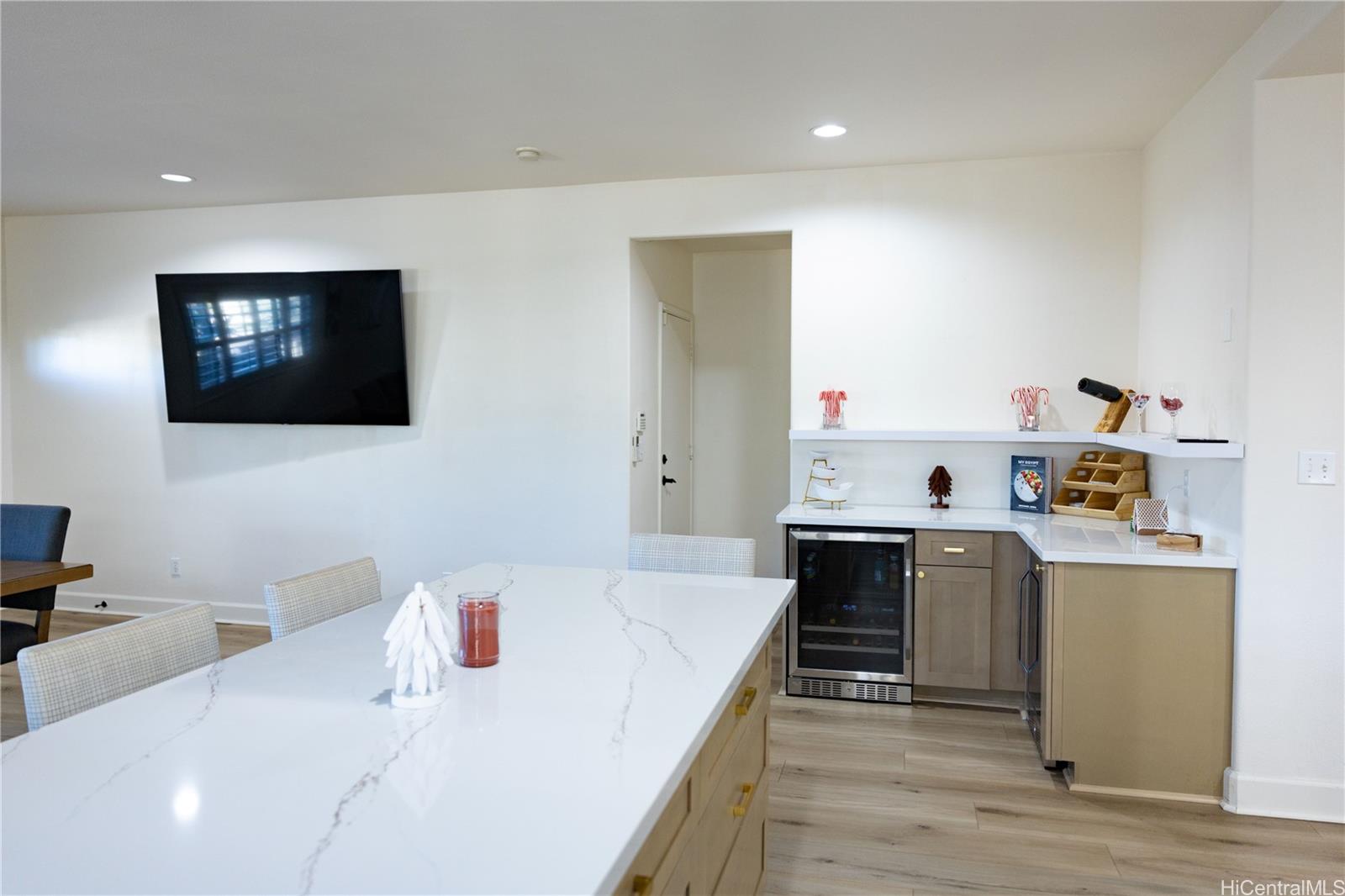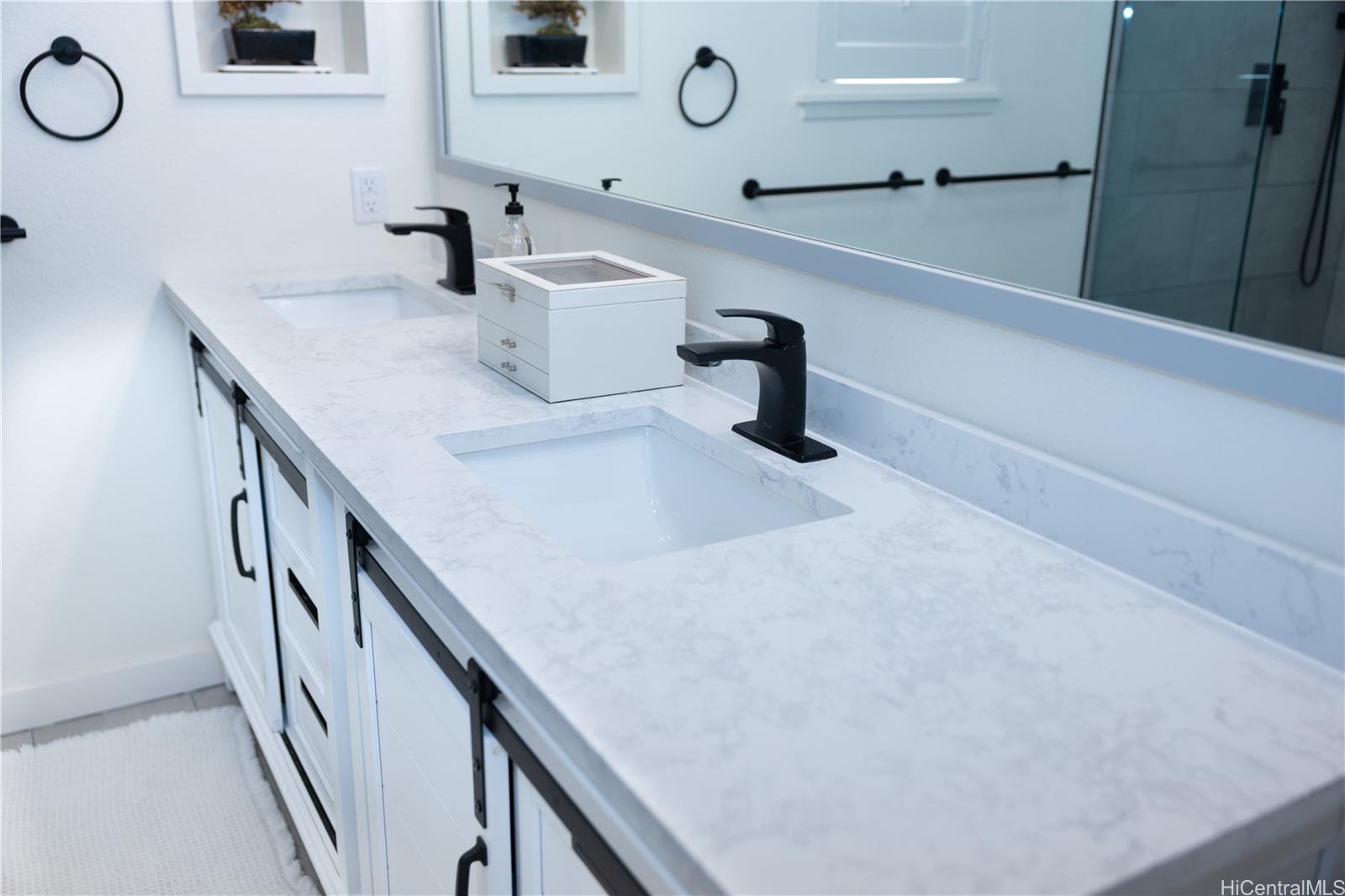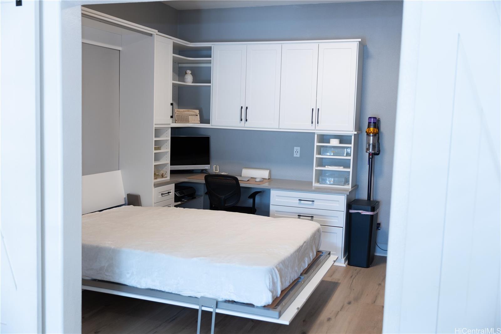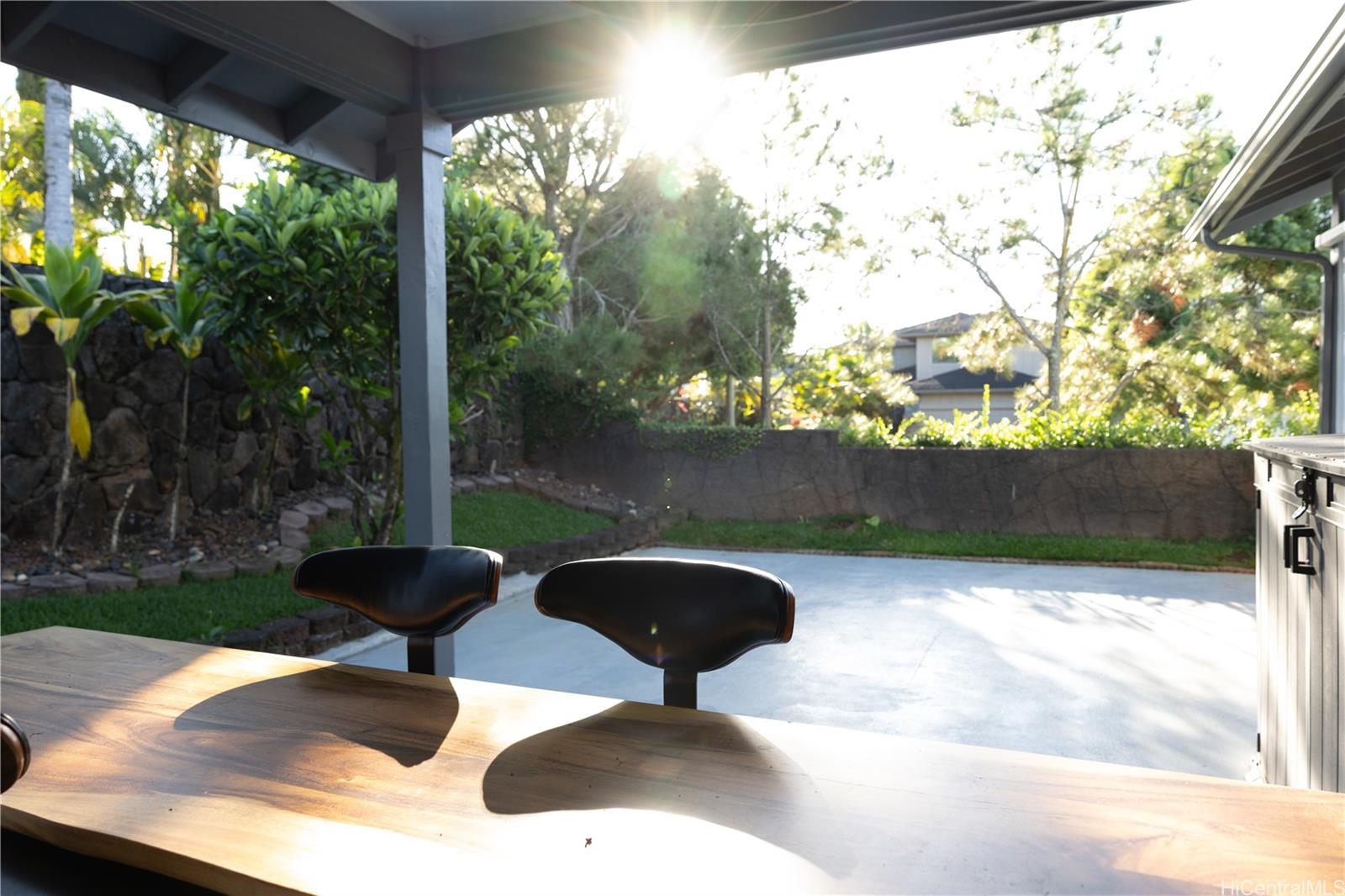 Just a short walk to Mililani Elementary and Middle Schools and Rec Ctr 7. This single story home has a versatile den, tastefully renovated with modern comfort, island charm, with true family living in mind. As you step inside, you're greeted by an elegant dining area and a stunning brand new kitchen - complete with a spacious island, corner coffee bar, and beautiful finishes throughout. The kitchen flows seamlessly into a large family room, highlighted by vaulted ceilings. The den is a thoughtfully designed as a multi-purpose room featuring custom cabinetry and a Murphy bed. Perfect as a home office, laundry room, or guest retreat - flexible space truly adapts to your lifestyle. Down the hallway, you'll find two comfortable bedrooms and a full bathroom with double sinks, ideal for family or guests. The primary suite is a true sanctuary. Custom closets, nightstands, and dressers fill the space with luxury and organization. The ensuite bathroom features a large walk-in shower and dual sinks. Step outside to a spacious, partially covered patio, perfect for entertaining friends, hosting family gatherings, or simply enjoying the cool Mililani breezes.