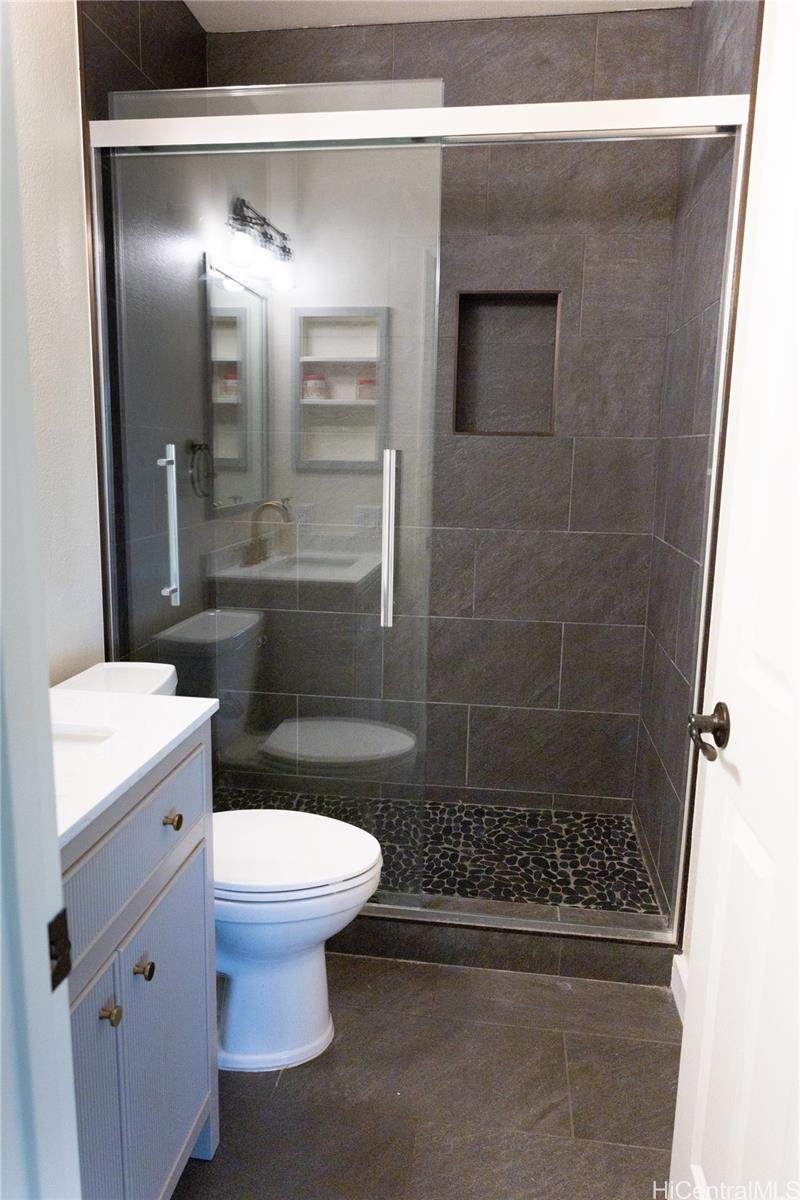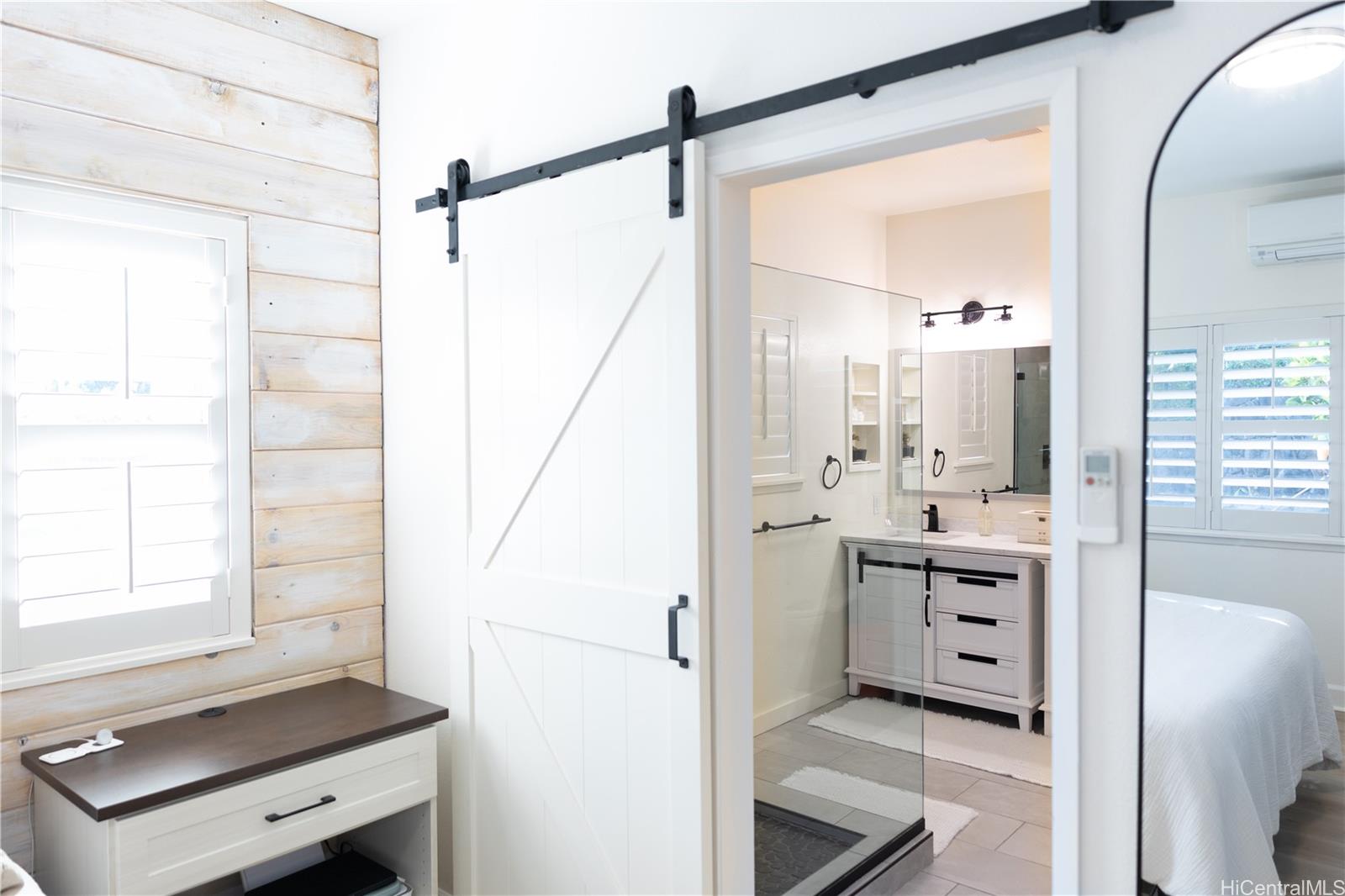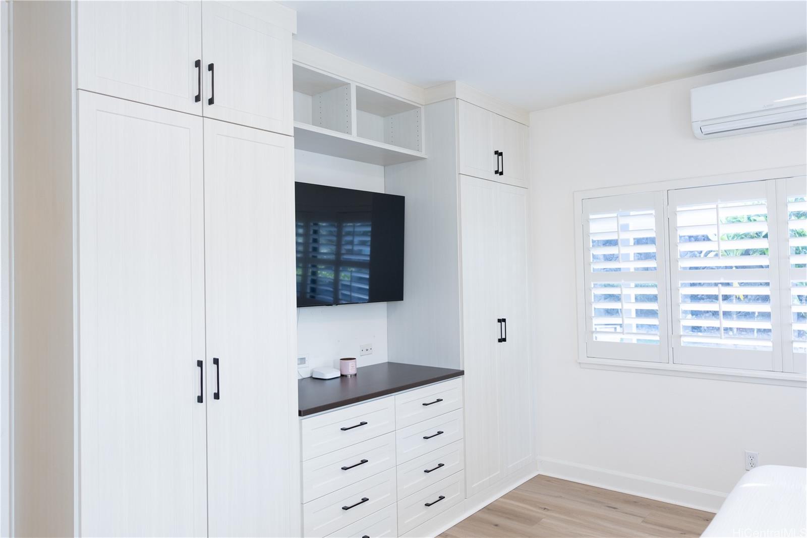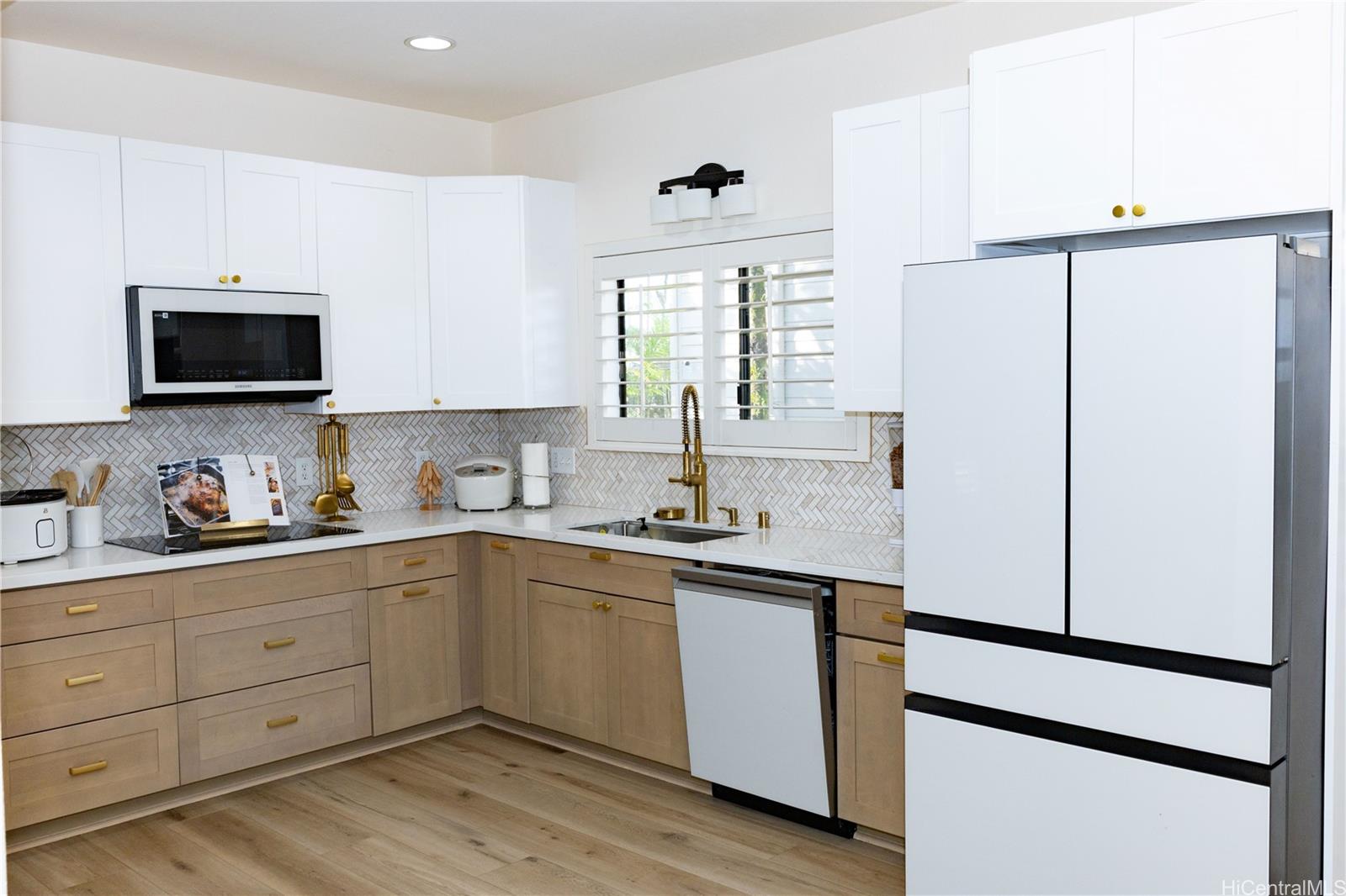 Just a short walk to Mililani Elementary and Middle Schools and Rec Ctr 7. This single story home has a versatile den, tastefully renovated with modern comfort, island charm, with true family living in mind. As you step inside, you're greeted by an elegant dining area and a stunning brand new kitchen - complete with a spacious island, corner coffee bar, and beautiful finishes throughout. The kitchen flows seamlessly into a large family room, highlighted by vaulted ceilings. The den is a thoughtfully designed as a multi-purpose room featuring custom cabinetry and a Murphy bed. Perfect as a home office, laundry room, or guest retreat - flexible space truly adapts to your lifestyle. Down the hallway, you'll find two comfortable bedrooms and a full bathroom with double sinks, ideal for family or guests. The primary suite is a true sanctuary. Custom closets, nightstands, and dressers fill the space with luxury and organization. The ensuite bathroom features a large walk-in shower and dual sinks. Step outside to a spacious, partially covered patio, perfect for entertaining friends, hosting family gatherings, or simply enjoying the cool Mililani breezes.