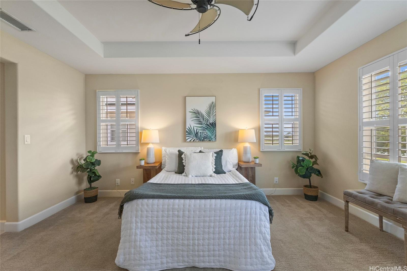 Now with Seller offering $20,000 Credit toward closing! Enjoy golf course views from this island oasis home. Overlooking the fairway of Hoakalei Country Club, this stunning 4 bed, 3 bath home offers an unmatched blend of comfort and island elegance. Its thoughtful design creates a seamless flow between indoor and outdoor living. The heart of the home is a modern, open-concept kitchen outfitted with granite countertops, stainless steel appliances and custom cabinetry. Just outside, the covered lanai leads to lush green space and a patio, featuring built in gas grills. Whether you’re preparing a meal or entertaining friends, this space is as functional as it is beautiful. The bedroom and full bath on the first floor provides convenience and ease of accessibility for guests or extended family. A versatile loft upstairs offers multiple use options — perfect for a home office, playroom, or media space. The primary suite boasts a private balcony with sweeping views of the golf course and Waianae mountain range just across the water, bringing the resort lifestyle right to your backyard.