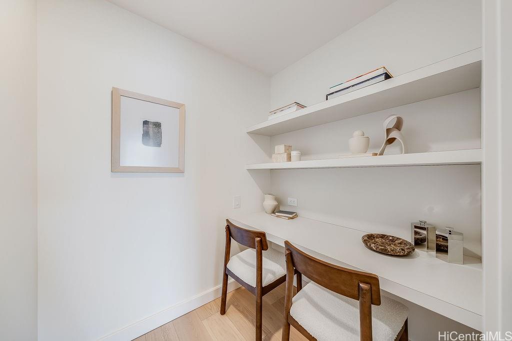 Rarely available 3-bedroom, 3-bathroom unit in the much-desired East-facing ’00 stack of Ward Village’s newest development, Victoria Place. This corner end unit features strong views overlooking the Pacific Ocean, the boat harbor and Diamond Head. Three well-sized bedrooms, an office nook, and a separate laundry room round out this functional living space, which also features custom-designed cabinetry by Studio Becker, Sub-Zero refrigerator, Wolf gas range, oven, and microwave. Victoria Place is a 350-unit luxury development designed by Architect Solomon Cordwell Buenz and placed on the front row of Ward Village. The common areas feature lush, green landscaping by VITA Planning and Landscape Architecture, and the resort-style amenities are in abundance, including a lap pool and lounge pool with ocean views, wine cave, spa, hot and cold plunge pools, fitness center, movie theater, and 24/7 concierge and valet service. This unit comes with two side-by-side parking stalls on the second floor w/an EV-ready 240V electrical outlet, which was installed during construction. No storage unit will be conveyed with this unit sale.
