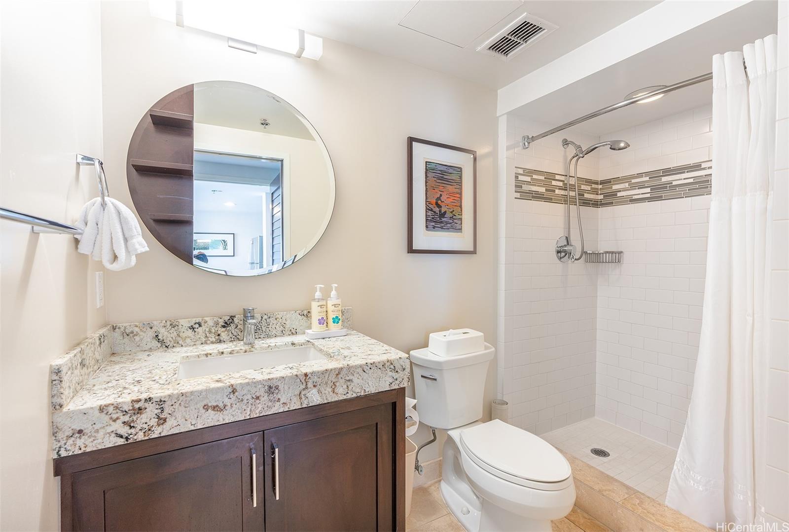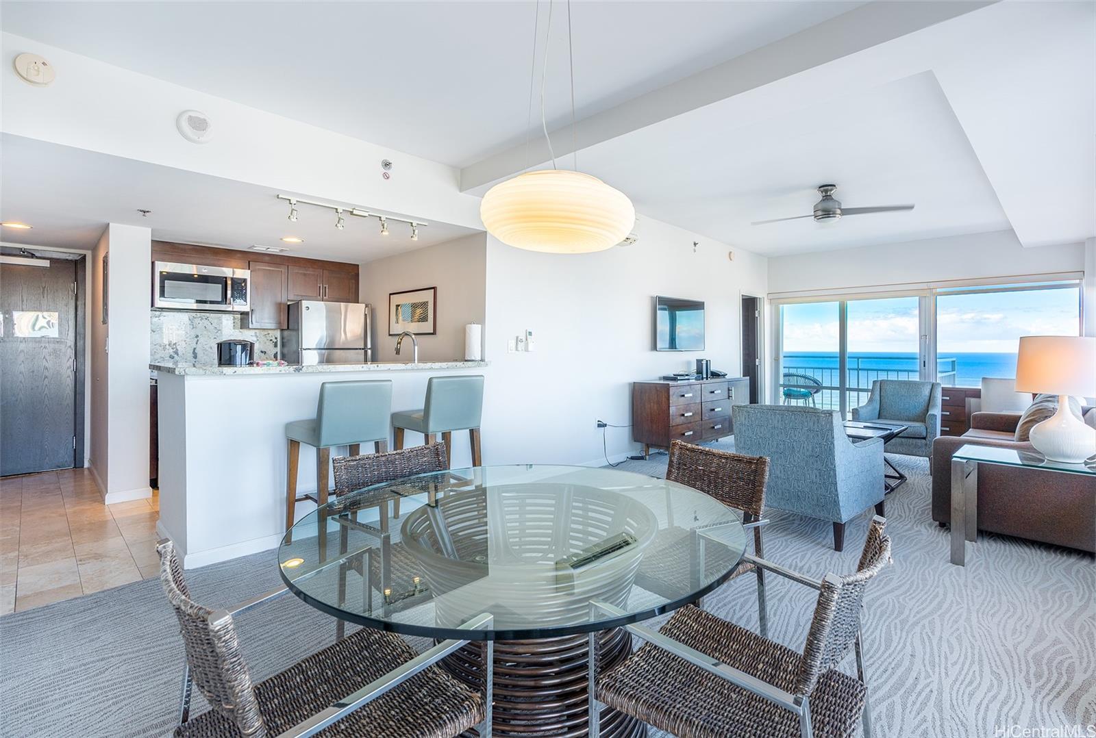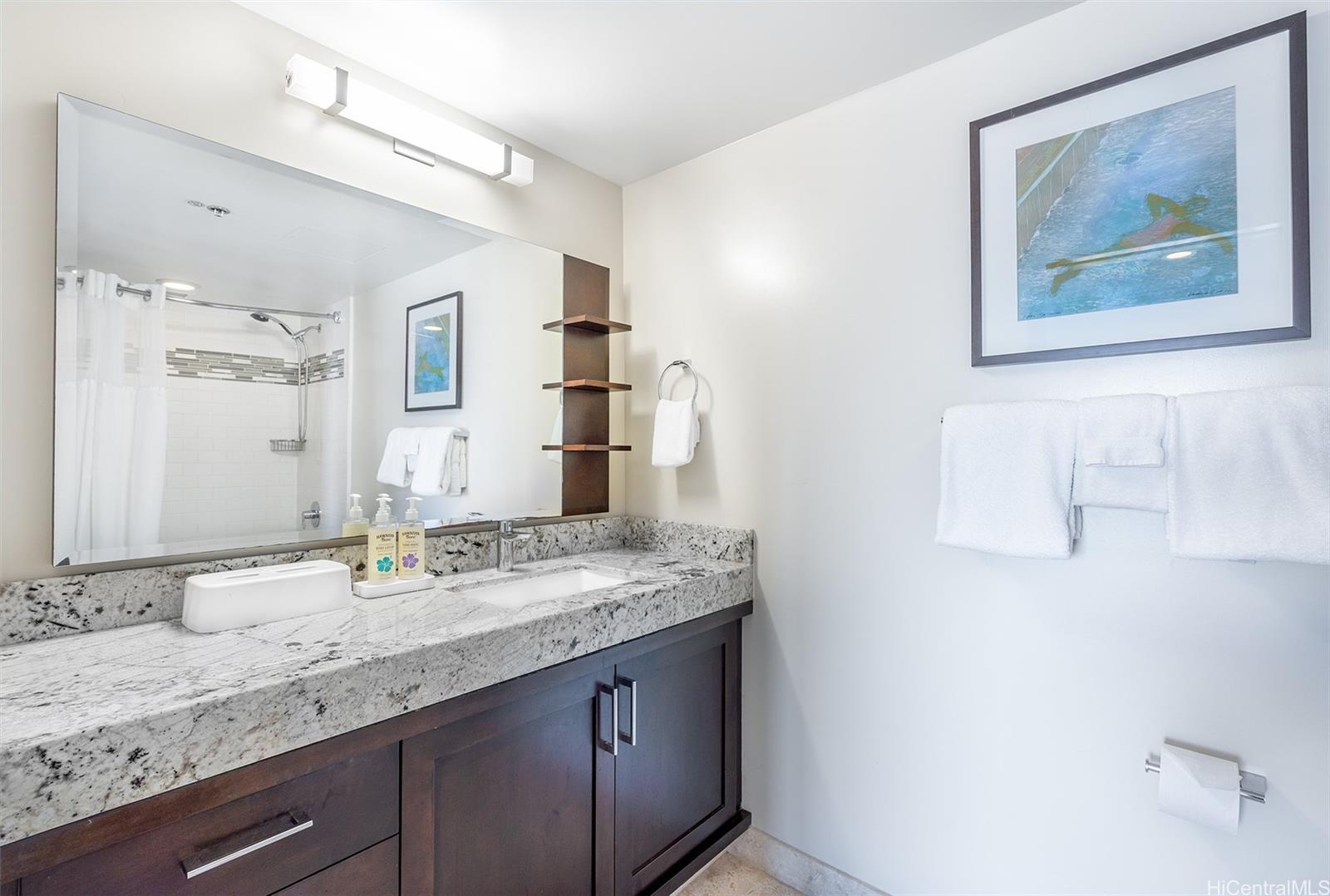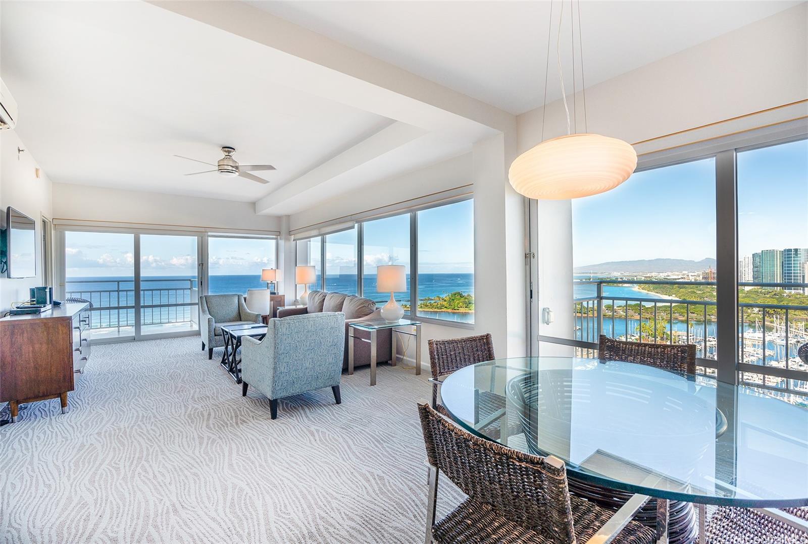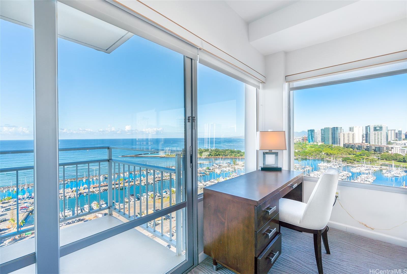 bathroom is preferred at the ocean front-corner unit of the building along the Ocean and Marina side. Unit offers a spacious floor plan with large lanai too. Panoramic views of ocean, marina and beautiful sunset. Fully furnished. Currently in the Aqua-Aston Ilikai Hotel Pool Program. This unit is move in ready or ready to be rented out. Enjoy the Waikiki lifestyle!