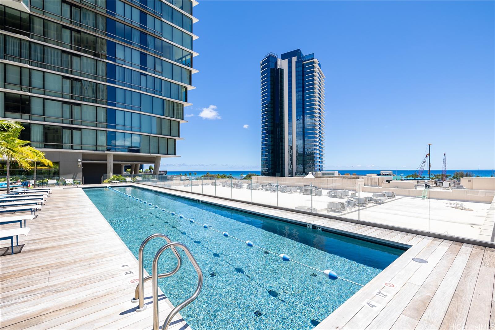 Excellent 1/1 home at Ae'o with ocean, harbor and mountain views! At 739sf, this is the largest 1/1 offered at the lowest price/sf. This must-see unit has premium Bosch stainless steel appliances, spacious bathroom with deep soaking tub, custom built-ins in kitchen and walk-in closet, engineered hardwood floors, floor-to-ceiling windows and bump out window/door for fresh air. Unit also comes with a full size W/D in the extra utility room and one parking stall with a separate storage unit. Resort-like amenities include a 24/7 hosted front desk, rooftop terrace, lap and family pool, fitness center, locker rooms with sauna and steam room, theater, play ground, guest suites, outdoor bbq, dining cabanas. This Ward Village condo features the best of urban lifestyle in paradise with direct access to Whole Foods market, numerous dining and entertainment options, beaches, shopping, Consolidated Theaters, Ala Moana Shopping Center all within a few blocks!
