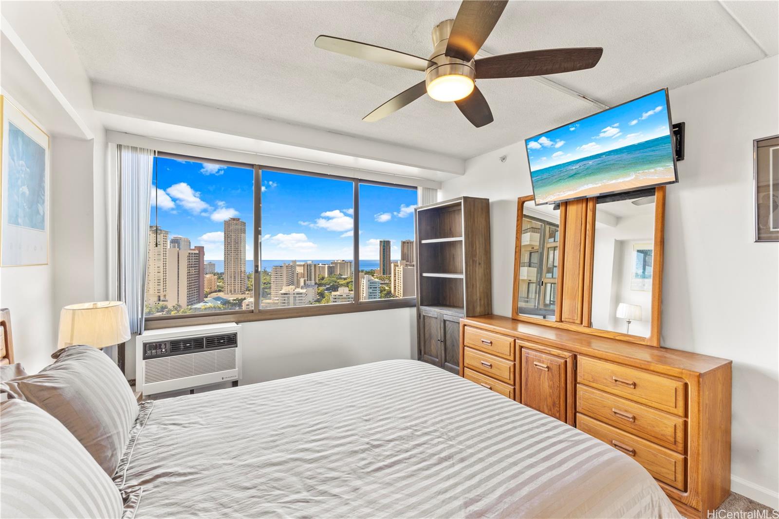 Rarely available high floor ocean view fee simple 2 bedroom/2 bathroom with 2 COVERED SIDE BY SIDE PARKING STALLS! Featuring beautiful ocean, Waikiki and city views. Enjoy the Friday night fireworks and amazing sunsets from your spacious lanai. This upgraded unit offers an open concept kitchen, washer/dryer, extra storage, air conditioning, ceiling fans, newly tinted windows, new refrigerator and much more.