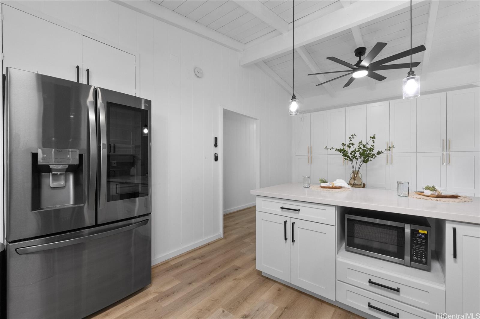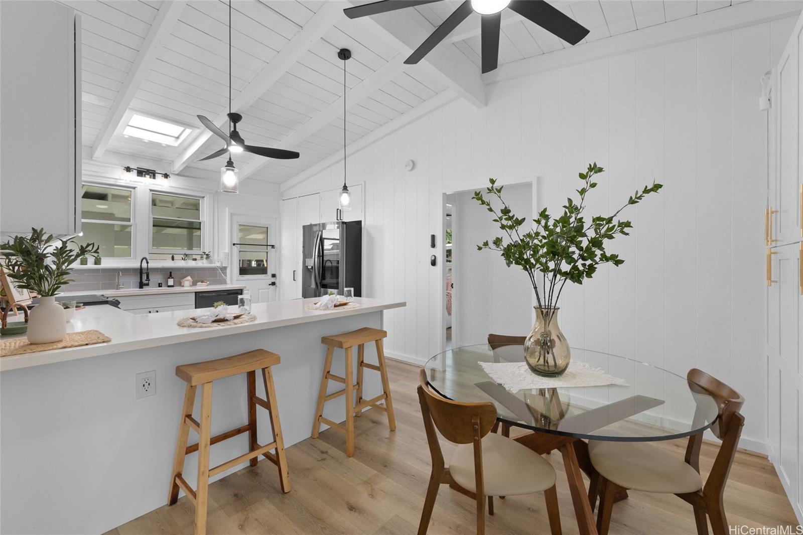 Welcome to a rare Manoa retreat, where the rhythm of valley rains and the shimmer of morning light create the quiet poetry of the valley. Set on an expansive 19,003 sq. ft. parcel embraced by lush surroundings, this traditional Manoa home with vaulted ceilings has been thoughtfully renovated with a 2023 roof, 200-amp electrical, vinyl windows, newer appliances, luxury vinyl flooring, quartz countertops, and abundant storage, offering a refined yet comfortable modern living experience. Outdoors, a serene island sanctuary unfolds along the valley’s natural contours, framed by mature mango, avocado, coconut, and banana trees on the private yard area beyond the valley’s whispering waters. The gentle flow of Manoa stream, resting well below street level with FEMA waiver, provides a peaceful backdrop that feels worlds away. Here, tranquility meets convenience, just moments from UH, parks, cafés, and town amenities; a place where comfort and the calm of the valley come together in timeless harmony.