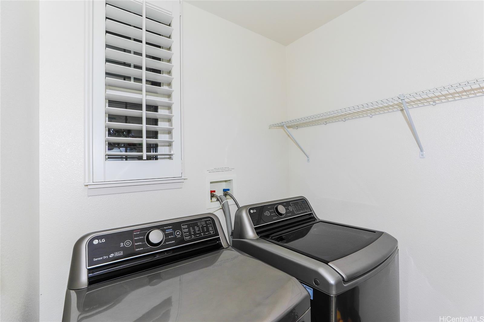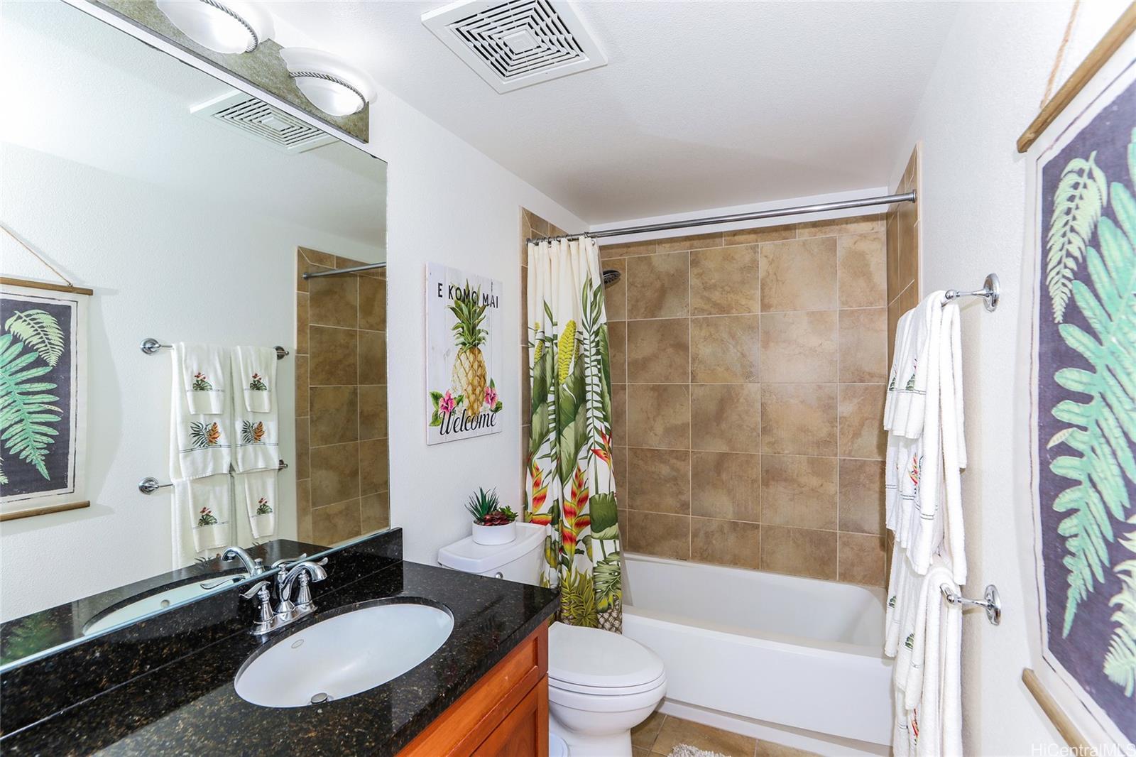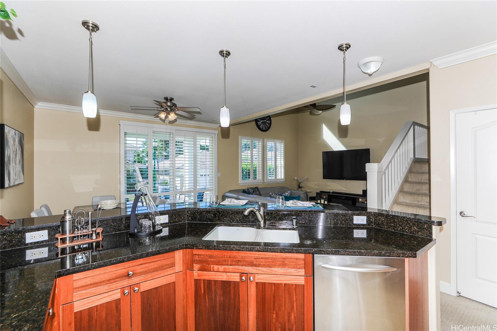 Best-priced 3BR/3BA home, located within the gated Ko Olina Kai Golf Estates community. Ideally located near the open air recreation pavilion, featuring a whirlpool spa & sparkling lagoon pools, covered cabanas w/barbecue grills for an intimate party or picnic. Just a short walk to the beach, golf course, dining, shopping, and world-class Ko Olina Resort amenities. This light-filled, open concept two-story home offers an amazing living room with a high vaulted ceiling which flows into the kitchen w/stainless steel appliances, granite countertops and wood cabinetry. Dining area opens to a private patio overlooking a lush greenbelt—perfect for indoor-outdoor island living. A spacious ground-floor bedroom and full bath offer flexibility, plus a separate laundry room with full-size washer and dryer. Upstairs, the spacious primary suite includes a walk-in shower, soaking tub, double sinks, and private lanai. Plantation shutters throughout and a whole-house water filtration system complete this resort-style residence.