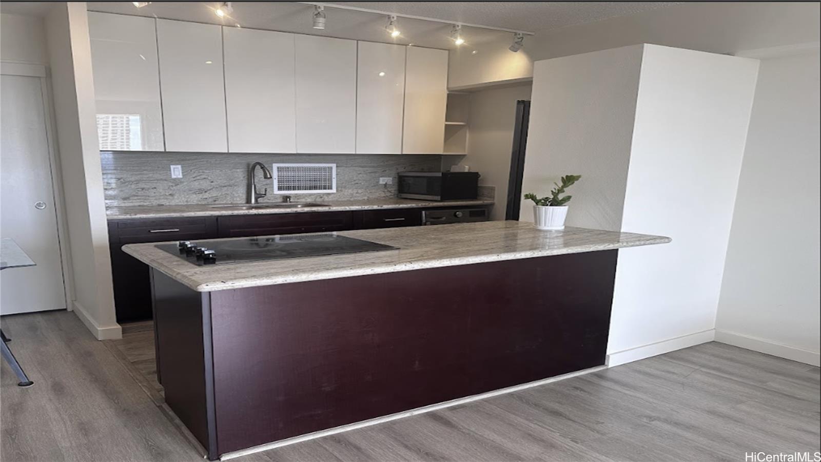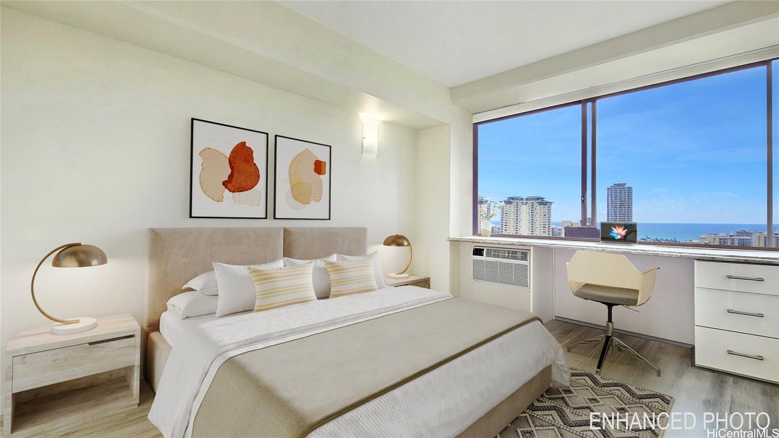 Relax and enjoy a picture-perfect view of the ocean, Ala Wai canal and Waikiki from you lanai! Elegantly remodeled two bedroom and two bath featuring an open concept kitchen with new stainless-steel appliance and granite countertops, a custom-made granite desk in each room, a new living room window A/C, beautiful grayish modern style flooring throughout the unit, with covered assigned parking stall and storage and more. Nice, welcoming lobby entrance and sitting area surrounded by serene and tranquil private gardens for your guests. Resort-like amenities include pool, sauna, tennis and basketball/pickleball courts, 6 BBQ area, bicycle/surfboard room, car wash area, and convenience store in the lobby. This well-maintained building features fire sprinkler/alarm system and 24-hoursecurity, lots of guest parking stall, and 100% Hurricane coverage. Additionally, a plumbing project in the bathrooms has just been finished. Close to Waikiki beaches, Ala Moana Shopping Center, restaurants, and the University of Hawaii, Exceptional opportunity to own this beautiful unit. Make it your today.