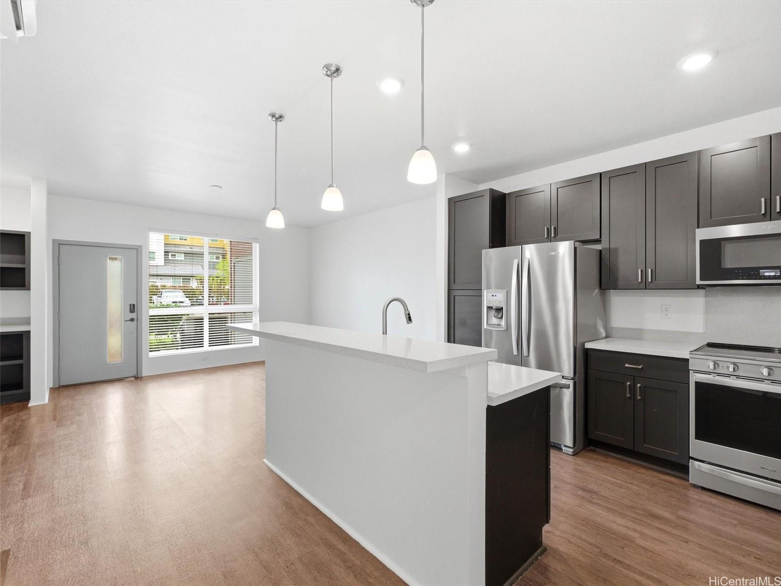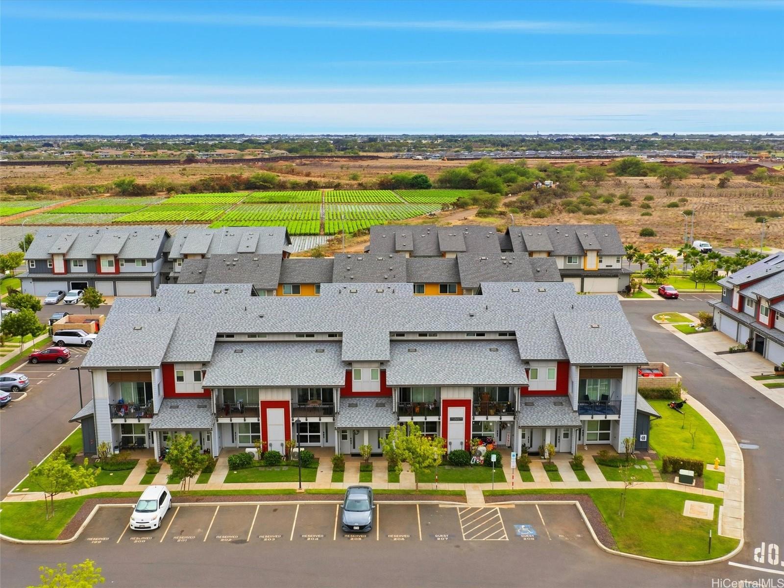 652 interior square feet of comfortable living space. The spacious bedroom opens directly to a private, fenced backyard, providing added privacy and functional outdoor space. The open living and kitchen layout is efficient for everyday living. The unit includes two assigned parking stalls, an uncommon feature for a one-bedroom. Ideally located within walking distance to Ho‘opili’s parks, playgrounds, community pool, Local Joe’s Coffee, and Sage Creamery, with convenient proximity to freeway access for an easy commute. This home delivers ground-floor convenience, walkability, and accessibility in a community where opportunities like this are limited.