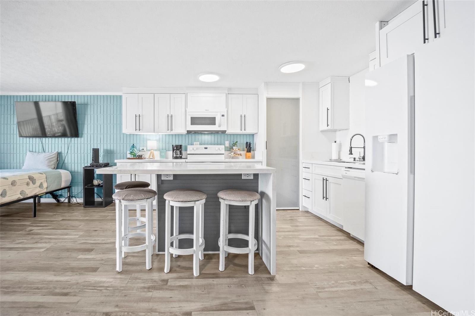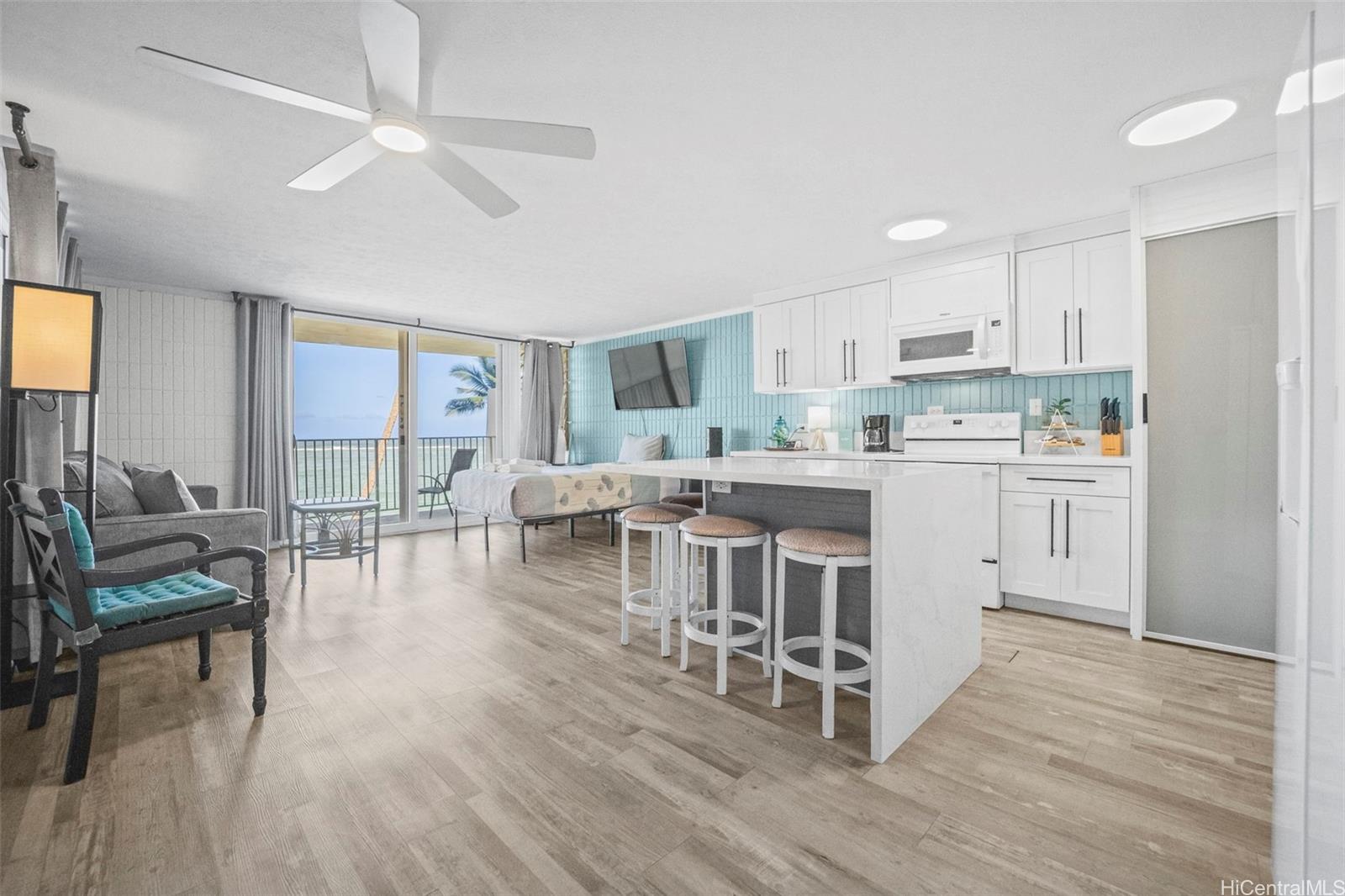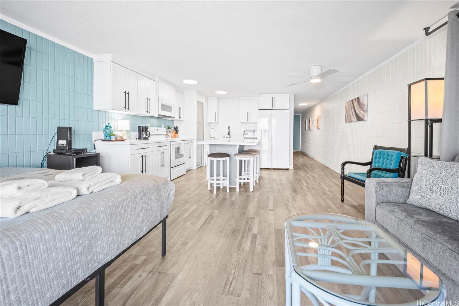 This unit offers more interior living space and a larger lanai than most 1-bedroom units in the complex, providing a bright and open layout. Fully renovated in 2023, upgrades include furnishings, appliances, cabinetry, and modern finishes throughout. The unit includes one assigned parking stall. The oceanfront community features resort-style amenities including a swimming pool, fitness center, BBQ area, and direct beach access. The unit is currently operated as a short-term rental. Buyers are advised to perform their own due diligence regarding zoning, use, permitting, and applicable regulations. The building is in the last expected year of a multi-year renovation expected to be completed end of 2026. HOA fees beginning January 2026 are $1,598 per month, with a 2026 renovation construction assessment of $2,238 per month.