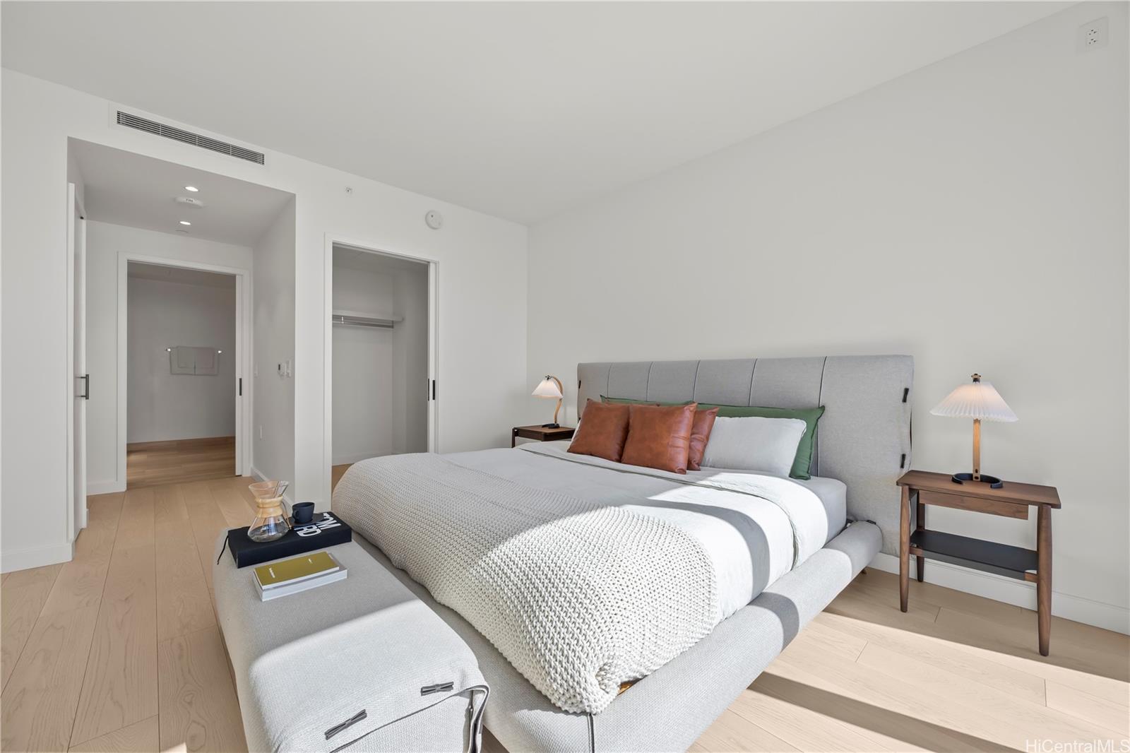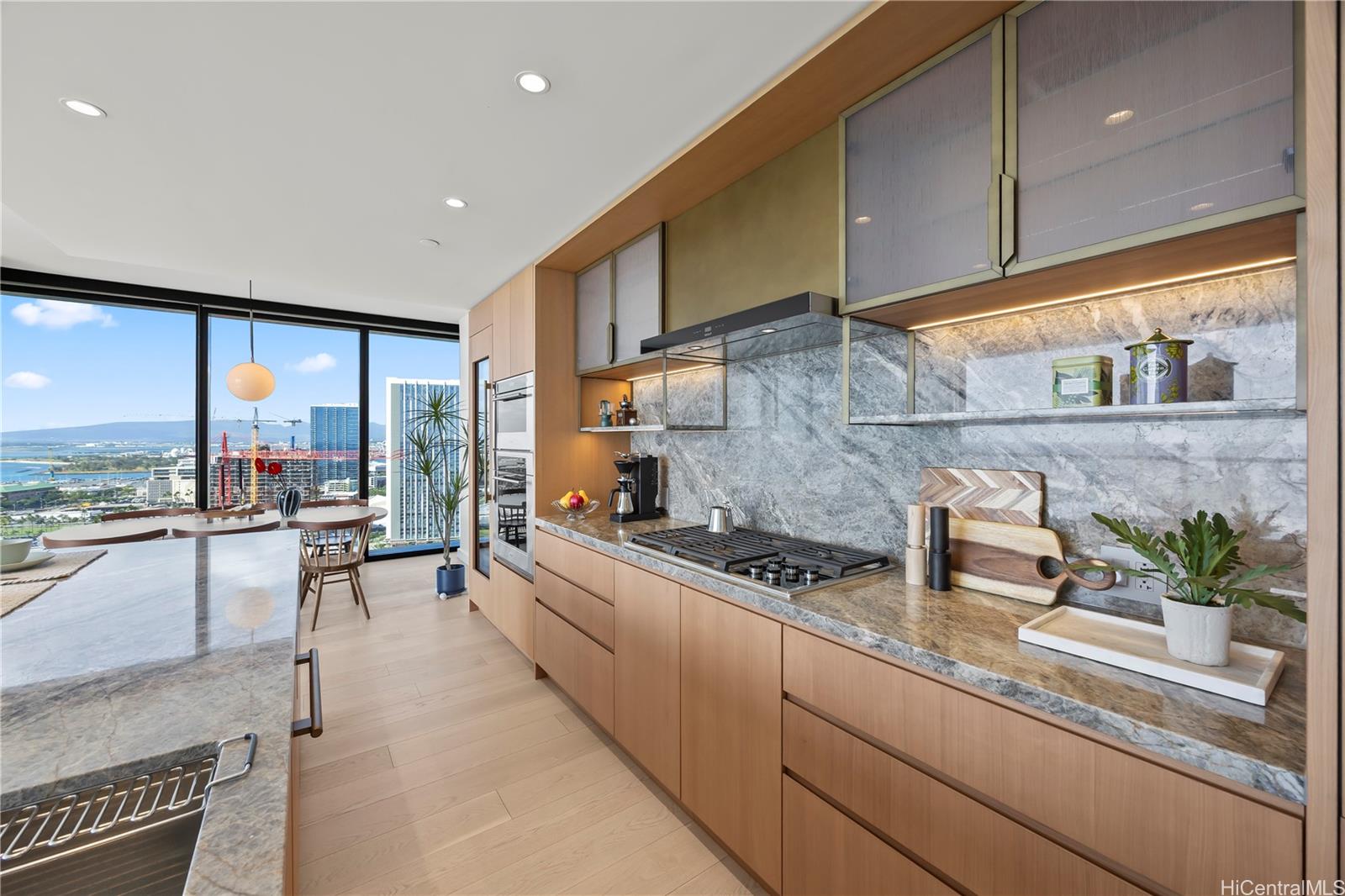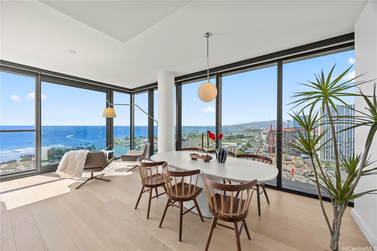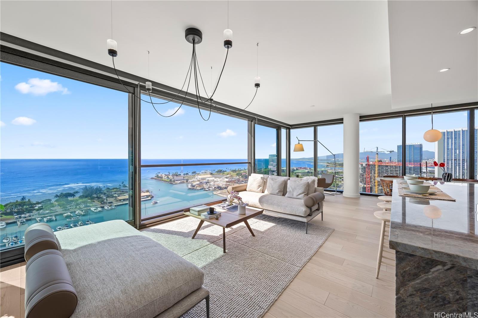 Welcome to an unparalleled sanctuary of sophisticated living in the highly coveted '01' stack at Victoria Place. As the most premier front-row residence in Ward Village, this exquisite home offers forever-unobstructed, panoramic of the Pacific Ocean, Kewalo Basin Harbor.